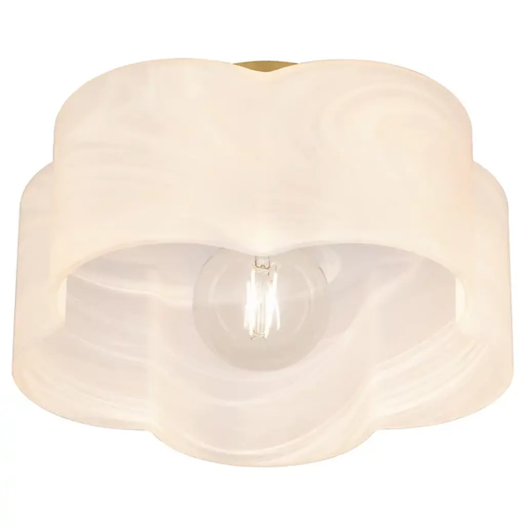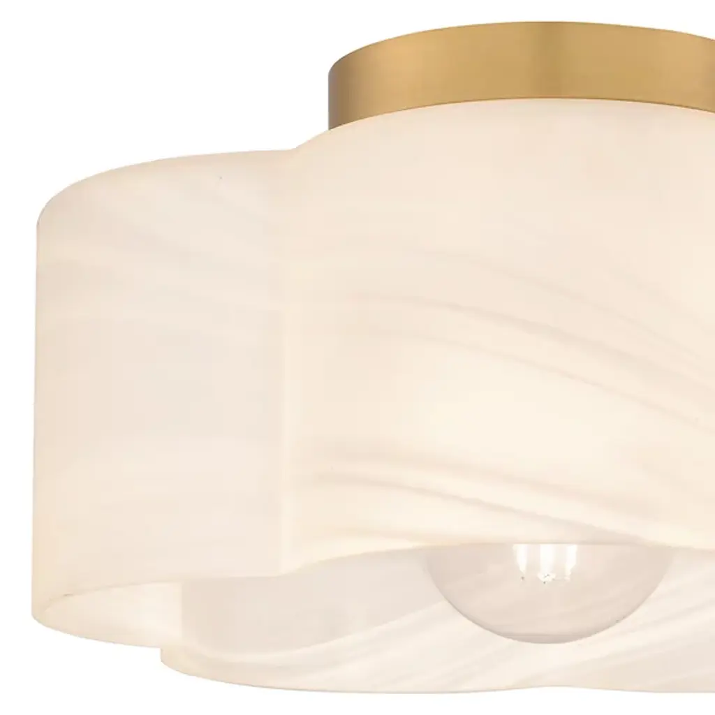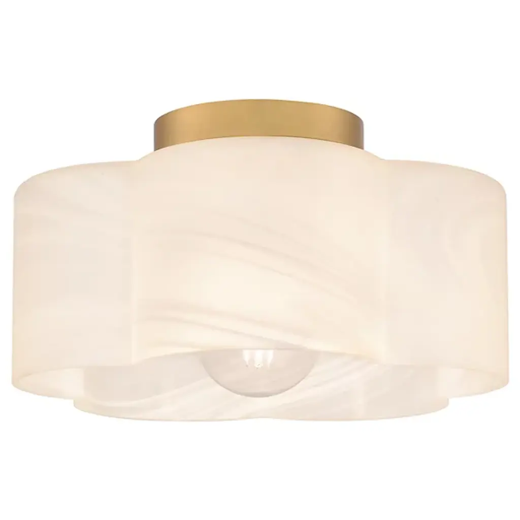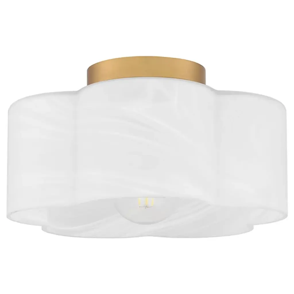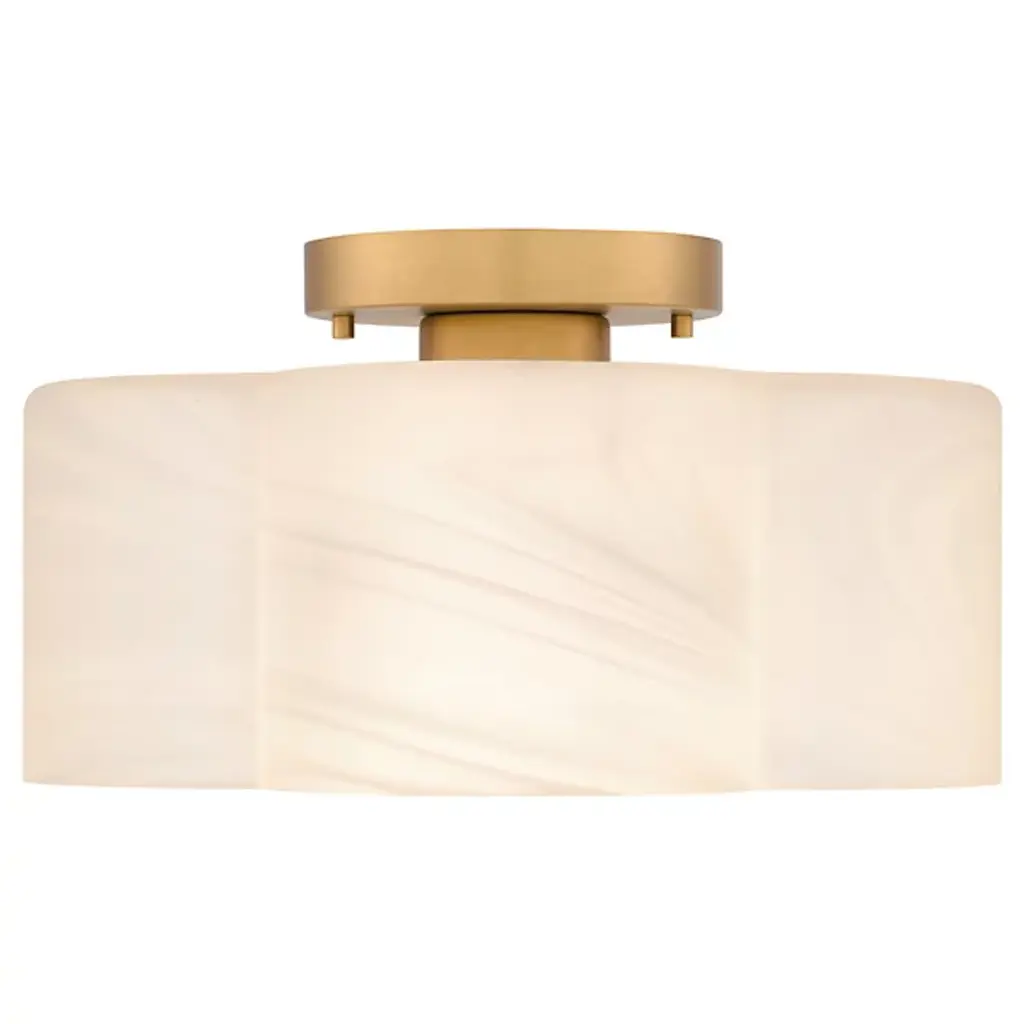 The Quoizel Lilly Semi Flushmount is a modern piece that effortlessly merges simplicity with a touch of feminine beauty. Inspired by the delicate silhouette of flower petals, this luminaire features a smooth, steel construction in a brushed weathered brass finish. The alabaster glass shade creates a soft, indulgent glow, transforming bathrooms, foyers, and hallways into tranquil retreats. The Lilly Semi Flushmount’s versatile design is built to last, offering a clean, polished look that will endure the test of time.