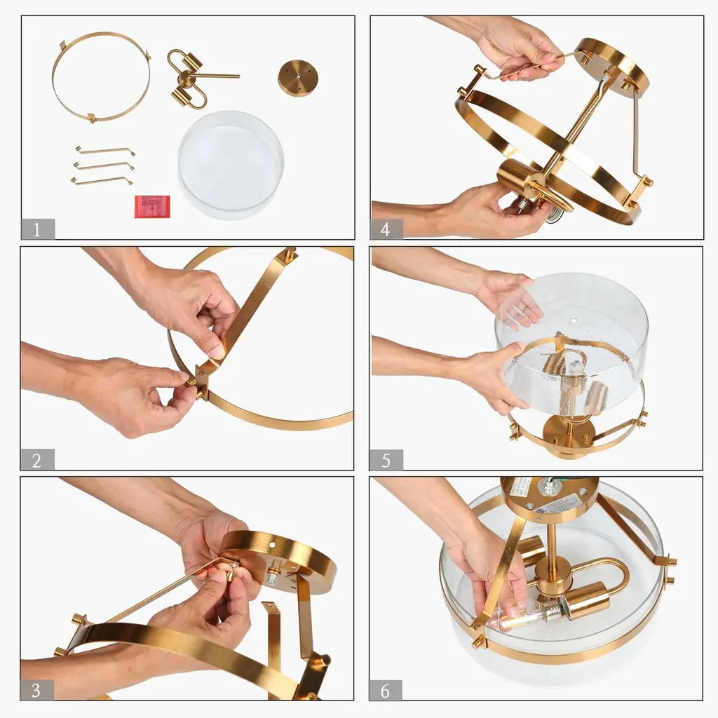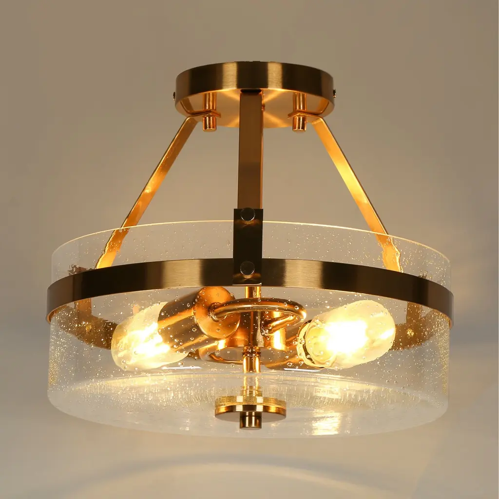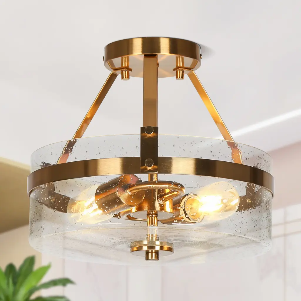 Features a simplistic design that a bowl glass shade with a gold belt decorated, this electroplated brass gold finish semi-flush ceiling light fixture is the perfect addition to any room like a bedroom, dining room, kitchen, or hallway.Click to see Liniya Collection Lighting | OverstockFeatures:Material: Metal, seeded glassMetal Finish: Electroplate brassLight Fixture: D 12" x H 10"Canopy: D4.7'' x H1''Weight: 4.9 lbsStyle: Modern/ Farmhouse/ Industrial/ TransitionalWarranty: 1 yearBulb: 2* Type A, Max 60W, E12 (Not included)Bulb Type: Edison/ / LED (Recommend CA10,B10,B11)Compatible with dimmable bulbs/ switches