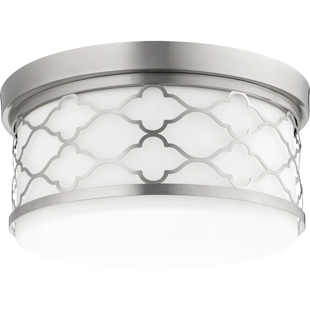 Collection: Arabesque, Material: Steel, Finish Color: Brushed Nickel, Width: 15.25", Height: 10.75", Lamping Type: Incandescent, Number Of Bulbs: 3, Wattage: 40 Watts, Moisture Rating: Dry Rated, Desc: Our Arabesque three light semi flush mount will add refined style and a hint of mystery to your decor. The off-white fabric hardback shade creates a warm illumination, while the light brings to life the intricate soft gold cutout pattern. Canopy Included: Yes / Shade Included: Yes / Canopy Diameter: 4.75. ,