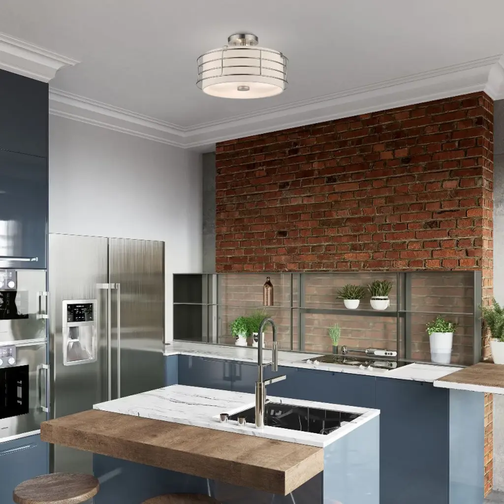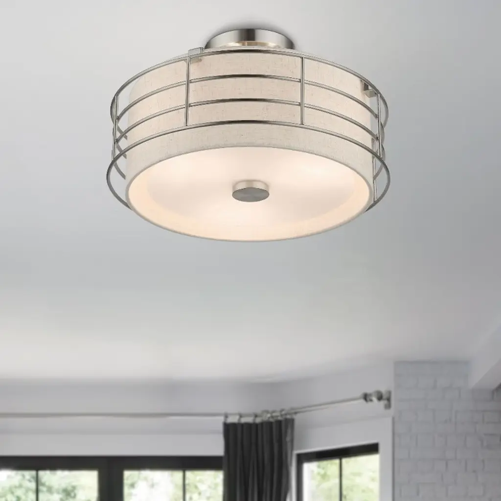 Collection: Blanchard, Material: Steel, Finish Color: Brushed Nickel, Width: 15", Height: 8.75", Lamping Type: Incandescent, Number Of Bulbs: 3, Wattage: 60 Watts, Moisture Rating: Dry Rated, Desc: The Blanchard semi-flush mount adds refined style and a hint of mystery to your d�cor. The antique brass finish and an oatmeal handcrafted hardback shade create warm illumination, while soft light brings to life the intricate fretwork pattern. This medium three-light semi flush mount will add a sophisticated and glamorous look to almost any interior design style. It will work great in the living room, hallway, over the dining or kitchen table and the bedroom.,