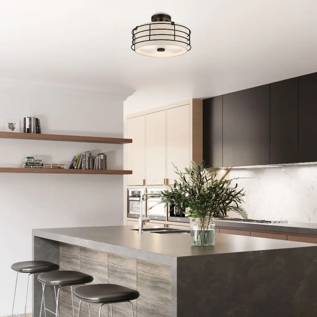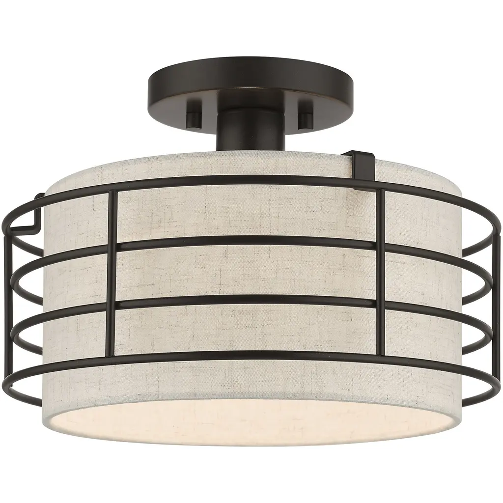 Collection: Blanchard, Material: Steel, Finish Color: English Bronze, Width: 15", Height: 8.75", Lamping Type: Incandescent, Number Of Bulbs: 3, Wattage: 60 Watts, Moisture Rating: Dry Rated, Desc: The Blanchard semi-flush mount adds refined style and a hint of mystery to your d�cor. The antique brass finish and an oatmeal handcrafted hardback shade create warm illumination, while soft light brings to life the intricate fretwork pattern. This medium three-light semi flush mount will add a sophisticated and glamorous look to almost any interior design style. It will work great in the living room, hallway, over the dining or kitchen table and the bedroom.,
