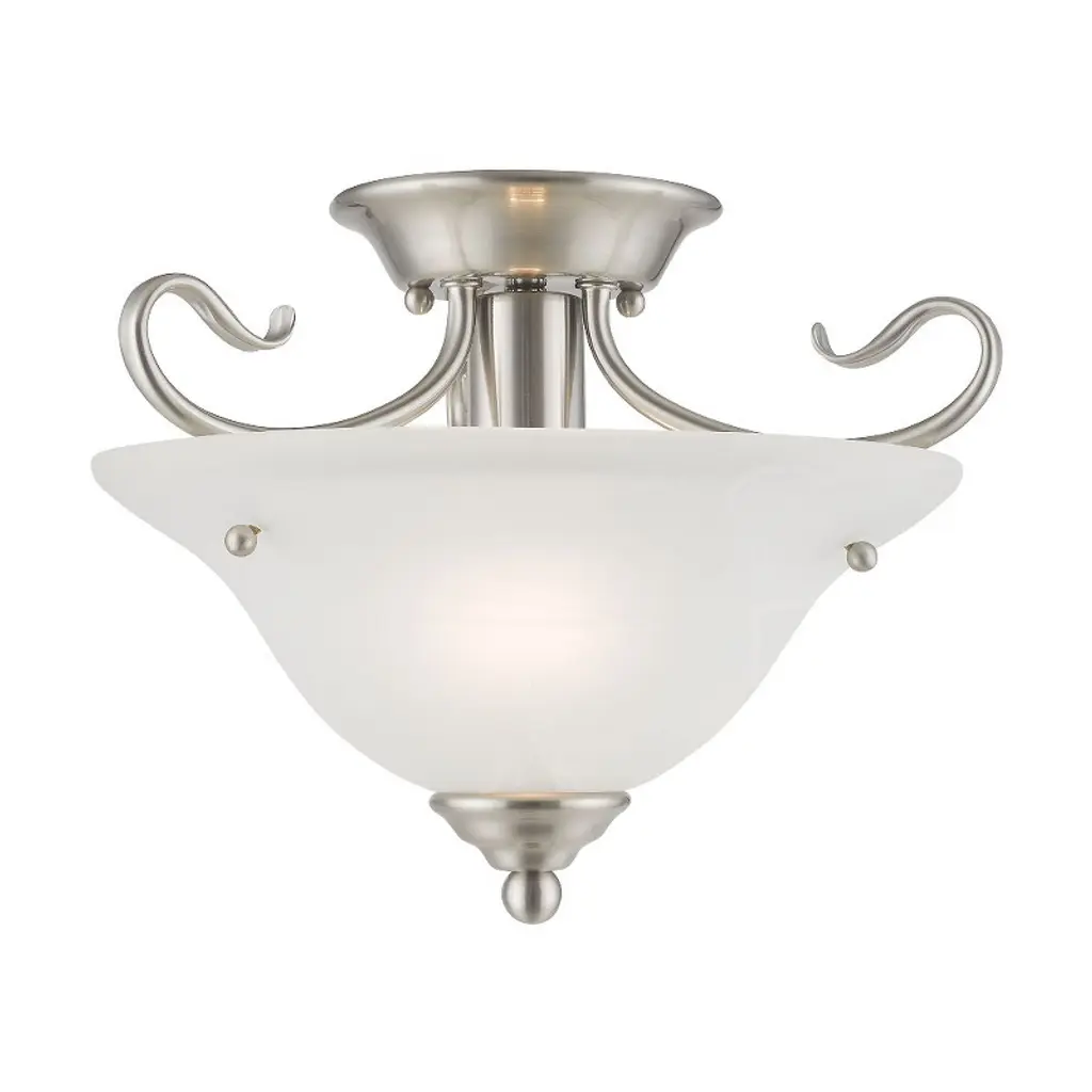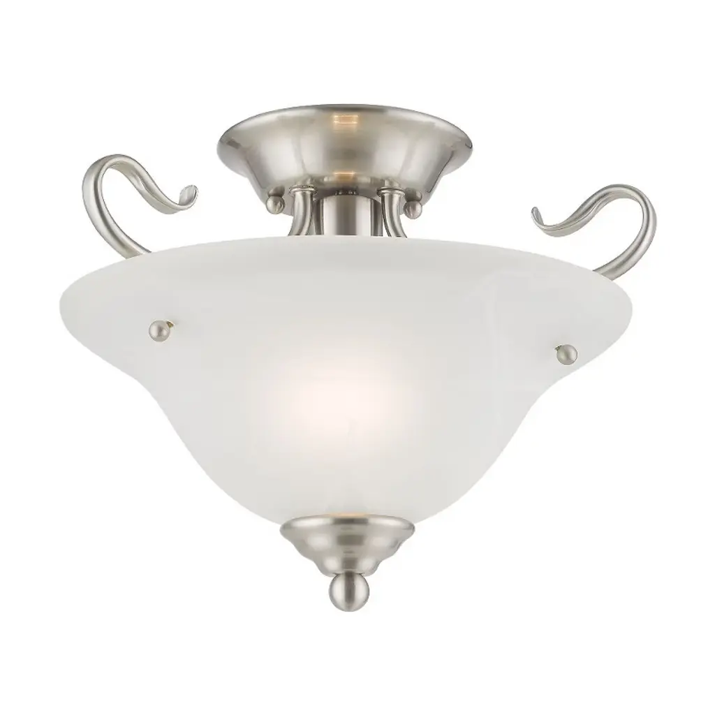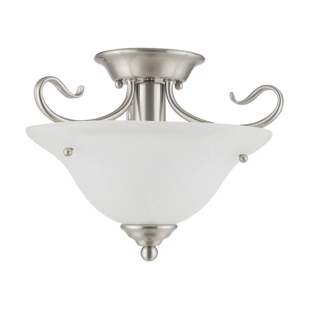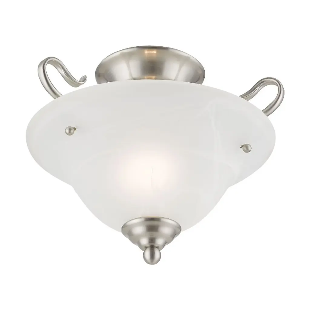 Collection: Coronado, Material: Steel, Finish Color: Brushed Nickel, Width: 13", Height: 9.25", Lamping Type: Incandescent, Number Of Bulbs: 1, Wattage: 100 Watts, Moisture Rating: Damp Rated, Desc: Classic polished brass one light semi flush mount paired with white alabaster glass. Timeless in its vintage appeal, this light is stylish for both new and restored homes. Canopy Included: Yes / Shade Included: Yes / Canopy Diameter: 5.00. ,