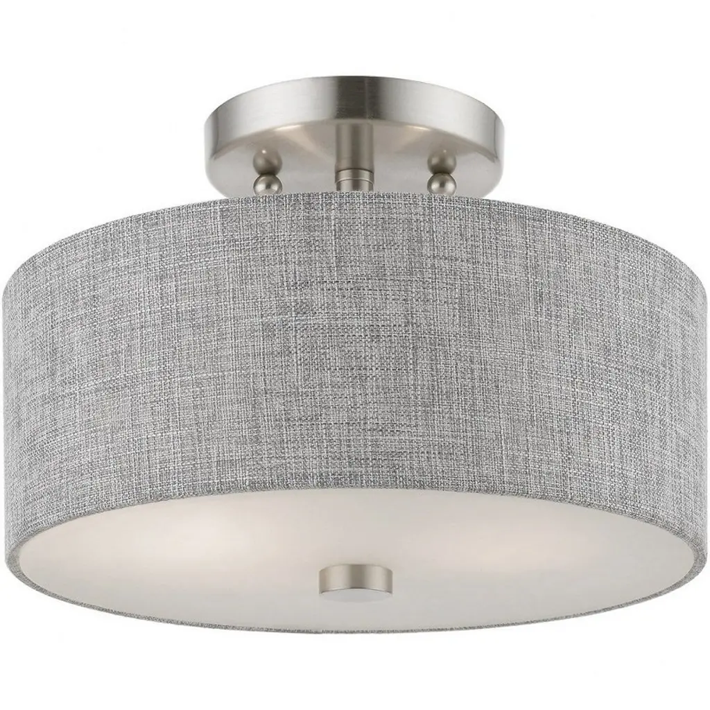 Collection: Dakota, Material: Steel, Finish Color: Brushed Nickel/Shiny White, Width: 11", Height: 7.5", Lamping Type: Incandescent, Number Of Bulbs: 2, Wattage: 40 Watts, Moisture Rating: Dry Rated, Desc: This two light semi flush from the Dakota collection has a clean, crisp look and contemporary appeal while offering antiquate light. The sleek design features a brushed nickel finish with shiny white finish accents. The hand crafted urban gray fabric hardback shade with white color fabric on the inside offers warm light for your surroundings.,