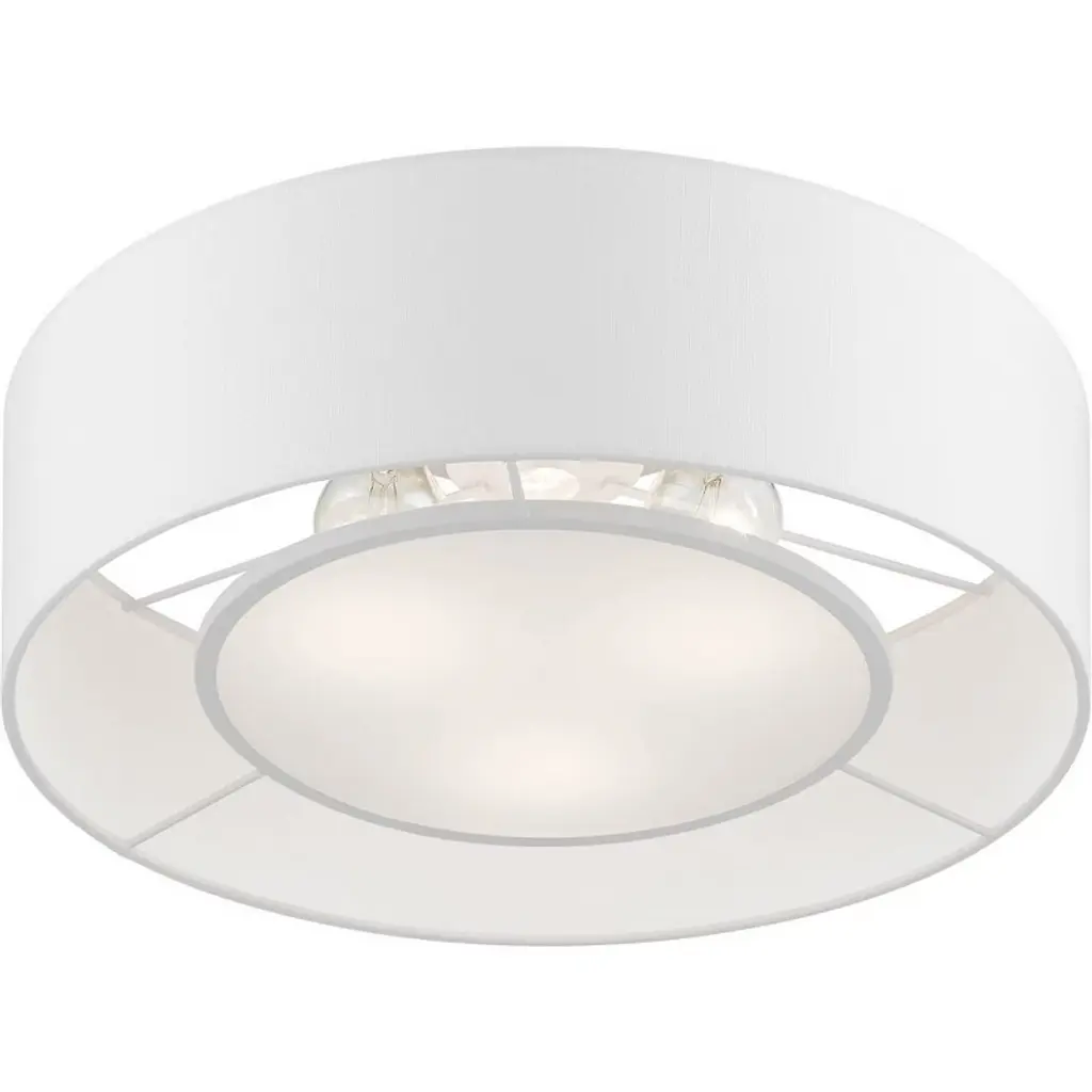 Collection: Gilmore, Material: Steel, Finish Color: Brushed Nickel/Shiny White, Width: 17", Height: 7.75", Lamping Type: Incandescent, Number Of Bulbs: 3, Wattage: 40 Watts, Moisture Rating: Dry Rated, Desc: Add style to any room with this elegant Gilmore semi flush mount. The design features a beautiful hand crafted off-white fabric hardback drum shade in a stylish brushed nickel finish.,