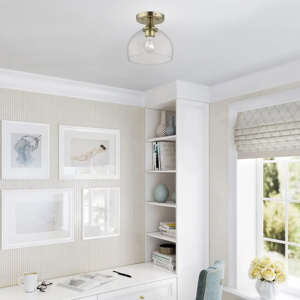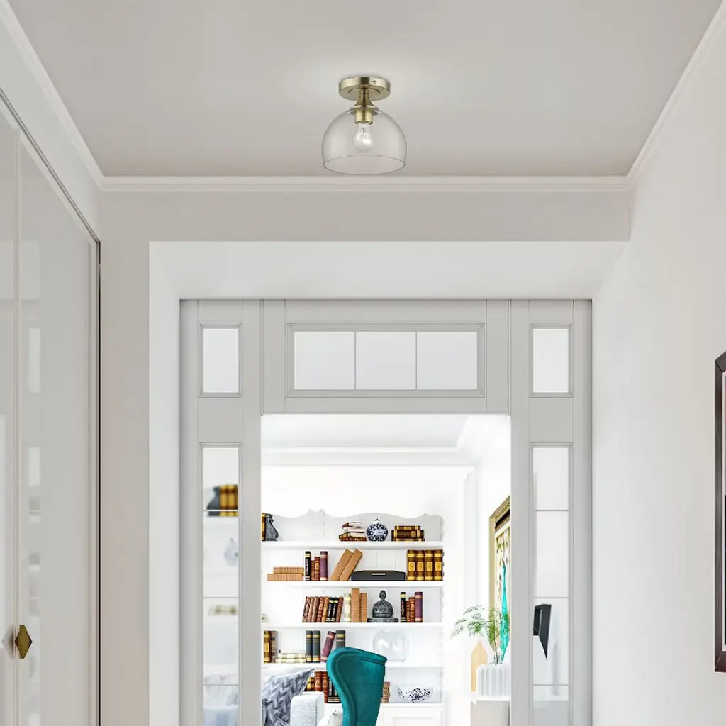 Collection: Glendon, Material: Steel, Finish Color: Antique Brass, Width: 8.25", Height: 8", Lamping Type: Incandescent, Number Of Bulbs: 1, Wattage: 60 Watts, Moisture Rating: Dry Rated, Desc: This one light semi-flush mount from the Glendon collection has understated elegance. It features minimal details, clear curved glass with an antique brass finish and can fit into any decor.,