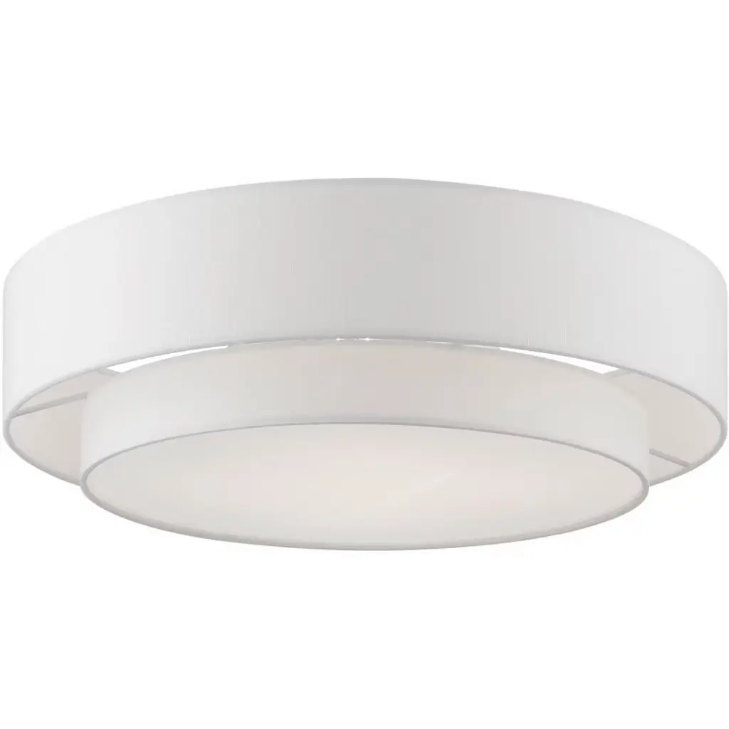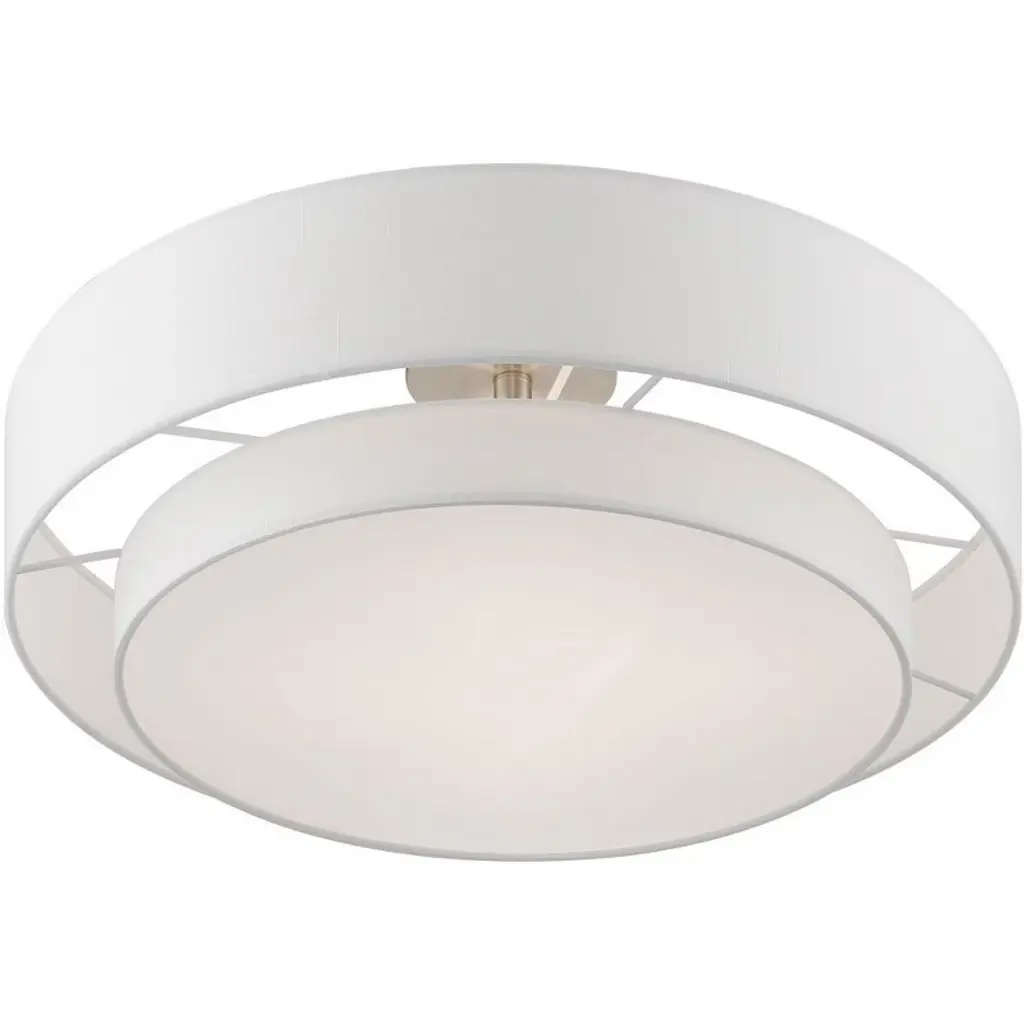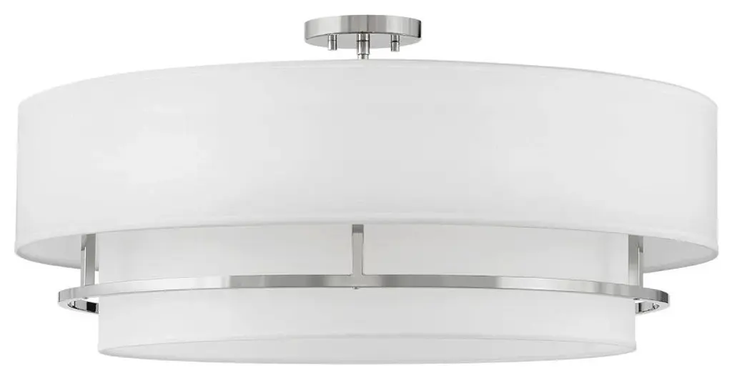 Collection: Meridian, Material: Steel, Finish Color: Brushed Nickel, Width: 22", Height: 9", Lamping Type: Incandescent, Number Of Bulbs: 4, Wattage: 40 Watts, Moisture Rating: Dry Rated, Desc: The sleek style and simple design of this Meridian semi flush mount makes it easy to use in any space. The double hand crafted off white fabric hardback fabric drum shade and bottom satin white acrylic diffuser blend for a clean look.,