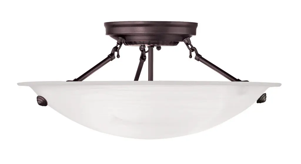 Collection: Newburgh, Material: Glass, Finish Color: Bronze, Width: 16", Height: 7", Lamping Type: Incandescent, Number Of Bulbs: 3, Wattage: 75 Watts, Moisture Rating: Dry Rated, Desc: This three light semi flush mount features a lustrous antique brass finish with light glowing from within the large white alabaster glass bowl shape shade. complete a kitchen, bedroom, or any room in your house with this beautiful semi flush mount. Canopy Included: Yes / Canopy Diameter: 4.75 / Shade Included: Yes / Shade Dimensions: 16 x 3.5. ,
