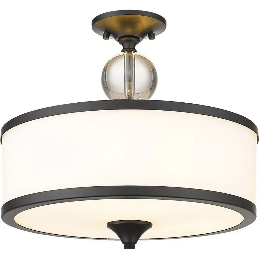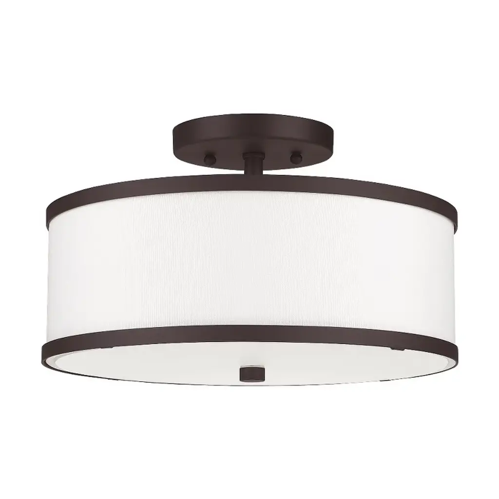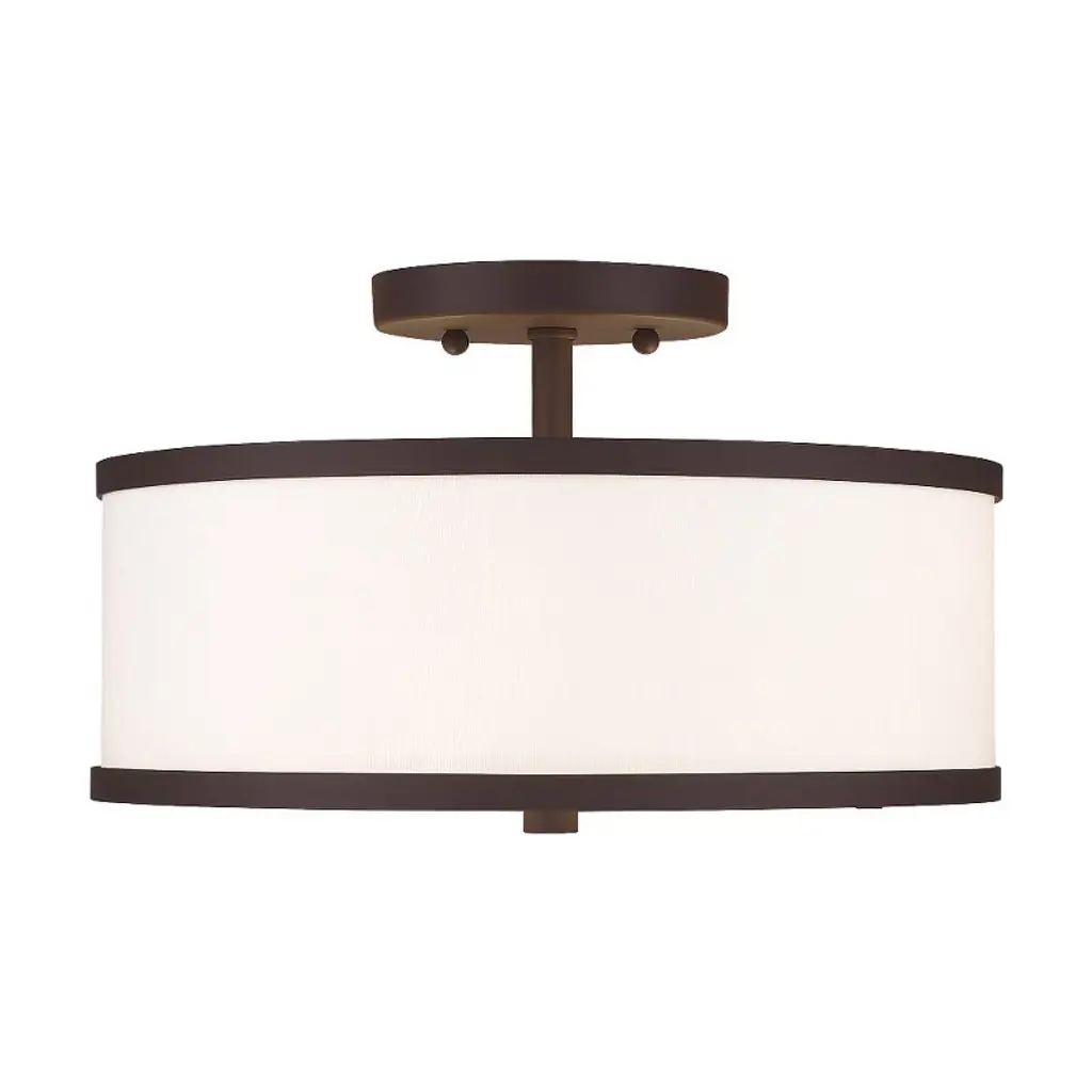 Collection: Park Ridge, Material: Steel, Finish Color: Bronze, Width: 13", Height: 8", Lamping Type: Incandescent, Number Of Bulbs: 2, Wattage: 60 Watts, Moisture Rating: Dry Rated, Desc: Update your decor with this sleek semi flush mount design. The shaded frame comes in a bronze finish which nicely complements the hand crafted off-white fabric hardback shade. Canopy Included: Yes / Shade Included: Yes / Canopy Diameter: 5.00. ,