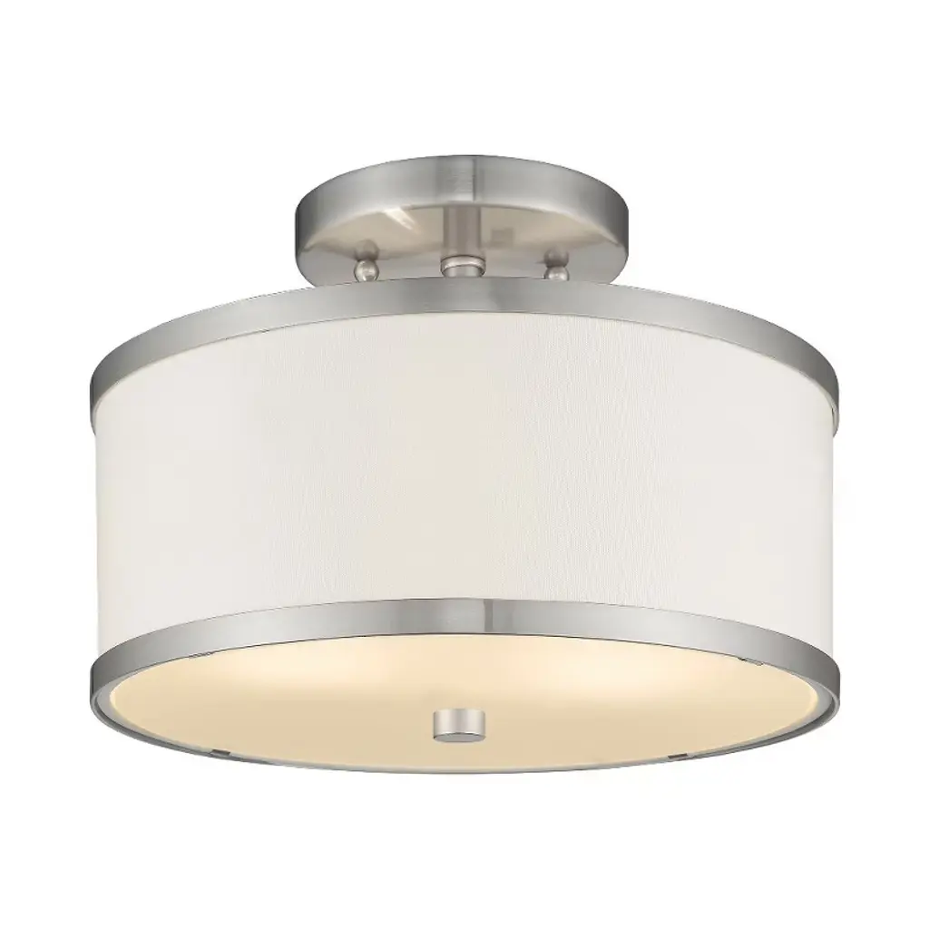Collection: Park Ridge, Material: Steel, Finish Color: Brushed Nickel, Width: 11", Height: 8", Lamping Type: Incandescent, Number Of Bulbs: 2, Wattage: 40 Watts, Moisture Rating: Dry Rated, Desc: Update your decor with this sleek semi flush mount design. The shaded frame comes in a bronze finish which nicely complements the hand crafted off-white fabric hardback shade. Canopy Included: Yes / Shade Included: Yes / Canopy Diameter: 5.00. ,