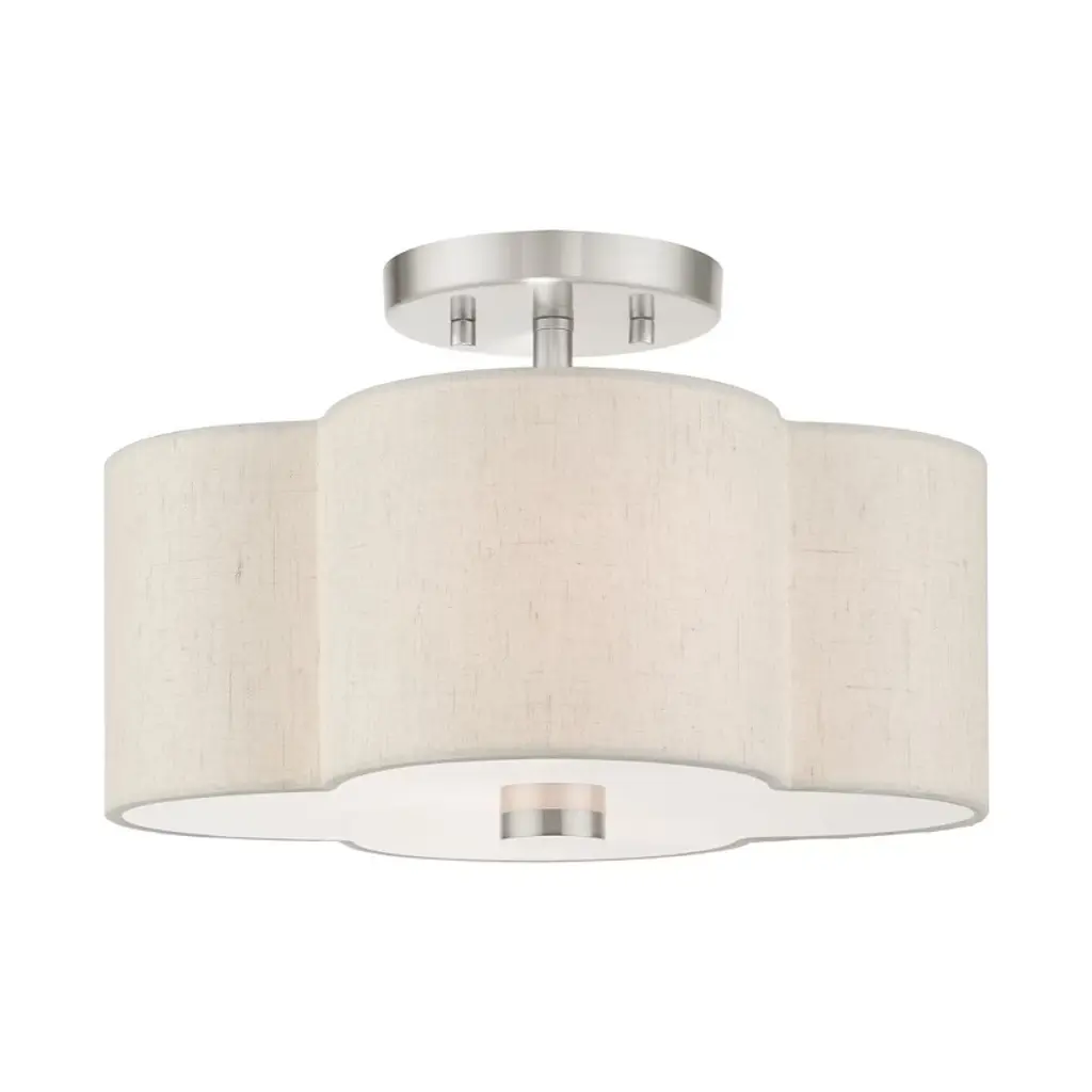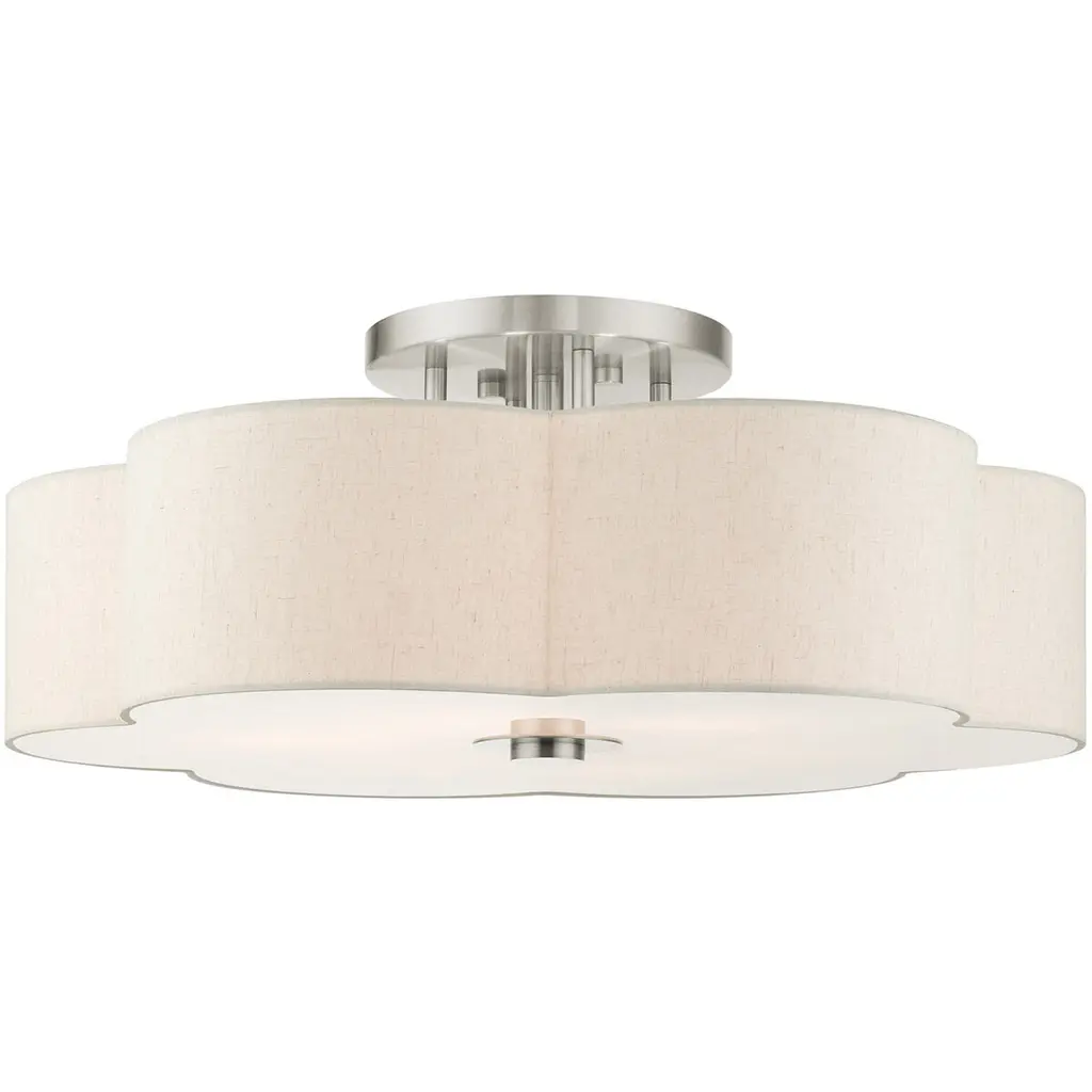 Collection: Solstice, Material: Steel, Finish Color: Brushed Nickel, Width: 22", Height: 9", Lamping Type: Incandescent, Number Of Bulbs: 5, Wattage: 60 Watts, Moisture Rating: Dry Rated, Desc: The Solstice series evokes a French country chic vibe. This extra-large five-light semi flush features a beautiful hand crafted scalloped shaped oatmeal colored hardback shade and is shown in a brushed nickel finish. Perfect finishing touch for a traditiol, transitiol or contemporary style interior. Enjoy this design in the living room, bedroom or dining room. Canopy Included: Yes / Shade Included: Yes / Canopy Diameter: 5.13 x 0.75. ,