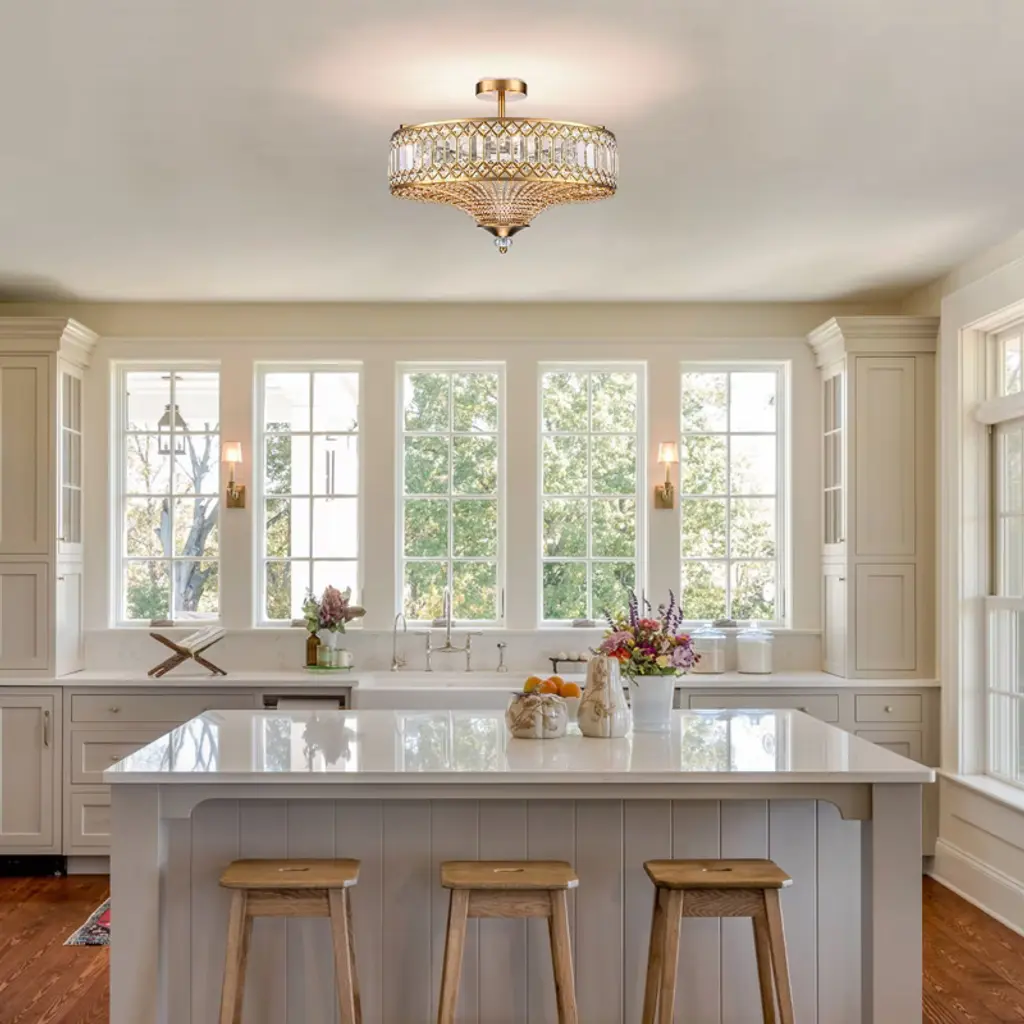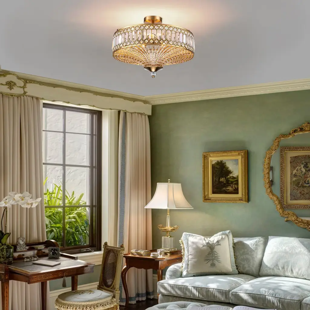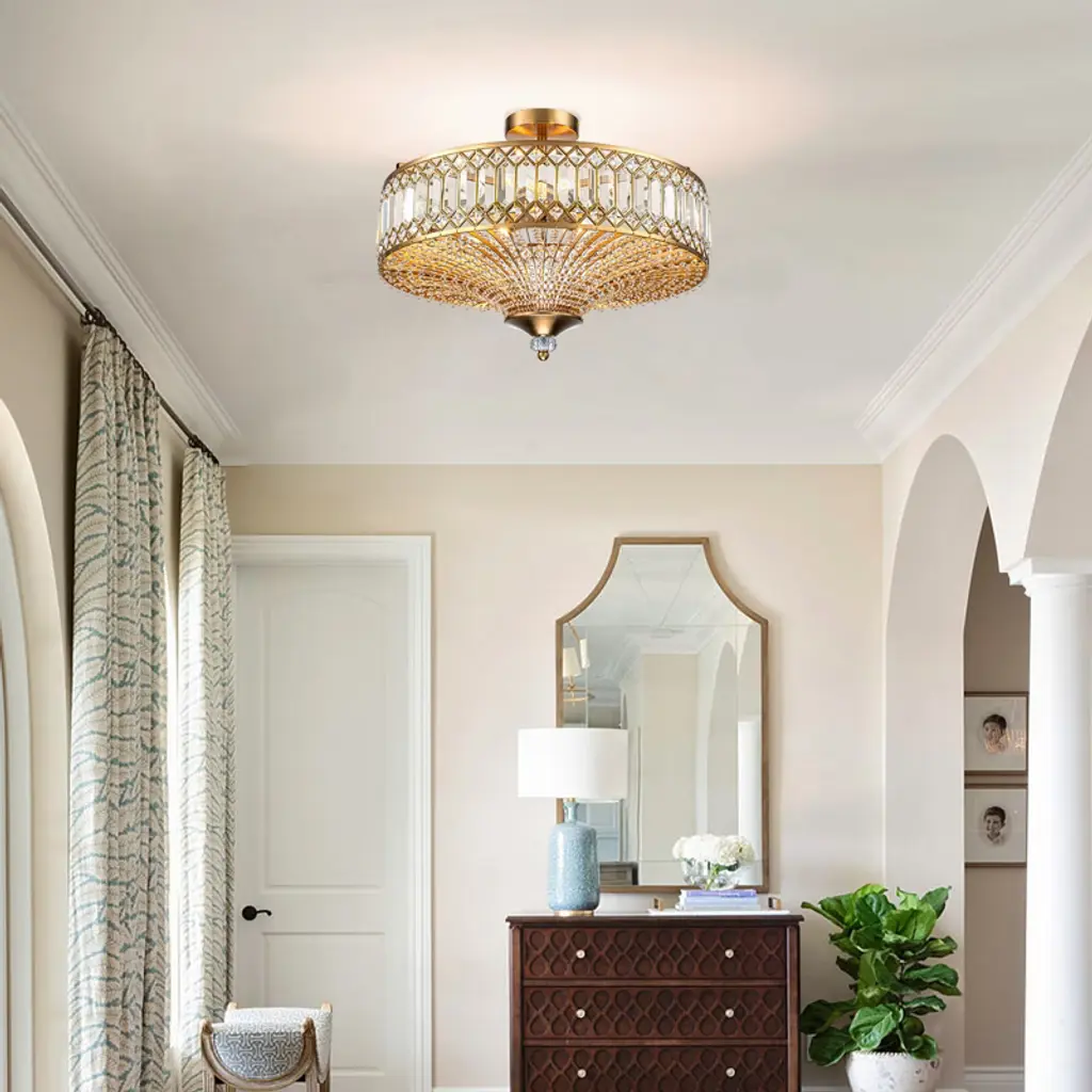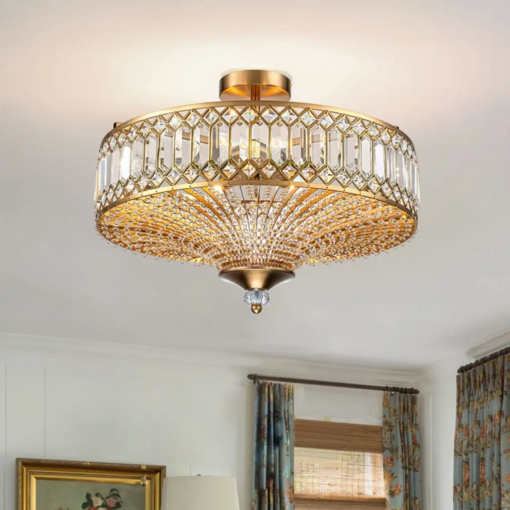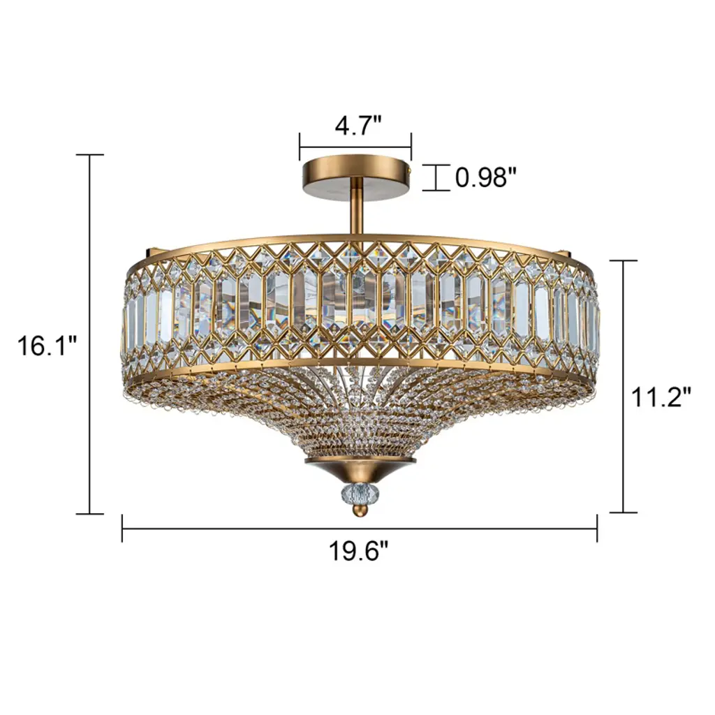 Elevate your space with this stunning semi flush mount crystal chandelier. Featuring a gold-finished frame and an elegant drum shade, it exudes sophistication and luxury. Intricate crystal embellishments beautifully catch and refract the light, casting shimmering reflections across your walls and ceiling. The fixture requires 6 × E12 bulbs (maximum 40W per bulb, bulbs not included) and is compatible with dimmable bulbs and switches for customizable ambiance. Measuring 19.6" × 19.6" × 16.1", it’s perfect for dining rooms, foyers, or bedrooms. Easy hardwired installation with included USA standard mounting hardware.