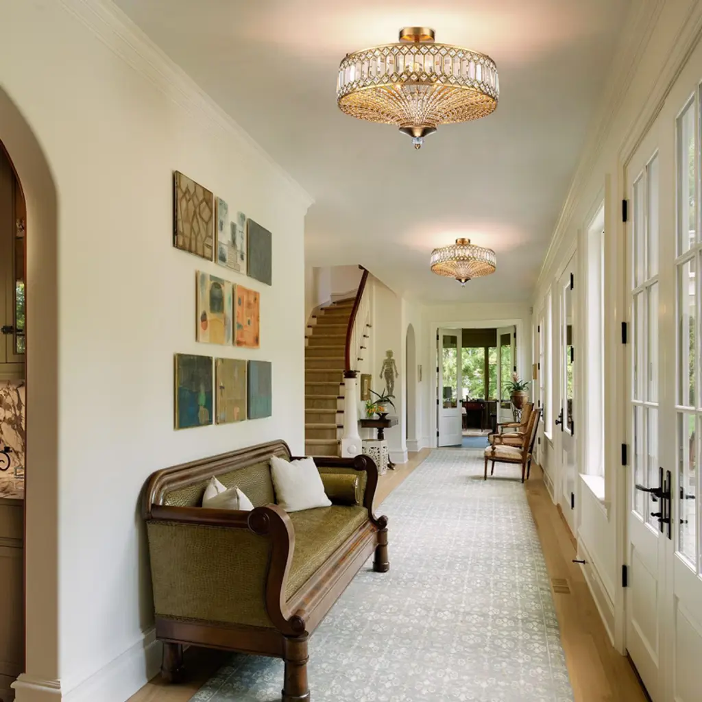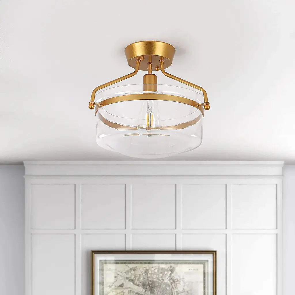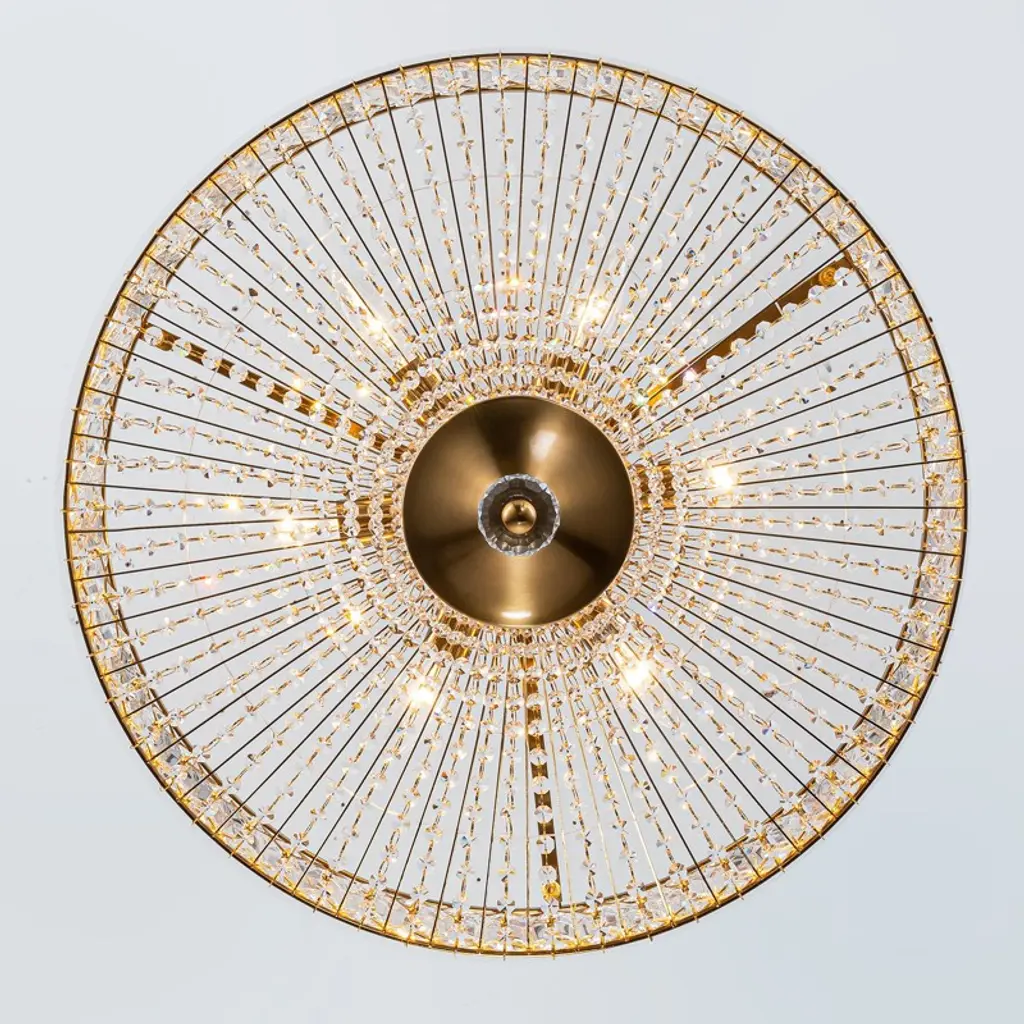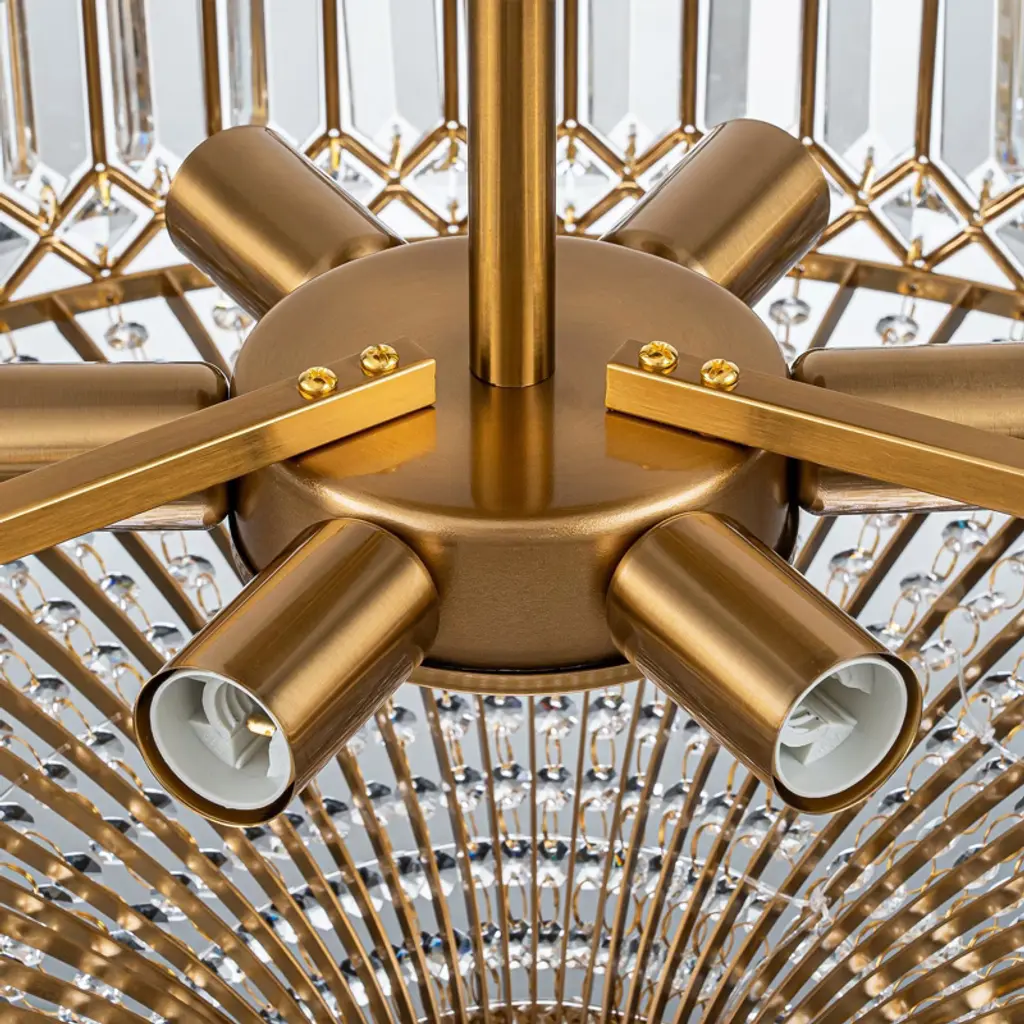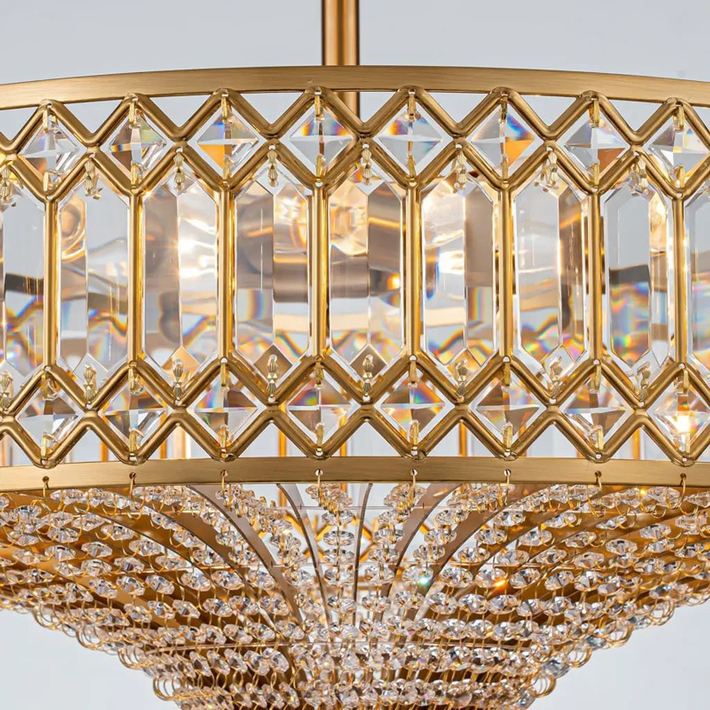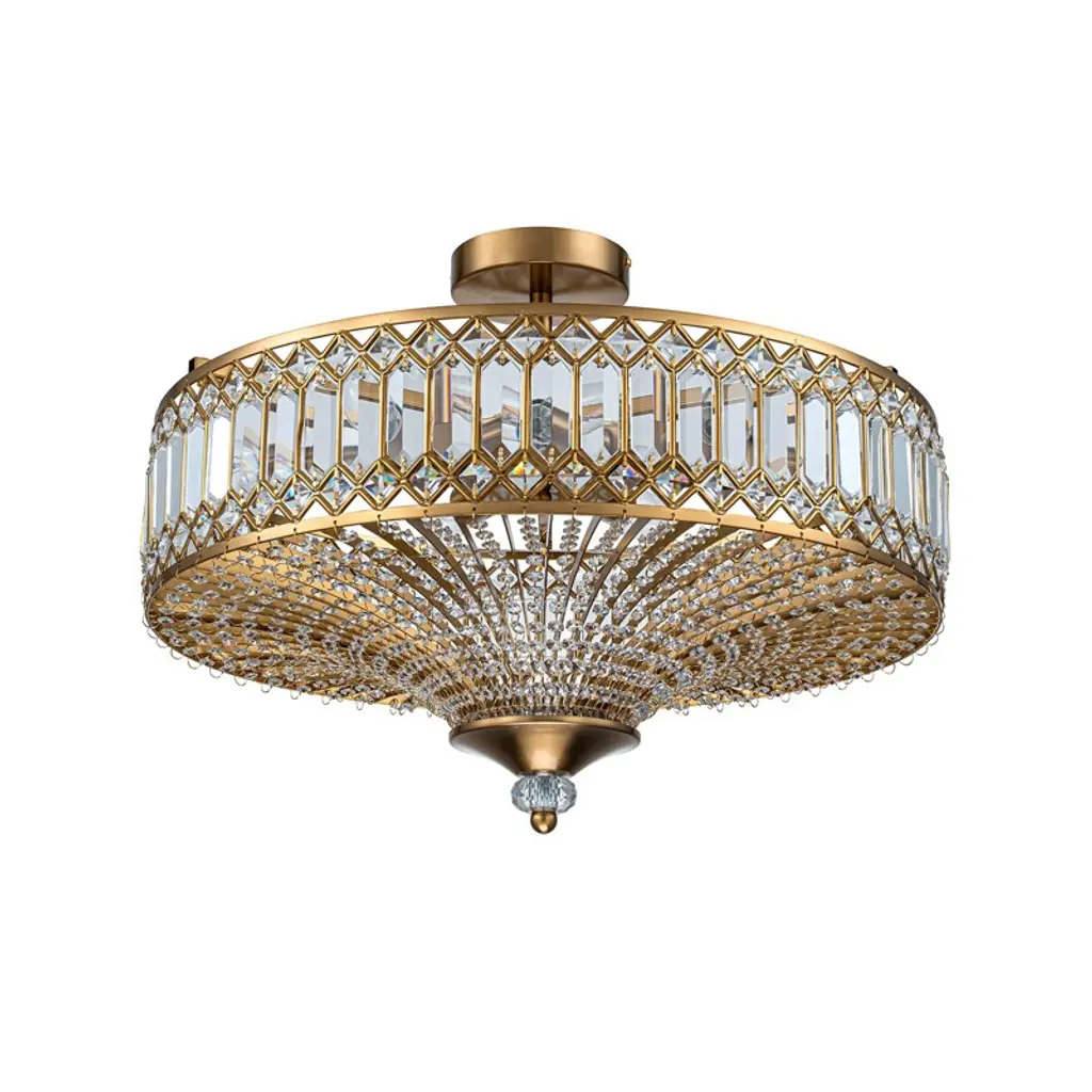 Elevate your space with this stunning semi flush mount crystal chandelier. Featuring a gold-finished frame and an elegant drum shade, it exudes sophistication and luxury. Intricate crystal embellishments beautifully catch and refract the light, casting shimmering reflections across your walls and ceiling. The fixture requires 6 × E12 bulbs (maximum 40W per bulb, bulbs not included) and is compatible with dimmable bulbs and switches for customizable ambiance. Measuring 19.6" × 19.6" × 16.1", it’s perfect for dining rooms, foyers, or bedrooms. Easy hardwired installation with included USA standard mounting hardware.
