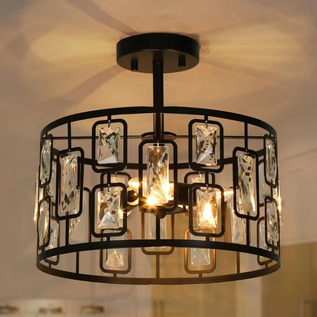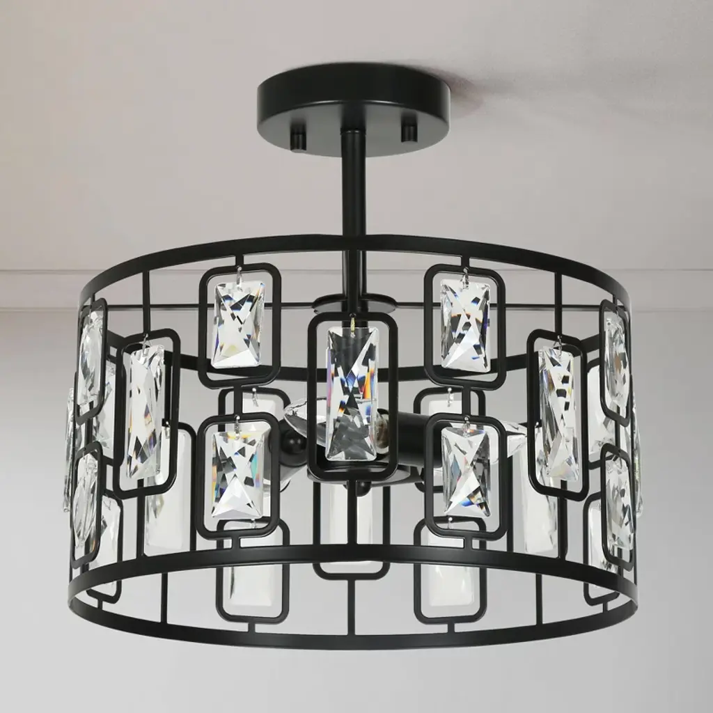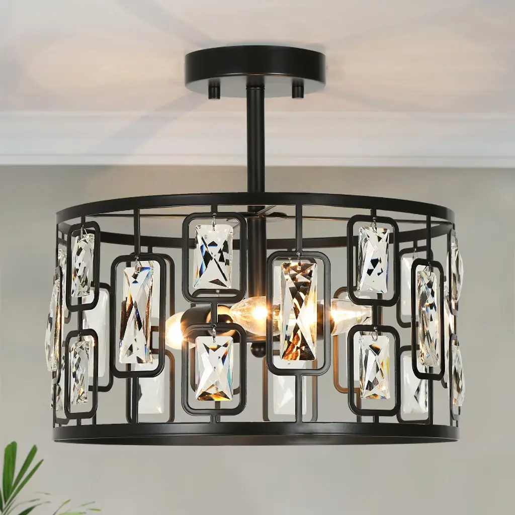 This 3-lights matte black crystal LED modern/contemporary semi-flush mount light is perfect combination of matte black metal and clear faceted crystal create a modern and luxurious look. The warm glow through the clear crystal shade, which brings attractive royal retro and modern industrial charm, matches most styles of furnishing and adds a beautiful decor to your bedroom, living room, kitchen, dining room, foyer and entrance.
