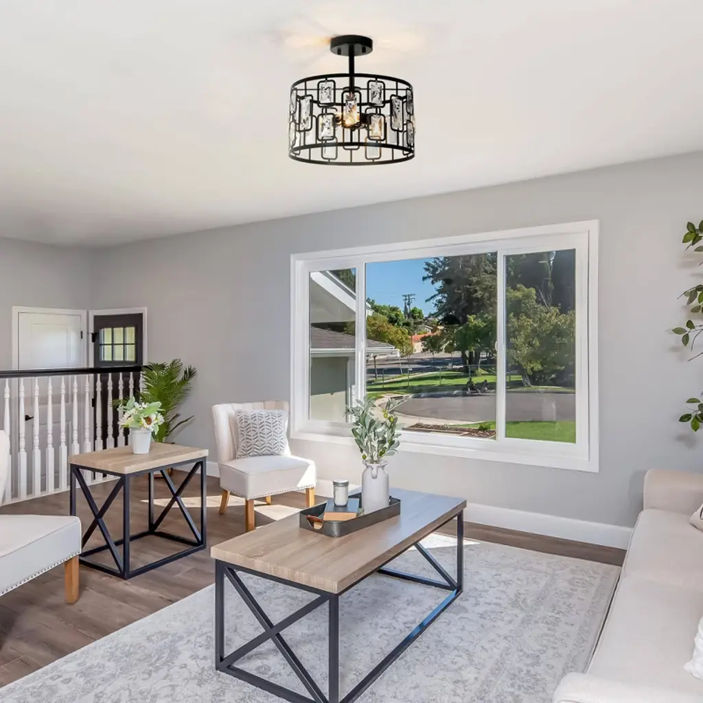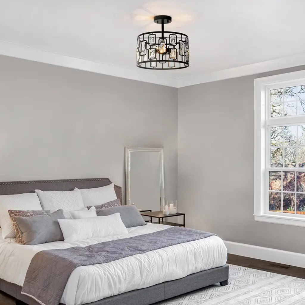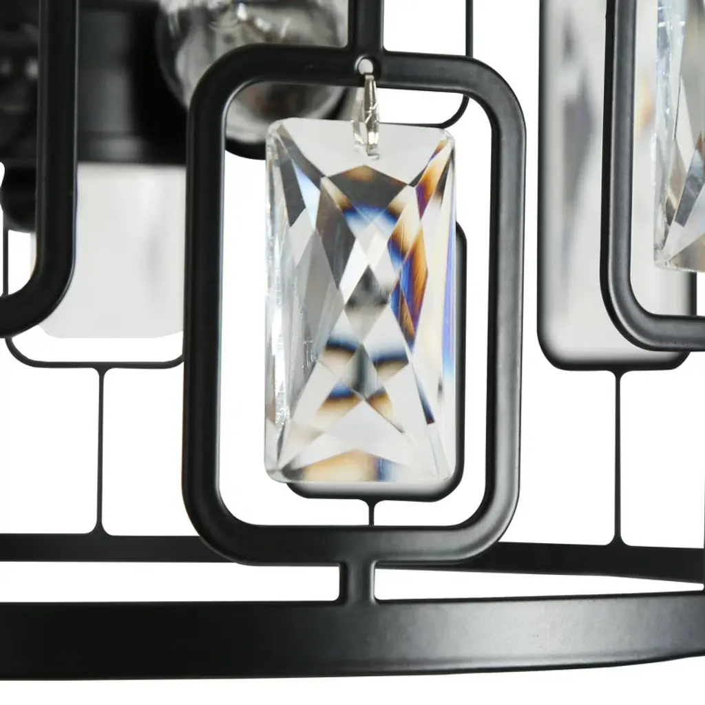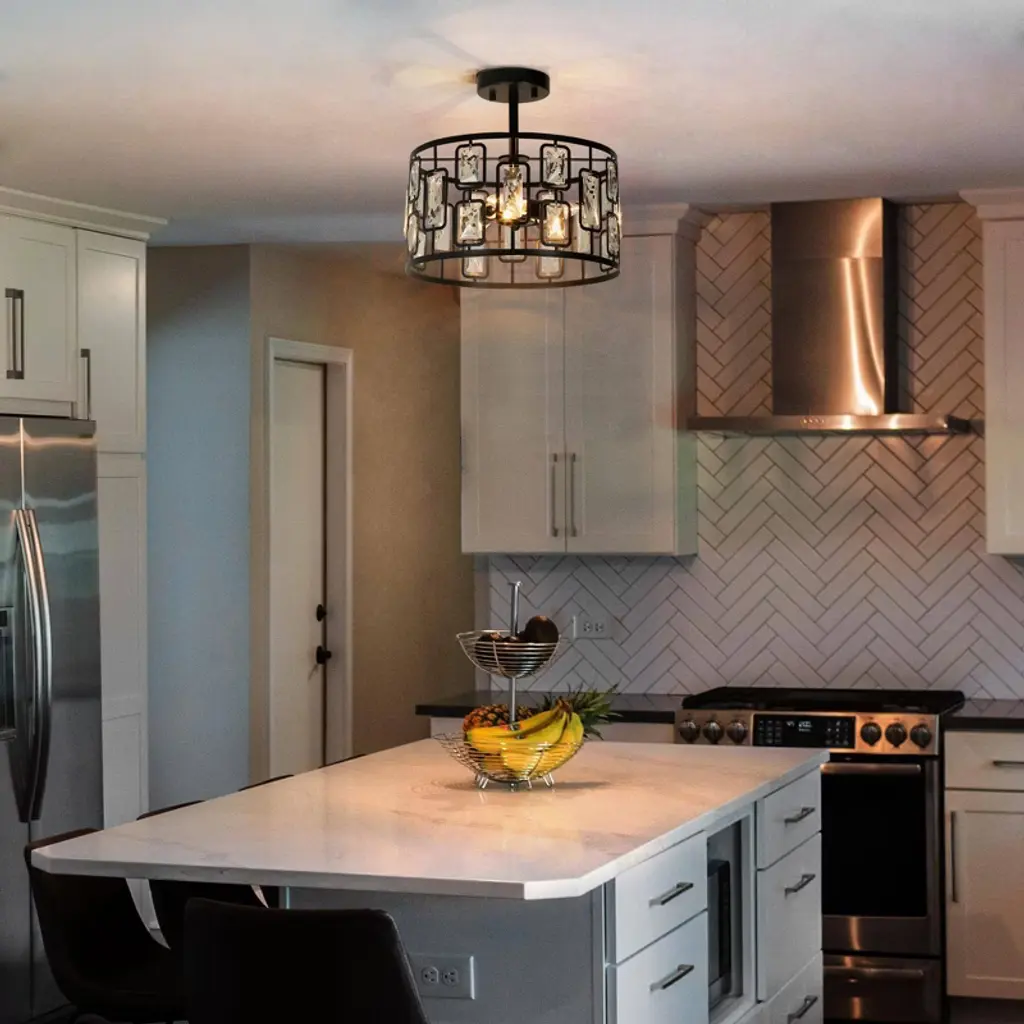 This 3-lights matte black crystal LED modern/contemporary semi-flush mount light is perfect combination of matte black metal and clear faceted crystal create a modern and luxurious look. The warm glow through the clear crystal shade, which brings attractive royal retro and modern industrial charm, matches most styles of furnishing and adds a beautiful decor to your bedroom, living room, kitchen, dining room, foyer and entrance.