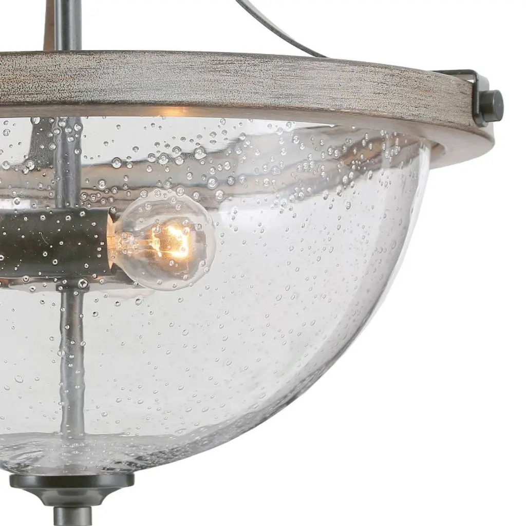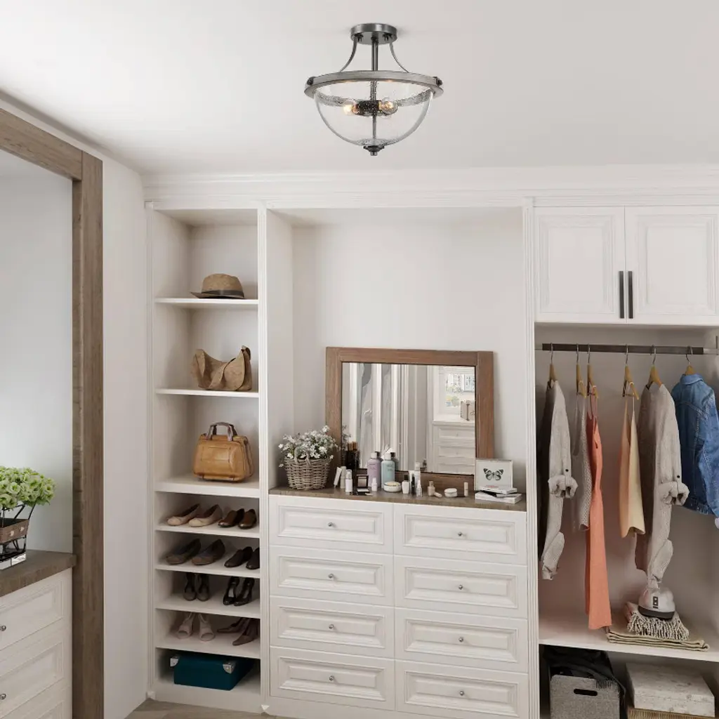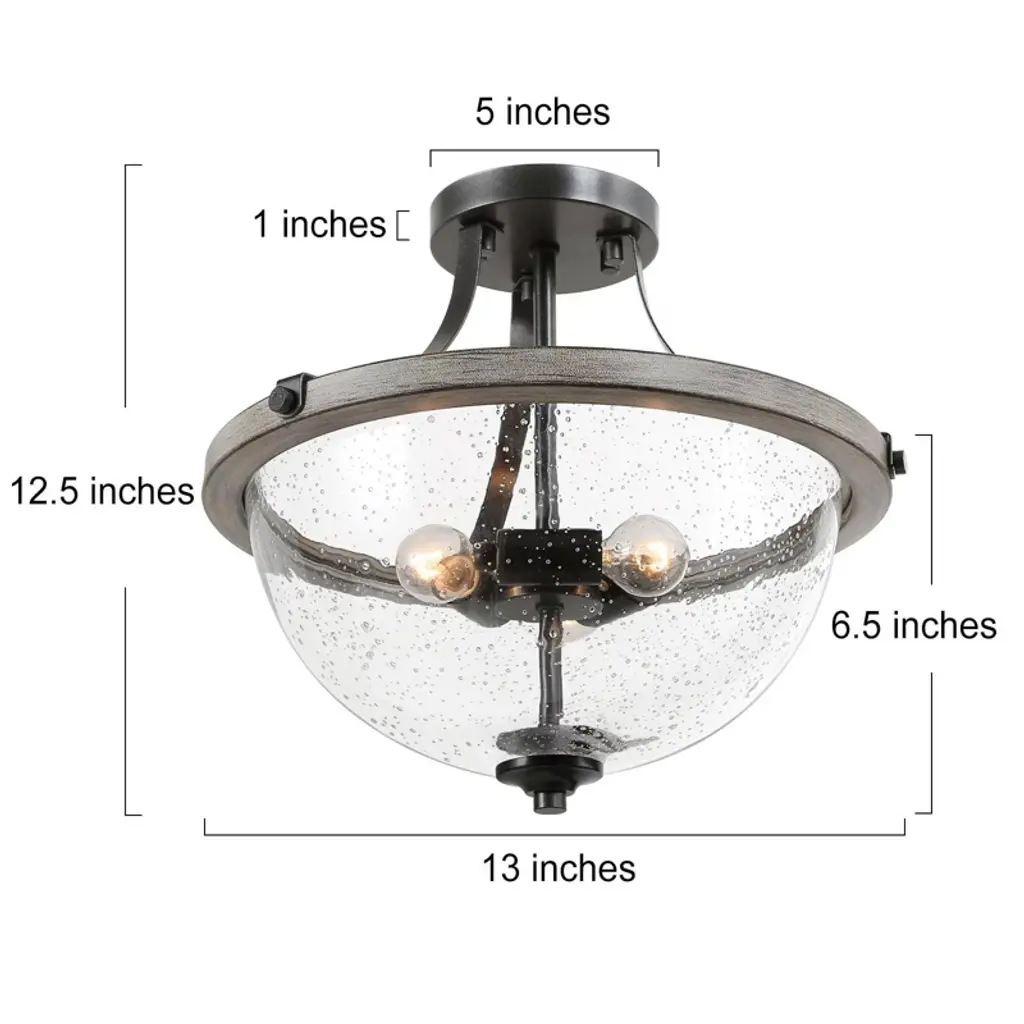 This farmhouse industrial round ceiling light features a metal frame with clear seeded glass shade, defusing soft and adequate light. Gray and wood tone metal finish offer a modern farmhouse look, add a style and interest to your home. It is a perfect choice for your master bedroom, living room, entryways, foyers, storage rooms, kitchen, and dining rooms.