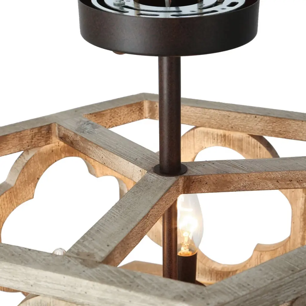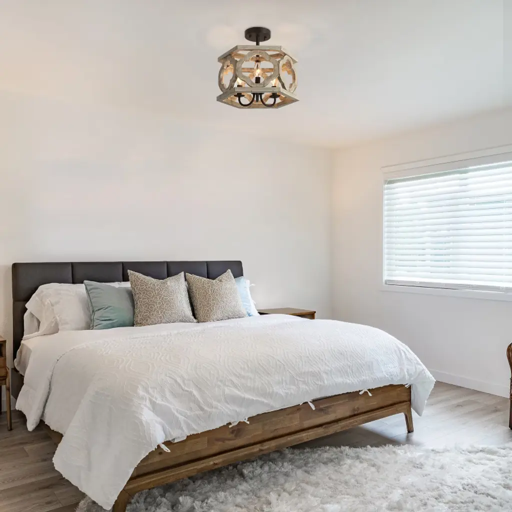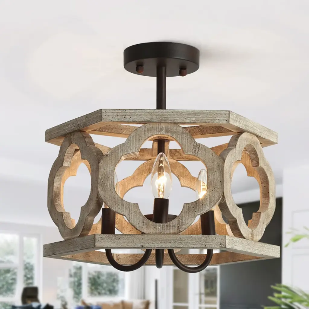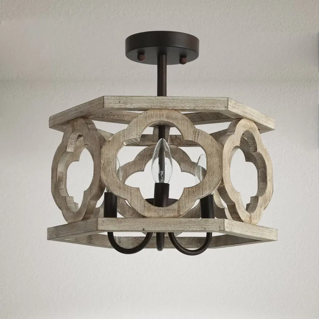 Lighting is an important part of the ensemble home decor. Not only can a ceiling light elevate the look of the room, but as a core piece to narrate the owner's spirit and character. A rustic antique white wood finish outlines a bronze finish openwork circle frame design in this semi-flush mount ceiling light. The handsome fixture is an easy way to complement rustic style decorating or update more rustic decor.