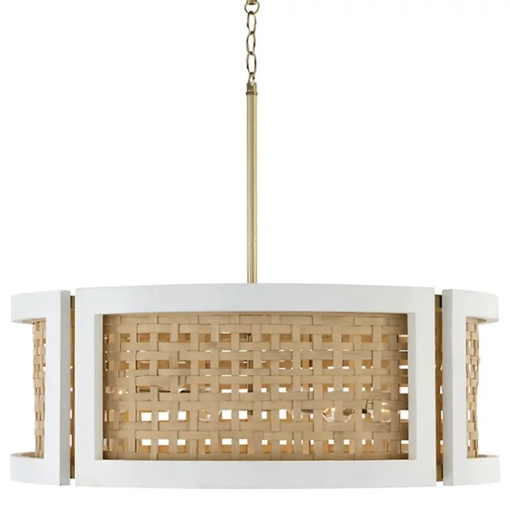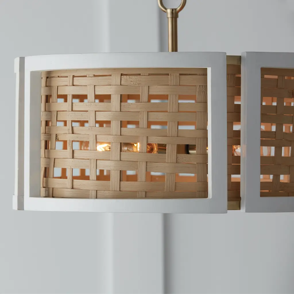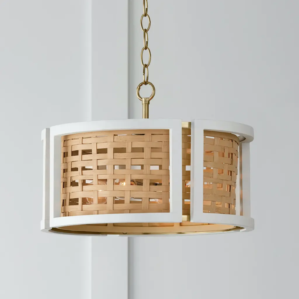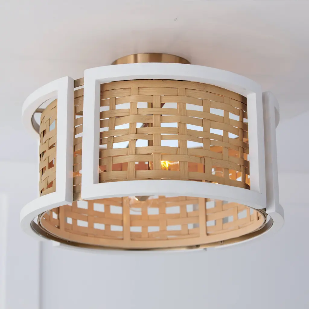 A modern mix of coastal and luxe styles, the Lola dual mount beautifully blends natural materials. The flat white painted frame is crafted of mango wood and pairs perfectly with the warm tones of the woven rattan while the matte brass finish details add a subtle touch of glamour creating a captivating contrast whether hung as a pendant or semi-flush. Finish: A combination finish of painted white mango wood and the subtle sheen of a honey-gold tone. Details: Can be used as a pendant or semi-flush. The Artisan made and hand-painted Mango Wood frame encompasses a woven rattan shade, suspended by Matte Brass metal (Natural variation will occur). Bulbs: Designed to be dimmable and LED/CFL/Incandescent bulb compatible. This fixture uses four (4) 60 Watt max E12 Candelabra base bulbs (Not Included). Shown here with a G16 lamp. Features: Rated for Dry locations. Includes 1-Year Manufacturer Warranty. Adjustable Height: Includes 10' of chain, 15' of wire so it can be hung at your desired height (Up to 137.5 inches high). Fixture Dimensions: 11.25 inches high x 16 inch diameter.