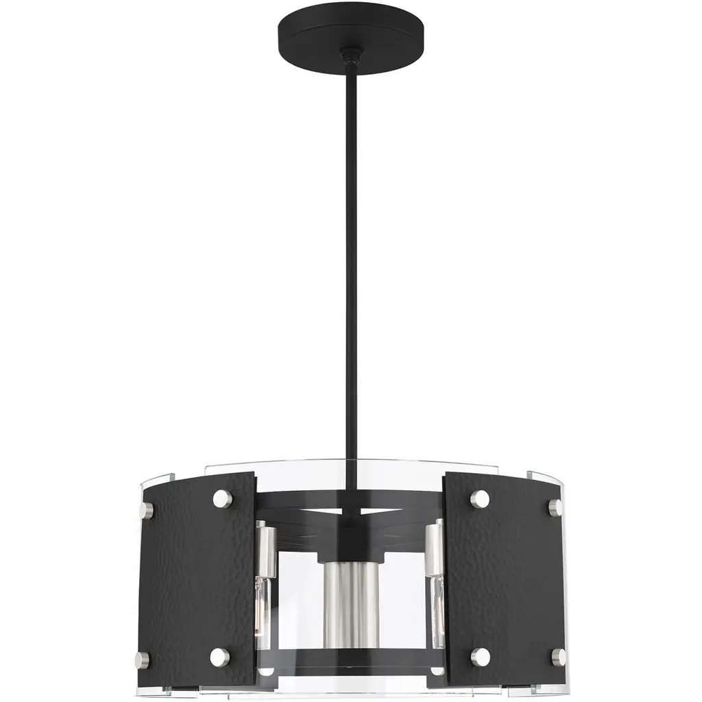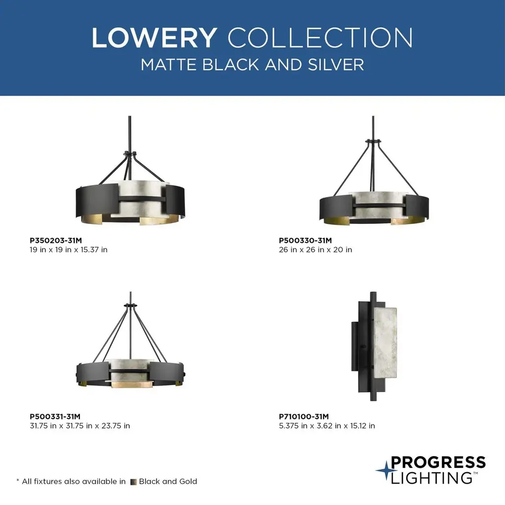 Raise the bar on contemporary design with Lowery. Layered rectangular shields coated in a matte black iron finish are artistically combined with distressed antique silver leaf panels against a black frame. Light sources glowing from inside the structure cast a shimmering reflective illumination that highlights the beautiful contrast between light and dark. Lowery delivers a stately ambient light to breakfast nooks, bedrooms, halls and foyers in luxe industrial, contemporary and rustic modern settings. This fixture is part of the Progress Lighting Design Series, a lighting collection offering fashionable styles and affordable luxury lighting for the home.