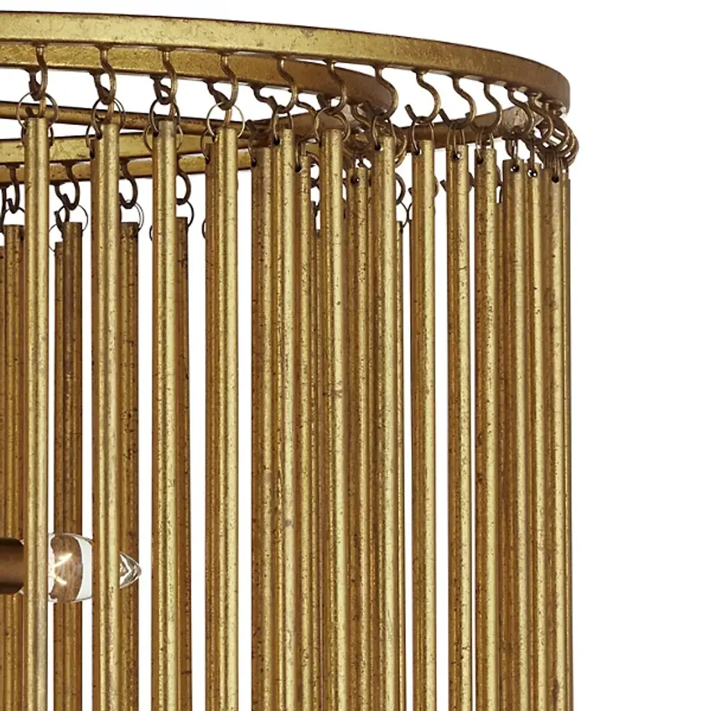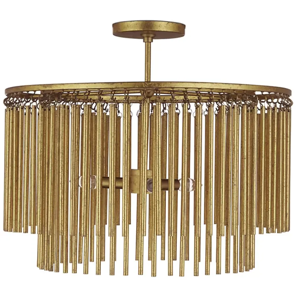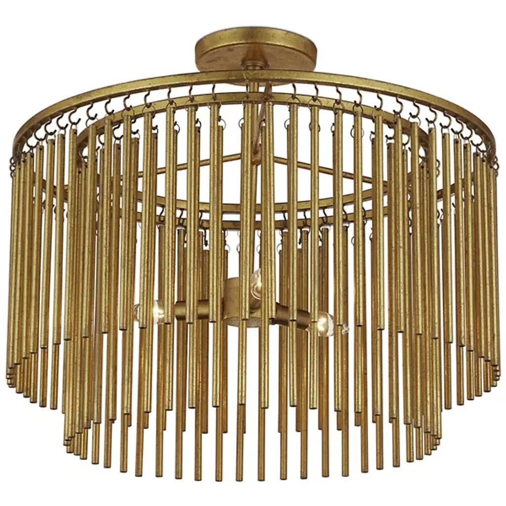 The Mantra Semi-Flushmount is a stunning embodiment of mid-century modern luxury. It features a gold leaf finish on its long metal tentacles, which dangle gracefully from two tiers, delivering a striking patina effect. This unique texture results from the meticulous distressing process applied by skilled artisans. A clever design detail is the attachment of metal rods with small hooks. Each hook is hand-welded to the circular frames. This thoughtful craftsmanship adds a sophisticated touch to the elegant gold semi-flush mount, making it a captivating addition to any space.