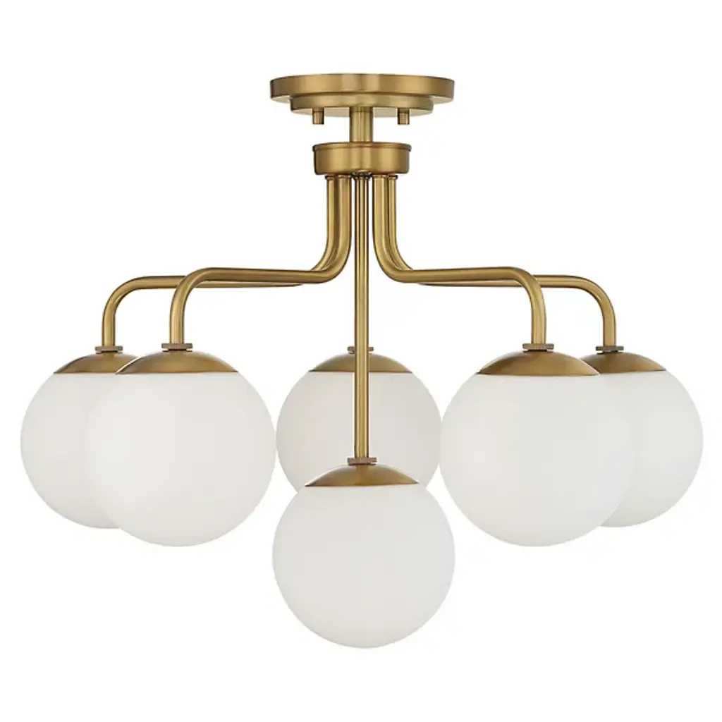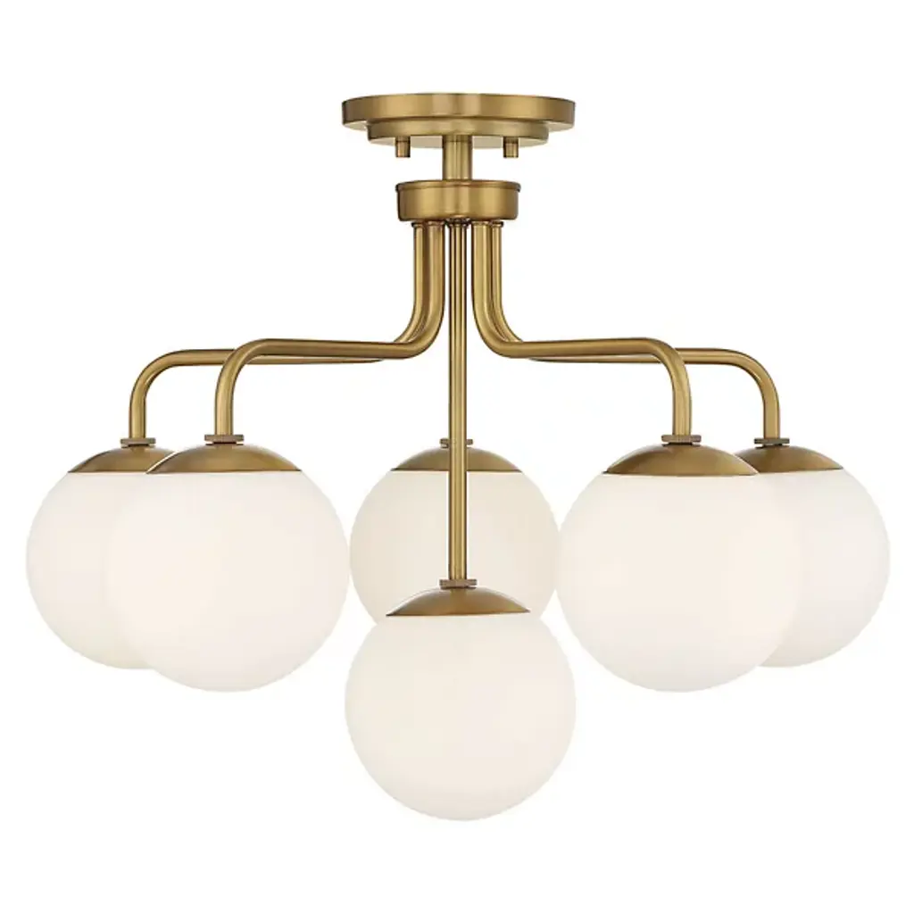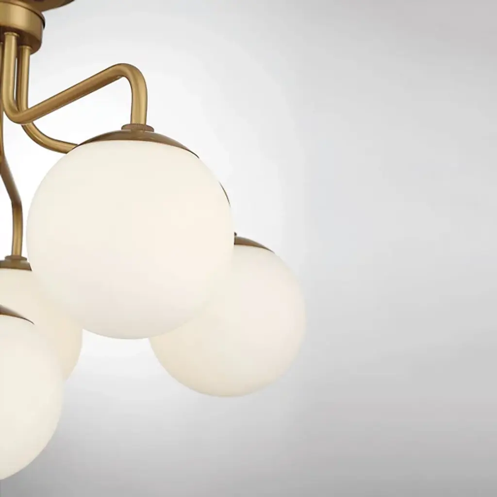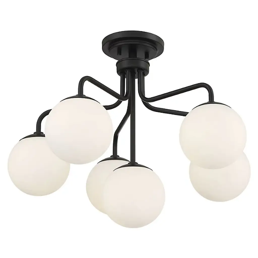 A steady flow of rich light and sumptuous shapes comes from the Marco Semi Flushmount from Savoy House. There’s no mistaking the charming curves of this mid-century modern piece. It proves versatile by sitting as a compact design over the ceiling. Evoking the contours of a fountain, the piece sends down a series of flowy metal arms. Each arm holds a lamp holder and a glass shade that completes its globe shape. The smooth globes dot the air with relaxed, warm notes. These radiant shapes produce a far-reaching aura. S/F: • Tight composition is ideal over the short ceiling • Playful shapes take a page from midcentury modern design