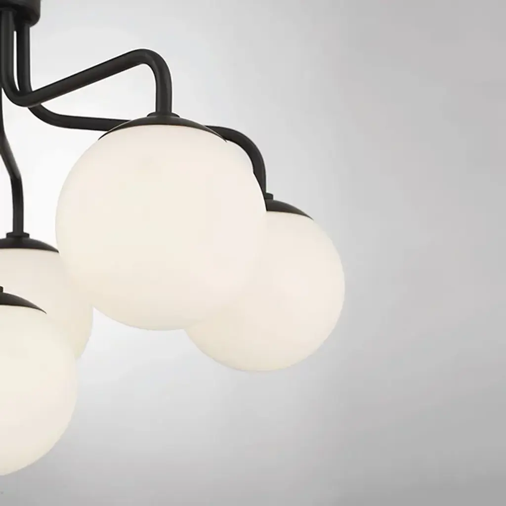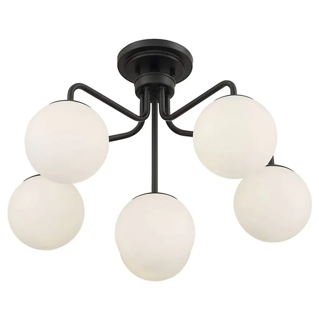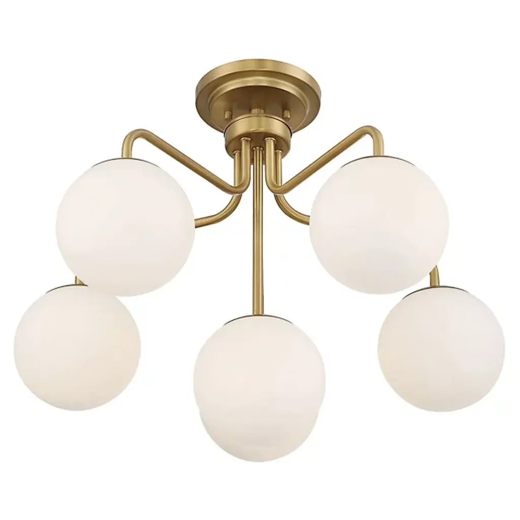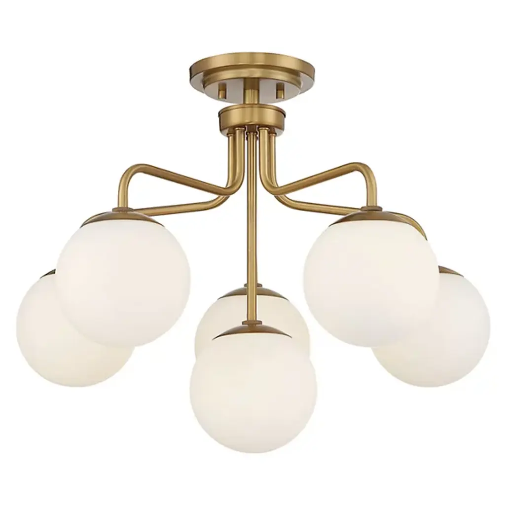 A steady flow of rich light and sumptuous shapes comes from the Marco Semi Flushmount from Savoy House. There’s no mistaking the charming curves of this mid-century modern piece. It proves versatile by sitting as a compact design over the ceiling. Evoking the contours of a fountain, the piece sends down a series of flowy metal arms. Each arm holds a lamp holder and a glass shade that completes its globe shape. The smooth globes dot the air with relaxed, warm notes. These radiant shapes produce a far-reaching aura. S/F: • Tight composition is ideal over the short ceiling • Playful shapes take a page from midcentury modern design