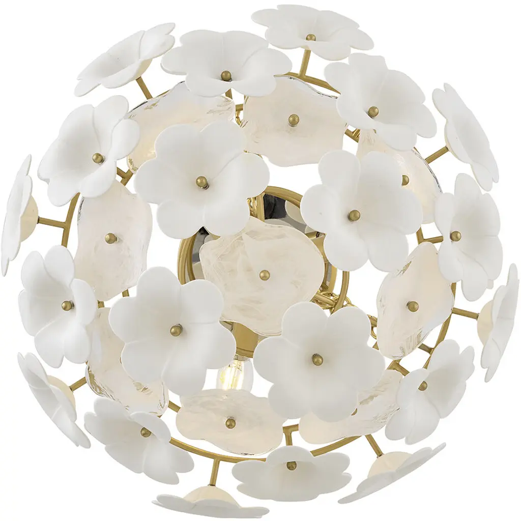 Decadently arranged in glamorous clusters, Mariannes wispy-patterned white glass and ceramic blossoms create an elegant organic silhouette enhanced by a luxurious glow. Intricate frames in our Deluxe Gold finish capture warm inviting illumination.