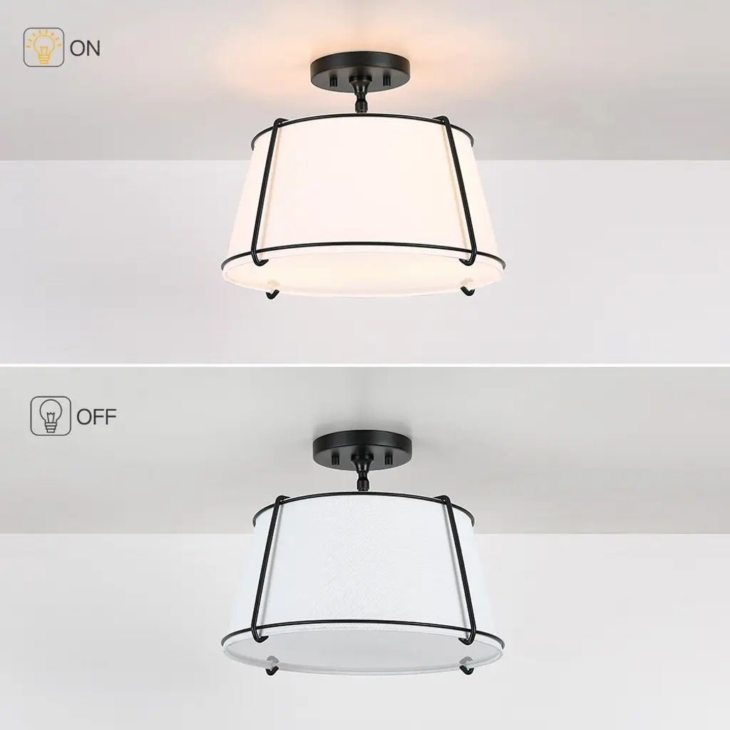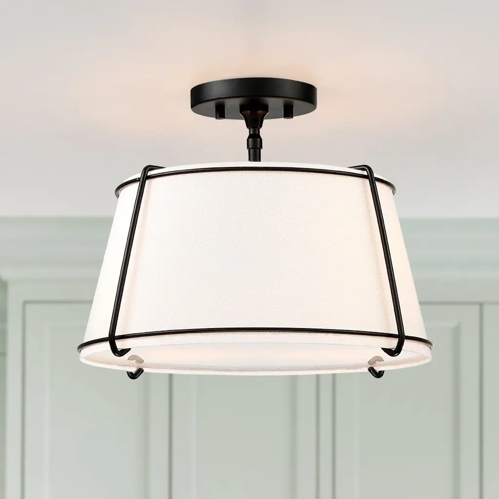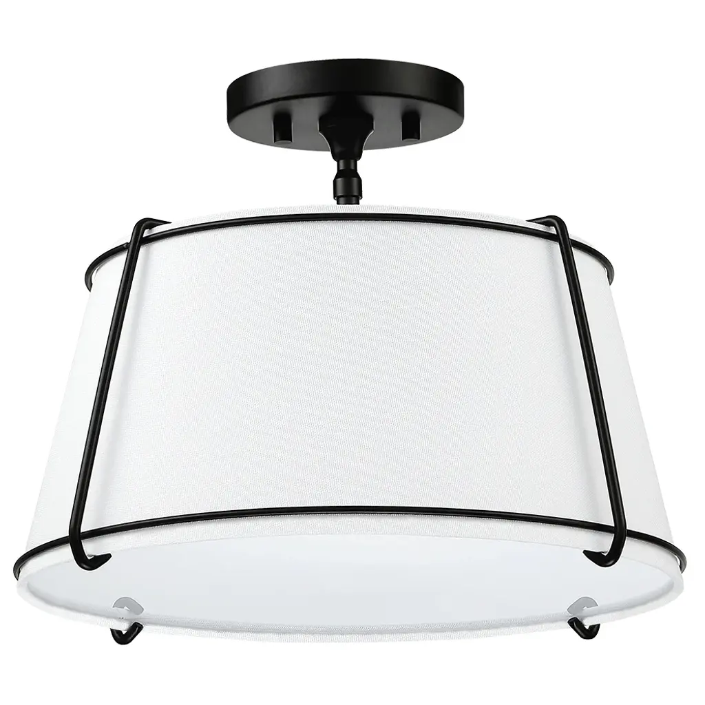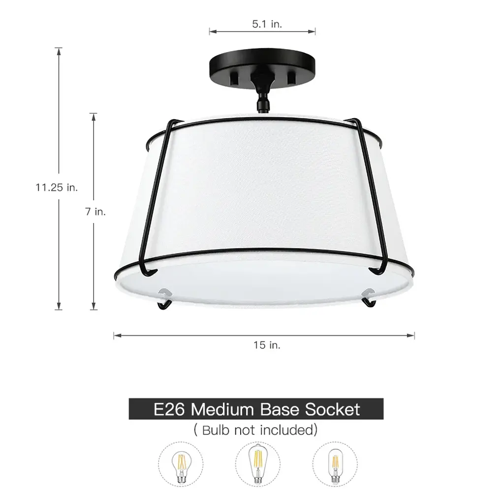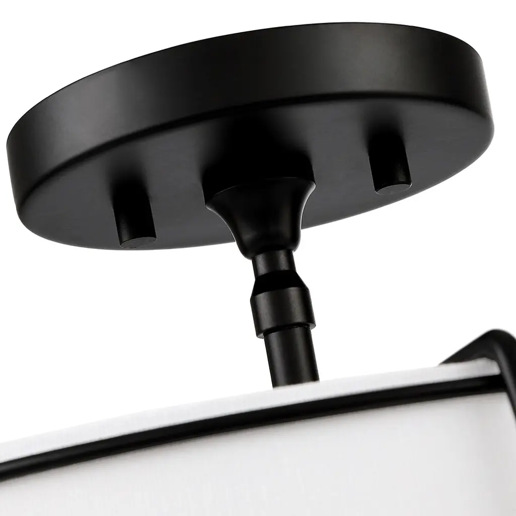 The 2 light shaded semi flush mount ceiling light fixture has an unique blend of transitional with contemporary elements. The empire drum shape white fabric shade and matte black hardware/accents make this fixture great for rooms with variety of decors, perfect for any urban decor or to help you create the look of city living, which is an ideal selection for hallway, entryway, stairway, door way, closet, pantry, kitchen, sitting room or a foyer to bring warmth to a living room or bedroom