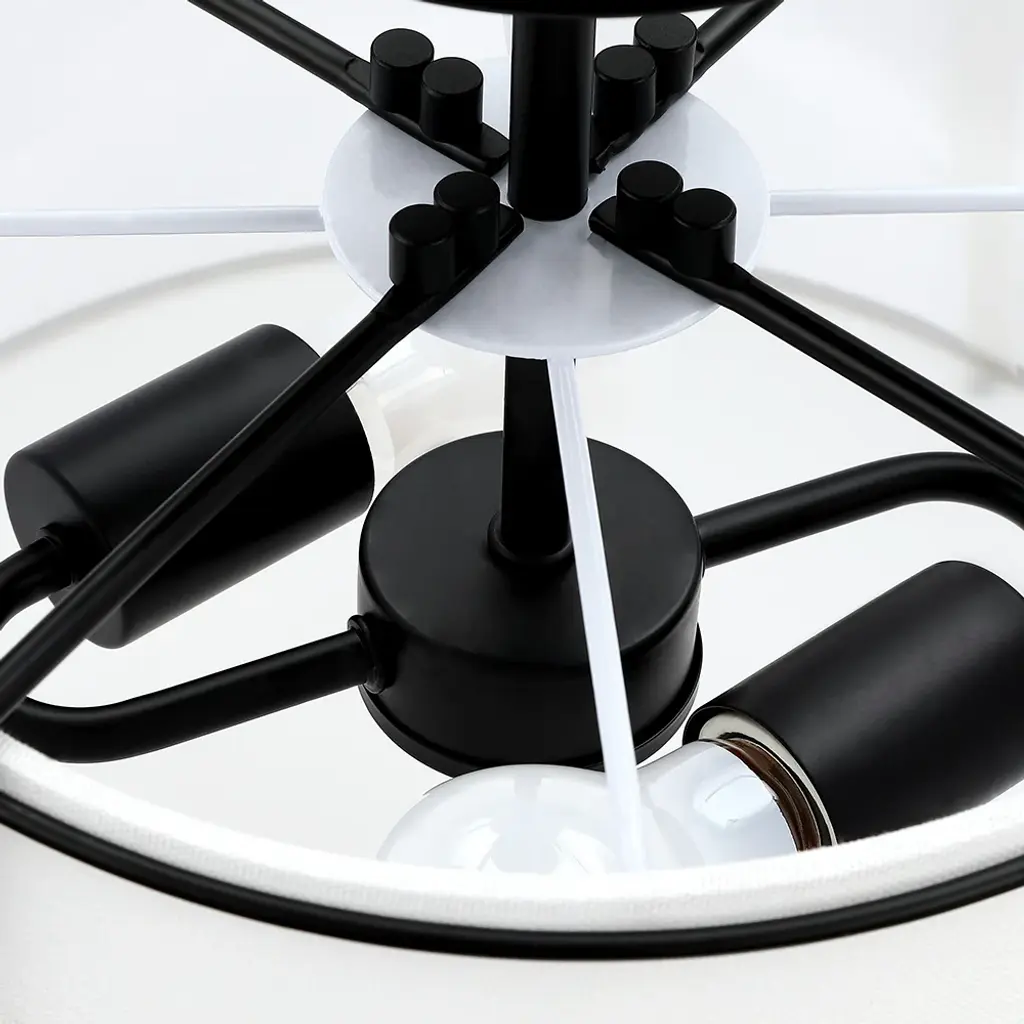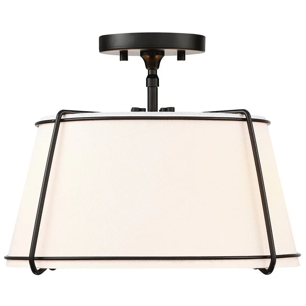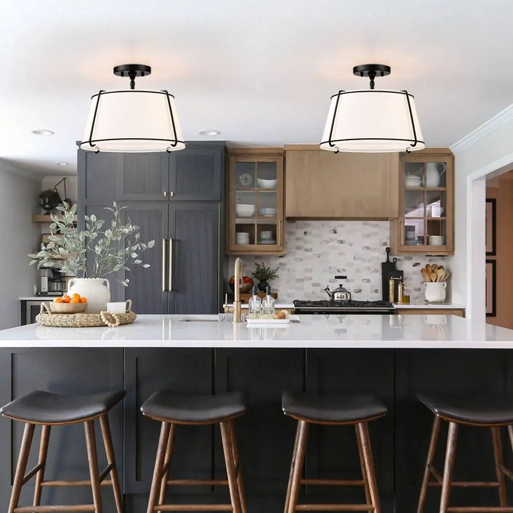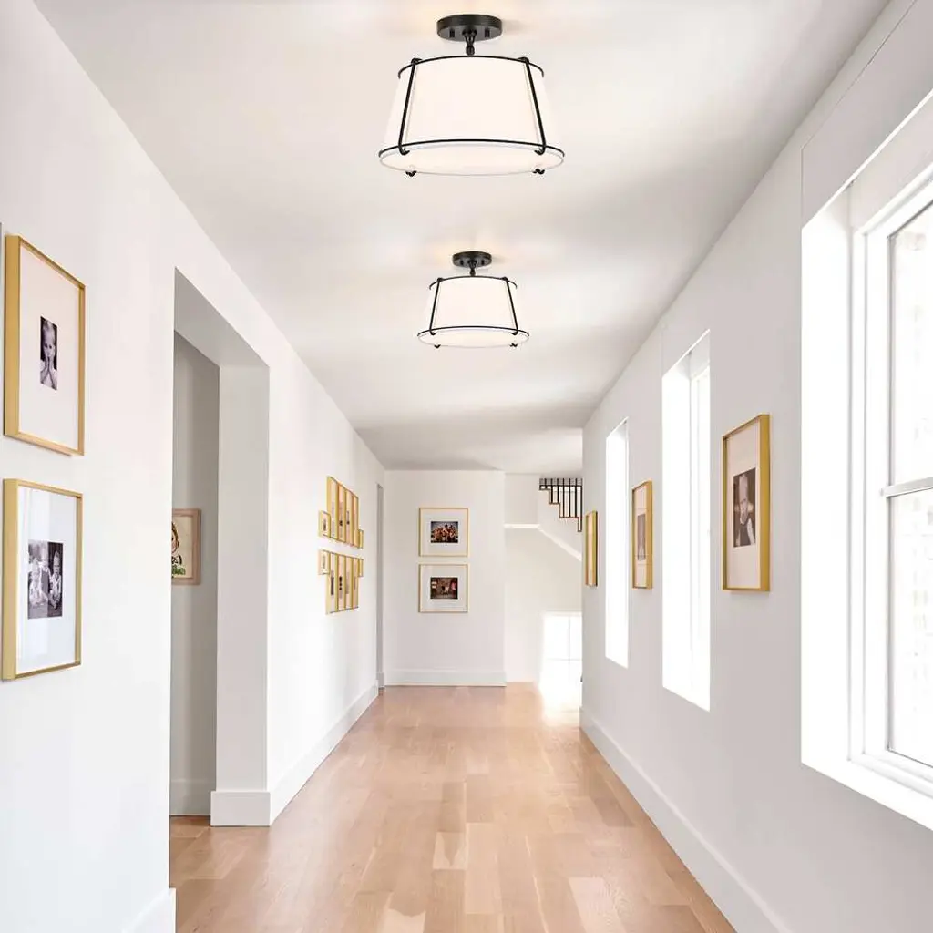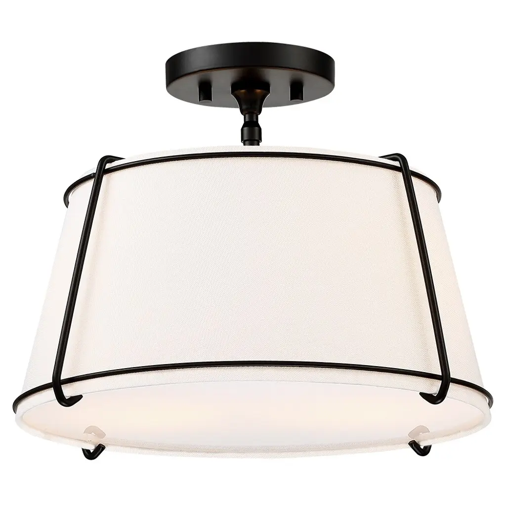 The 2 light shaded semi flush mount ceiling light fixture has an unique blend of transitional with contemporary elements. The empire drum shape white fabric shade and matte black hardware/accents make this fixture great for rooms with variety of decors, perfect for any urban decor or to help you create the look of city living, which is an ideal selection for hallway, entryway, stairway, door way, closet, pantry, kitchen, sitting room or a foyer to bring warmth to a living room or bedroom