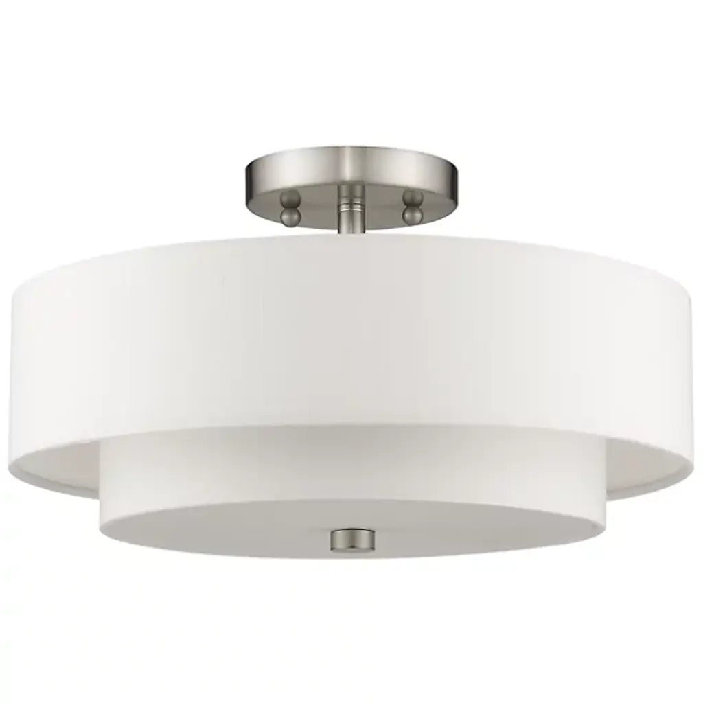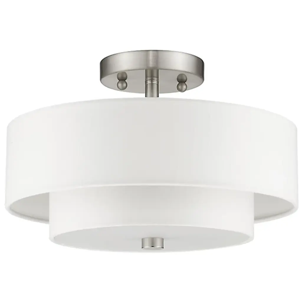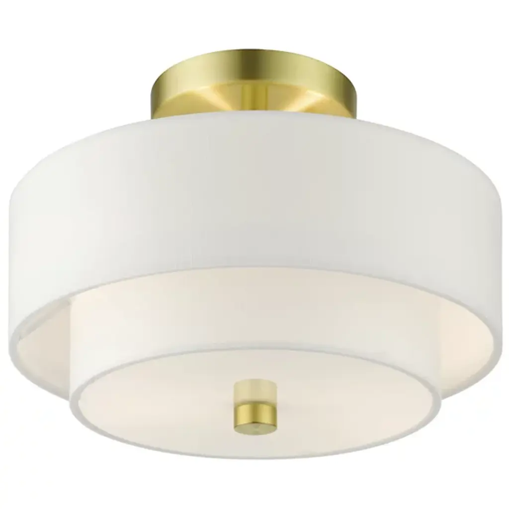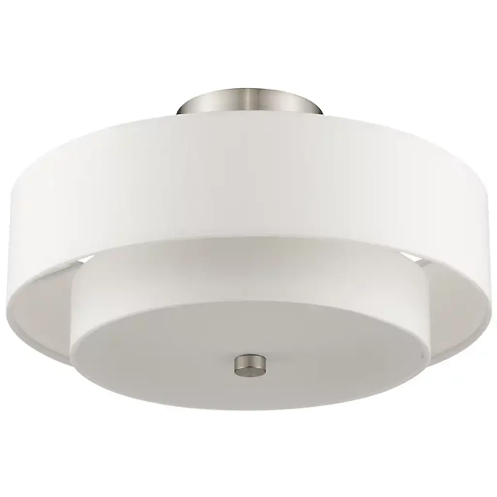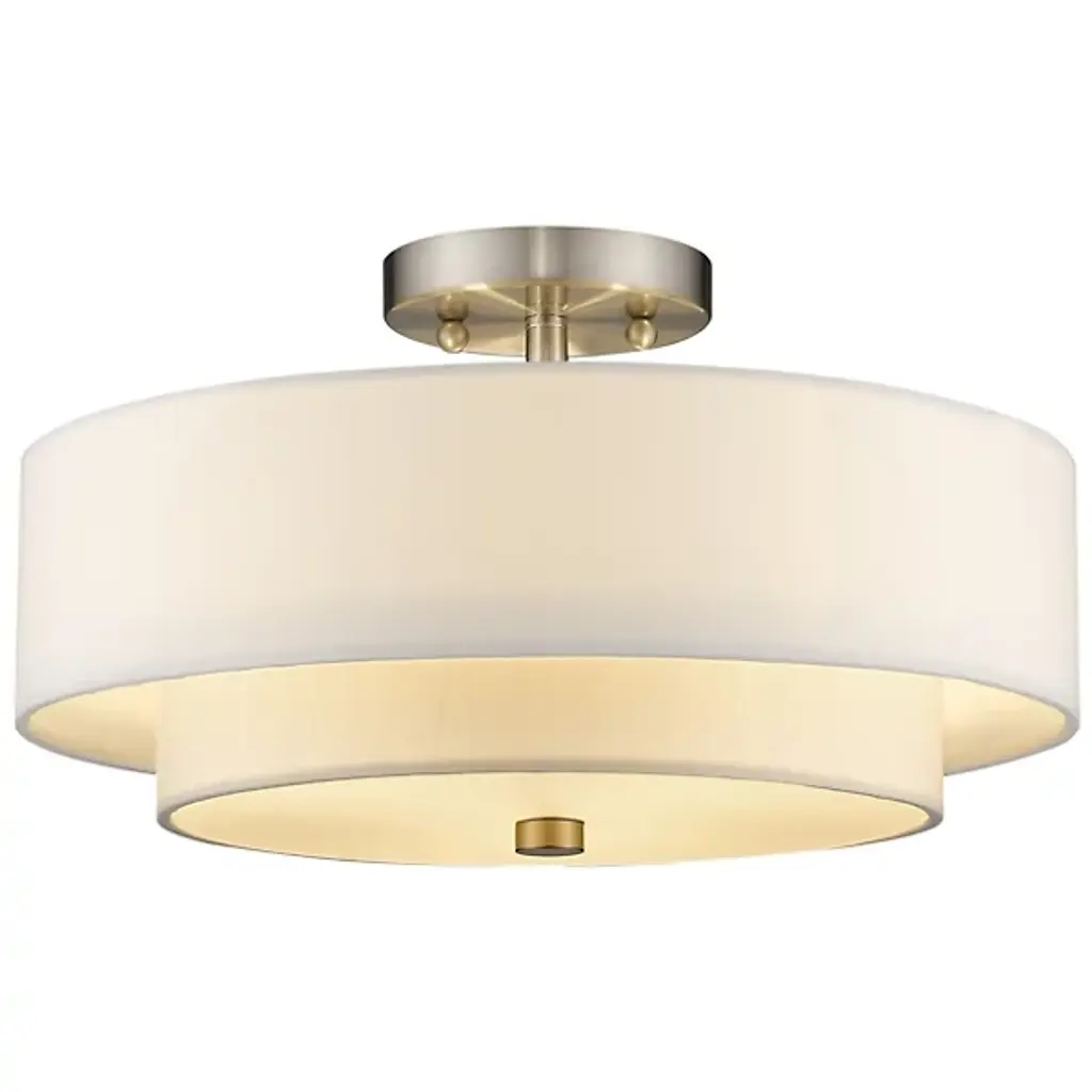 Handcrafted with transitional elegance. Fill up your spaces with the top to bottom diffused glow of the Maureen Double Semi-Flushmount from Alder & Ore. The piece celebrates the classic drum shade with a clean, concentric design. Artisans handcraft the hardback fabric shades, giving them a soft, tailored feel. A hardened glass diffuser lines the base of the drums to make sure no glare reaches your eyes. The diffusing elements mount to the ceiling with low-profile steel hardware, making it a versatile addition across the home. When turned on, the piece generates a clean, repeating silhouette and a relaxed, bountiful glow.
