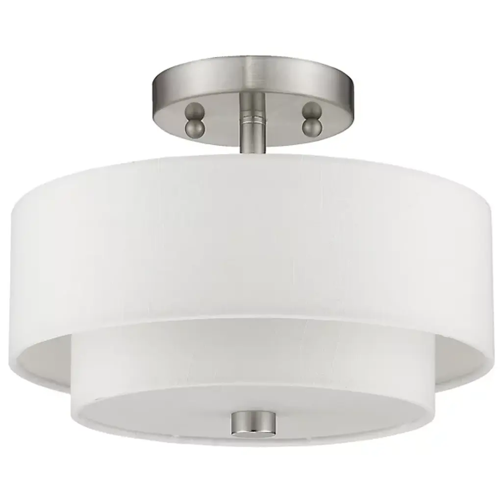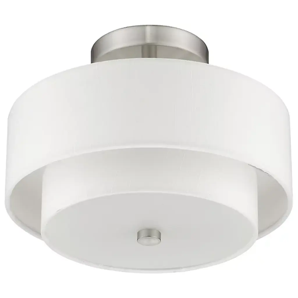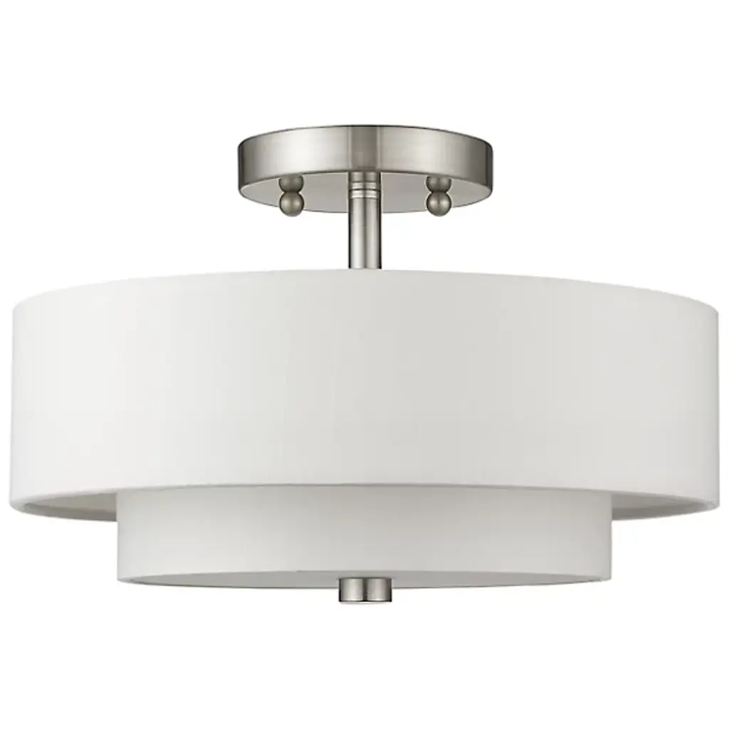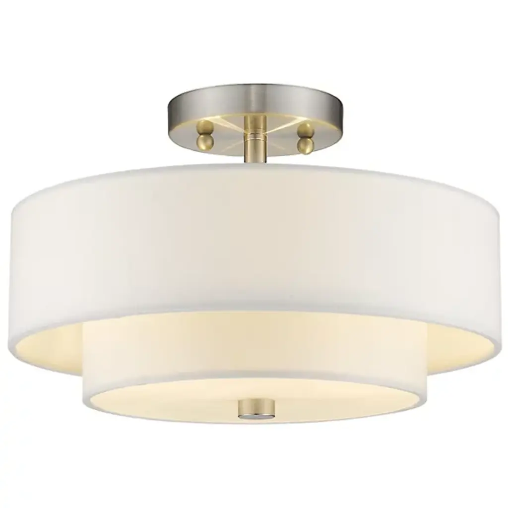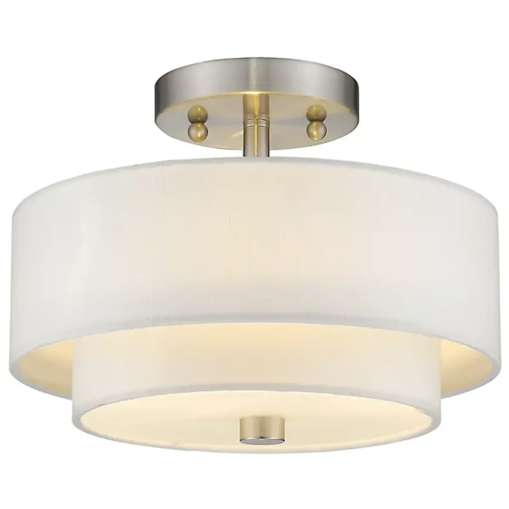 Handcrafted with transitional elegance. Fill up your spaces with the top to bottom diffused glow of the Maureen Double Semi-Flushmount from Alder & Ore. The piece celebrates the classic drum shade with a clean, concentric design. Artisans handcraft the hardback fabric shades, giving them a soft, tailored feel. A hardened glass diffuser lines the base of the drums to make sure no glare reaches your eyes. The diffusing elements mount to the ceiling with low-profile steel hardware, making it a versatile addition across the home. When turned on, the piece generates a clean, repeating silhouette and a relaxed, bountiful glow.