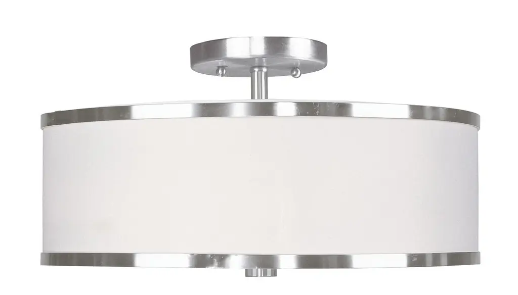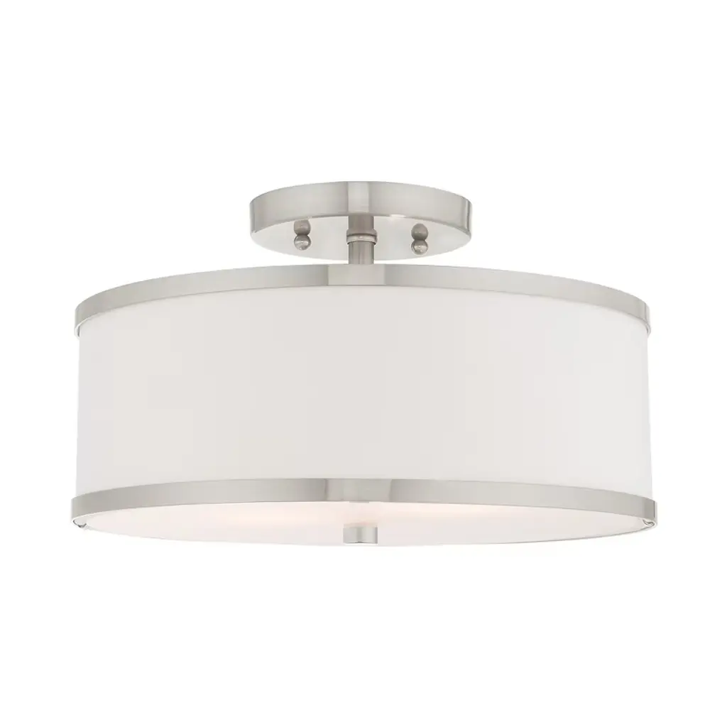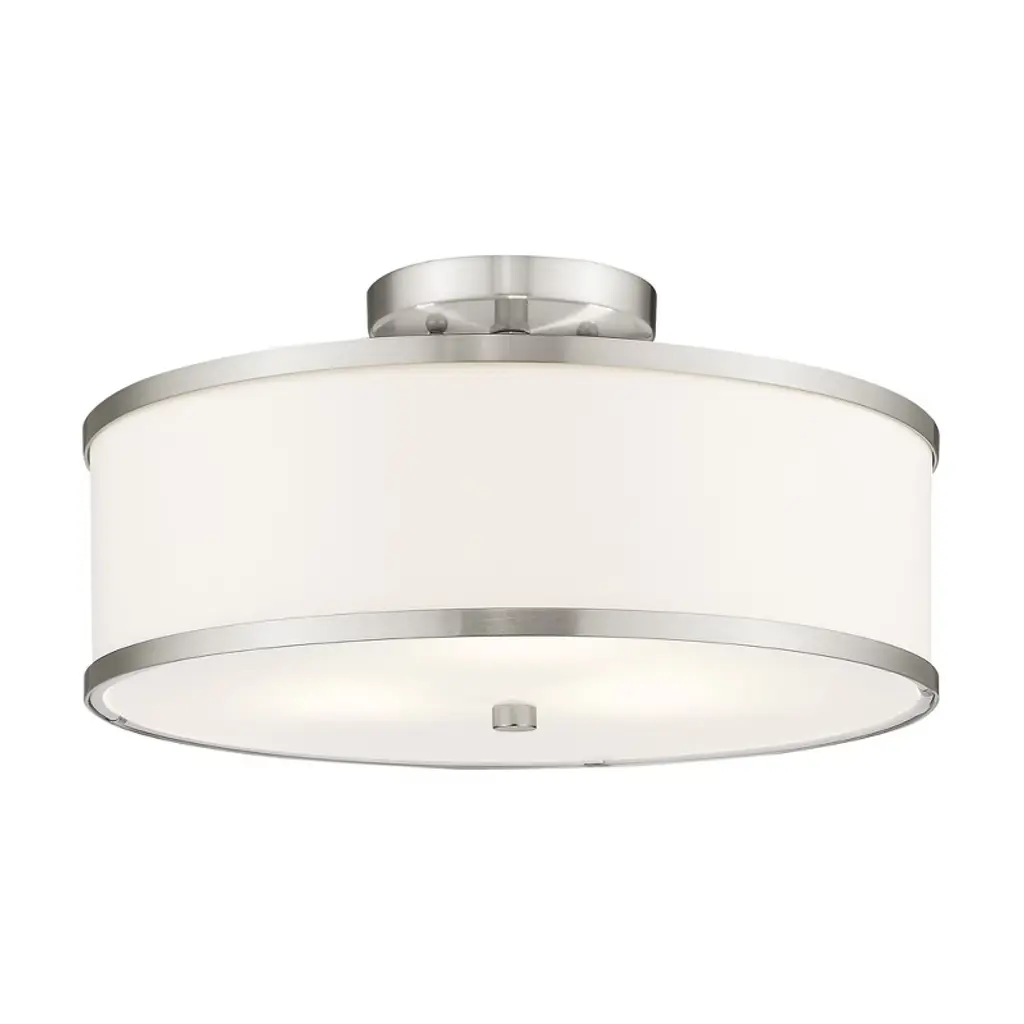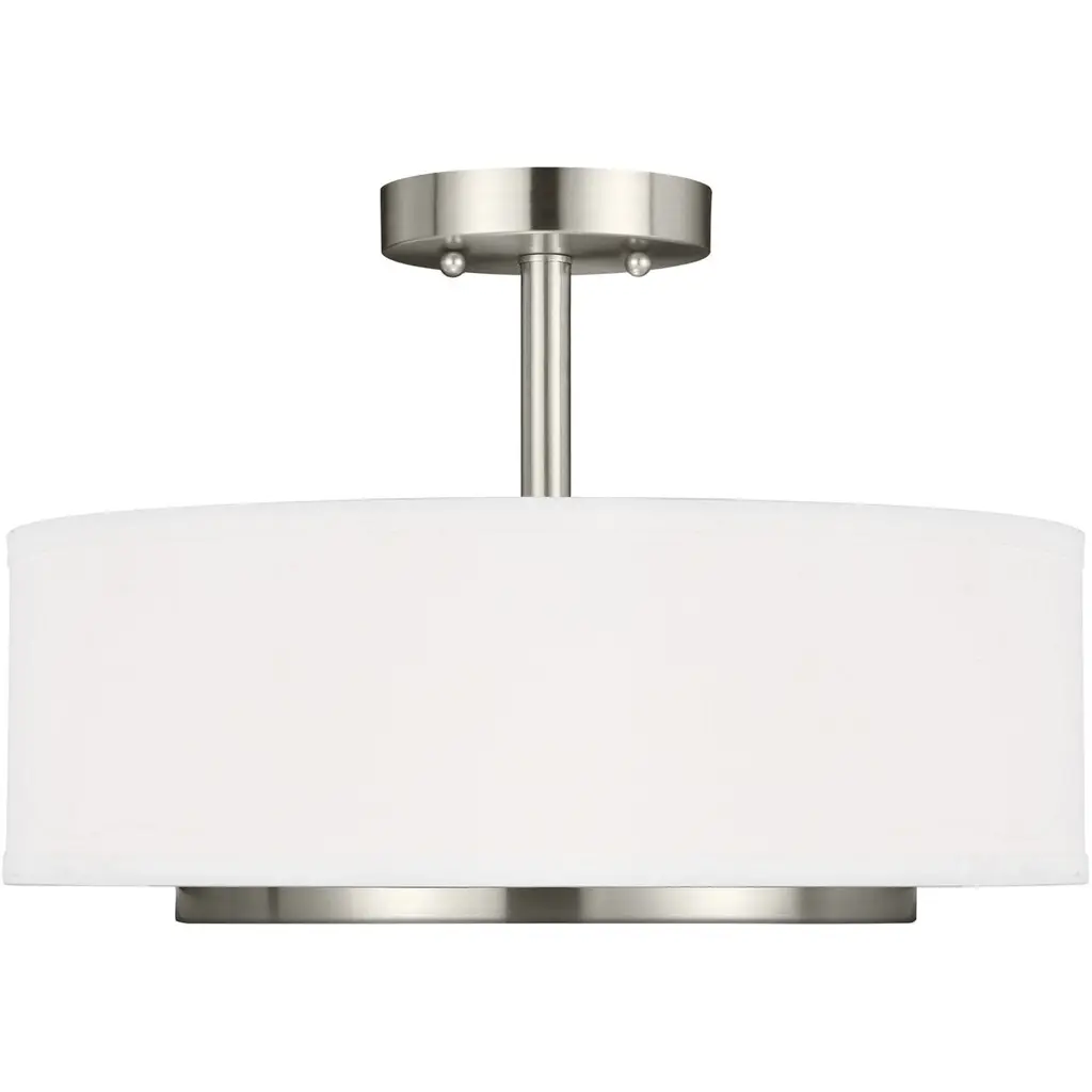 Expand your large indoor living areas with the clever contemporary spirit of the Maureen Large Semi-Flushmount from Alder & Ore. A clean-surfaced circular ceiling mount secures the fixture, extending a series of slender downrods to damp-listed lamping set beneath a wide drum shade fashioned from hardbacked fabric crafted by hand. This layer and the sleek, translucent diffuser that rests inside its lower end obscure bright glare from the lamping, transmuting it into an elegant expression of ambient light.