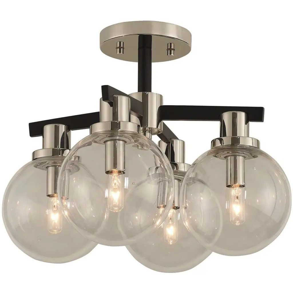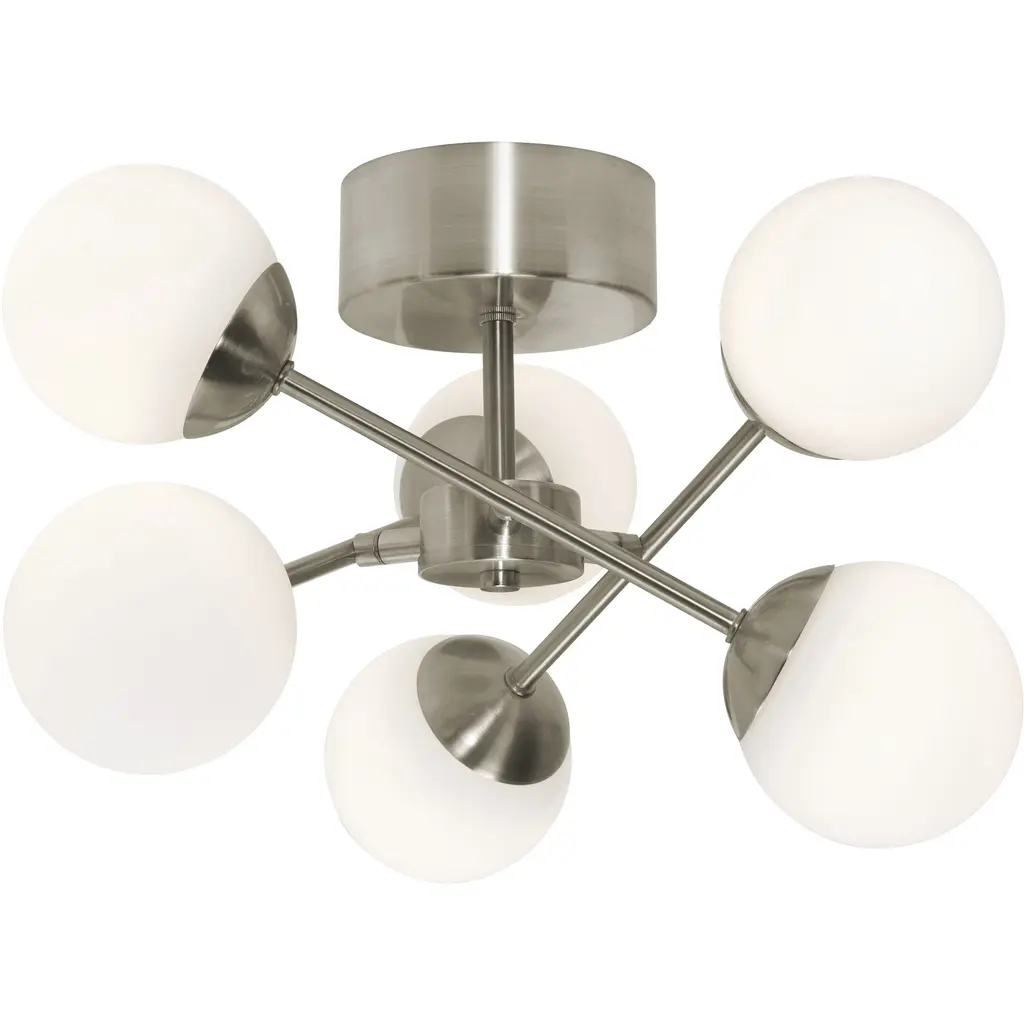The Mercer LED Semi-Flushmount by Kalco Lighting is a contemporary piece designed with some modern flair. A smooth metal down rod supports a set of arms that extend to hold and abstract arrangement of glass globes with white frosted interiors and crystal spheres. With a dynamic sense of balance, these accents and shades complement one another as energy-efficient light plays among the metallic and crystal elements of this piece. Adding an even layer of light to surroundings, this piece lends a handsome touch to your home.