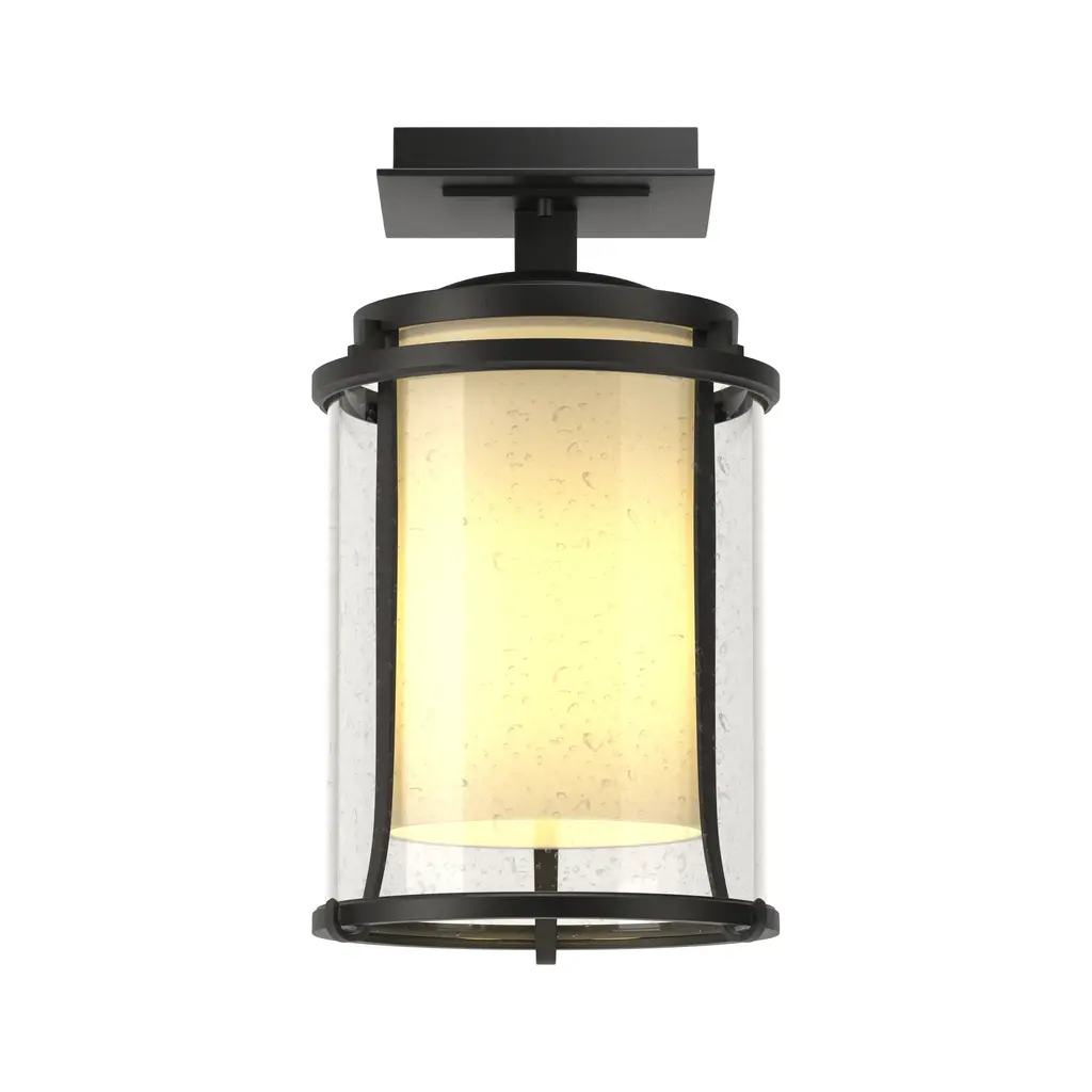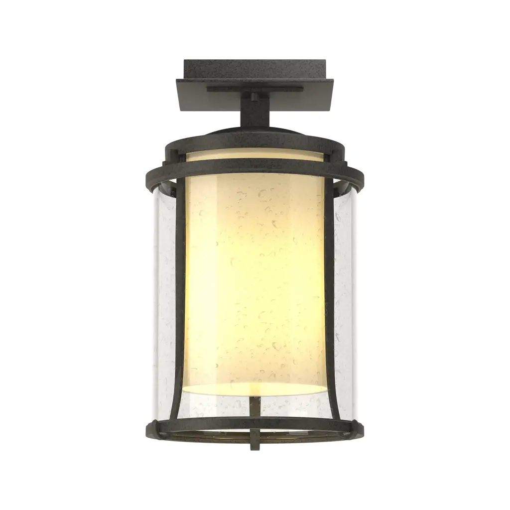 Bring warm charm to your outdoor spaces with the Hubbardton Forge Meridian Semi-Flush Mount. This handcrafted ceiling light adds timeless beauty to any porch, entryway or patio with its classic design and halogen bulbs. Durable and made to last, this fixture offers long-lasting illumination and a delightful aesthetic with its bronze tones and intricate details. Enjoy a warm welcome home every day with this one-of-a-kind light, backed by a 20-year limited warranty. Upgrade your outdoor spaces with classic style and lasting durability.Highlights Handcrafted by skilled artisans in Vermont, USA Seeded glass adds an elevated touch