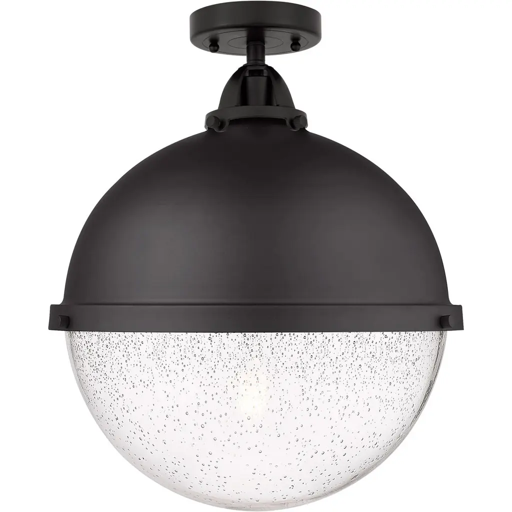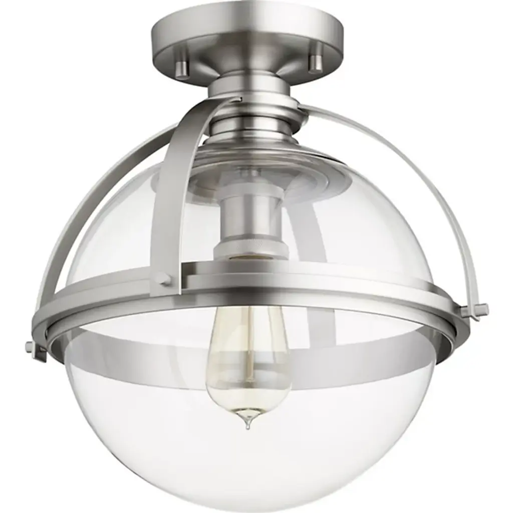 Bask in the balanced brightness of the Meridian Semi Flushmount by Quorum International. A mix of contemporary style with traditional notes, the Meridian is held flush to a disc canopy by four clean curving metal arms around a hemispherical ring. This ring frames a globe of clear glass that hangs down around a downward-facing socket, giving the fixture the illusion of gyroscopic motion while easing overt brightness from the lamping into a pleasant ambiance.