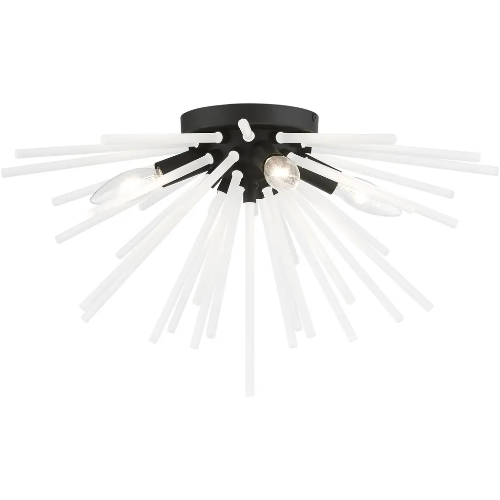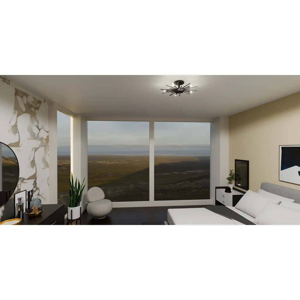 The Mesquite semi-flush mount radiates modern style with its geometric sputnik design and choice of matte black or weathered brass finish. Hang this versatile piece in a variety of spaces including a bedroom, hallway, home office , or living room. Pair with vintage filament bulbs for an added element of flair.