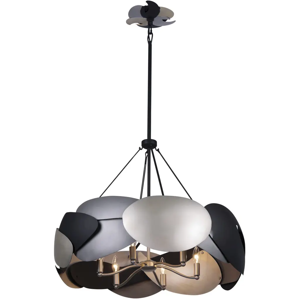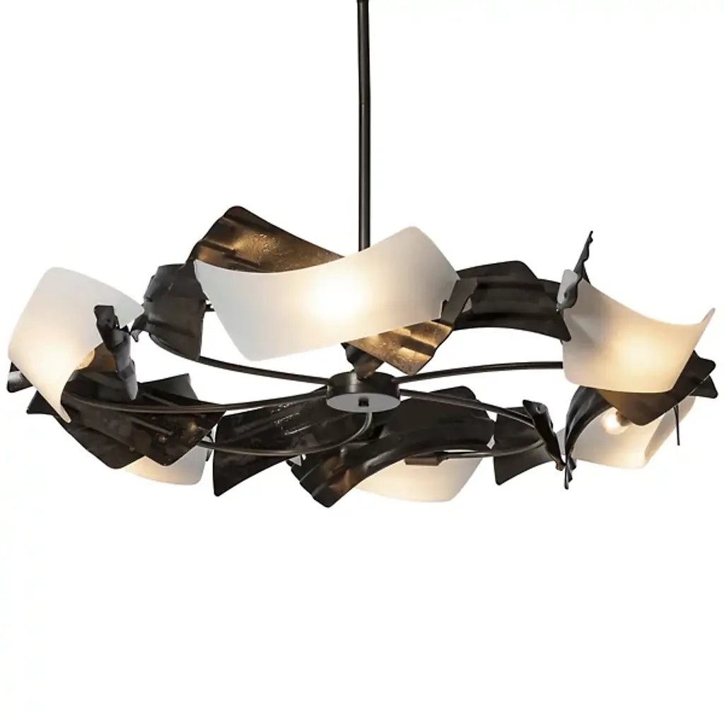 The Metalo Misto Semi-Flushmount from George Kovacs breaks conventional ceiling lighting boundaries with its fluid steel panels that appear to float mid-motion. The ceiling-hugging design maintains a substantial presence without overwhelming overhead space. Multiple curved segments overlap and intersect, directing light through deliberately placed openings. The dimmable fixture adapts perfectly to sloped ceilings while maintaining its artistic integrity. The light source nestles within the composition, creating an indirect glow that enhances the natural movement suggested by the curving metal forms.