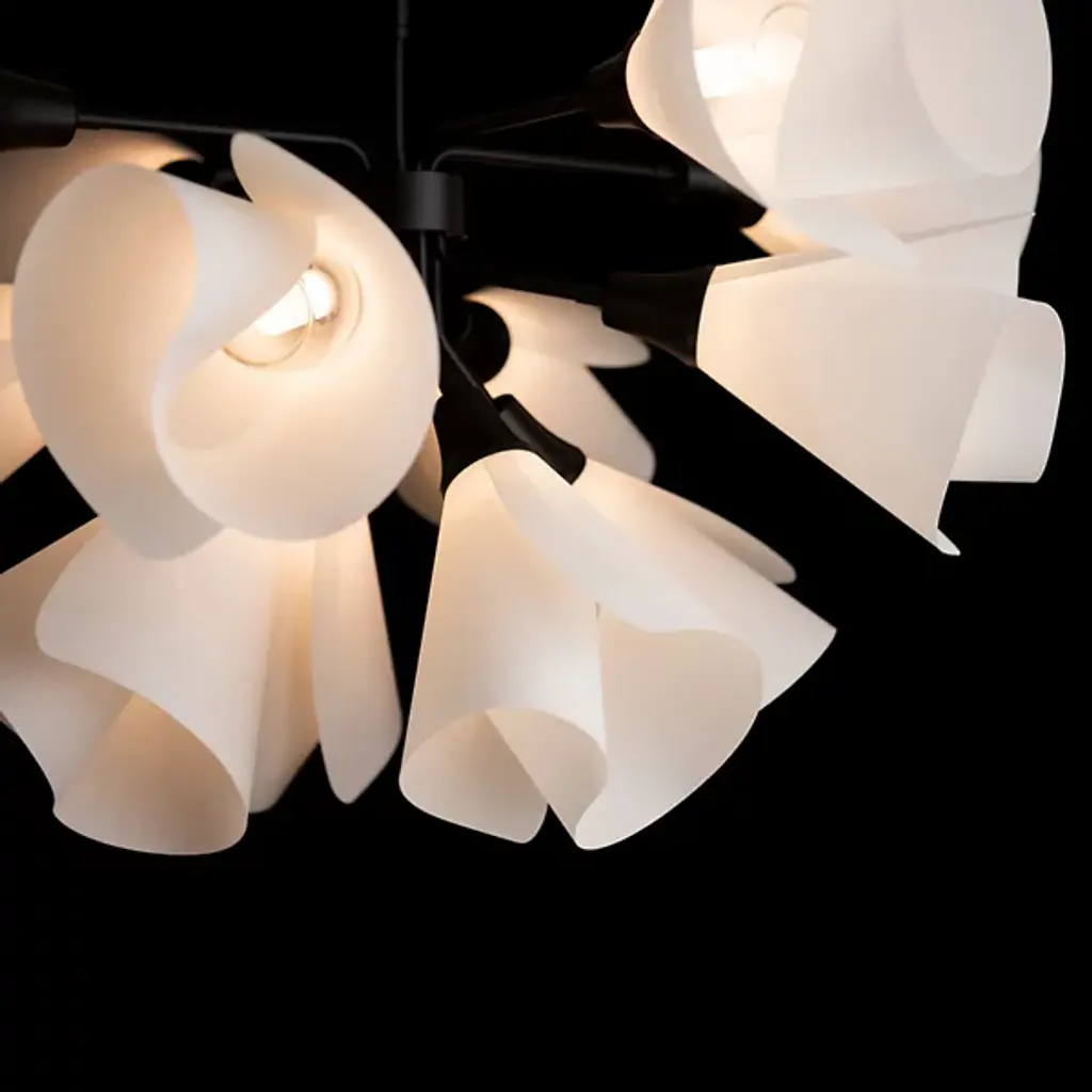 A beautiful silhouette perfect for a range of styles in your home. The Mobius Semi-Flushmount from Hubbardton Forge brings a delicate demonstration of lighting design to the comfort of your favorite spaces. Mounting to the ceiling, this piece starts with a brief downrod that leads to a central disc that extends several matching arms, all made of smooth metal. Each arm ends with a spun-frost paper shade that resembles a floral blossom complete with a single bulb at the center. The light is bright and even, bringing the flowers to life.