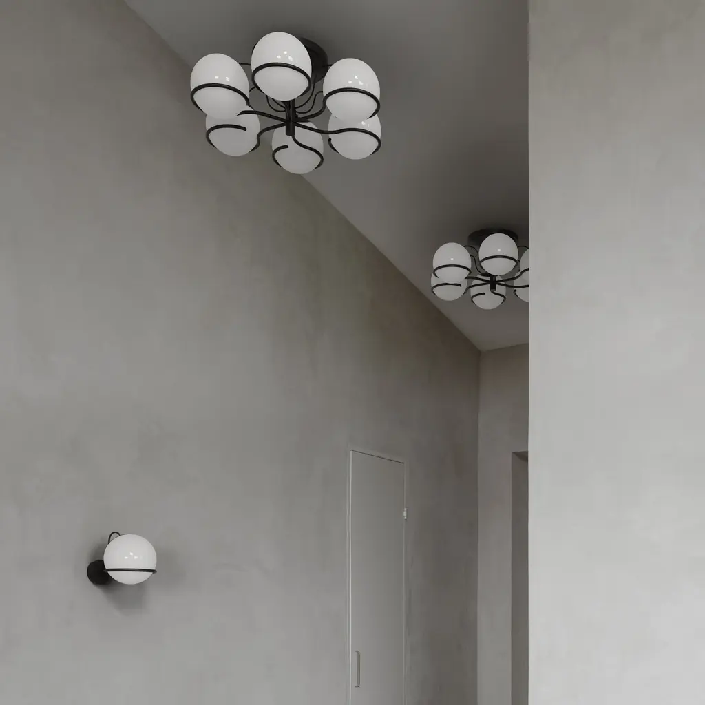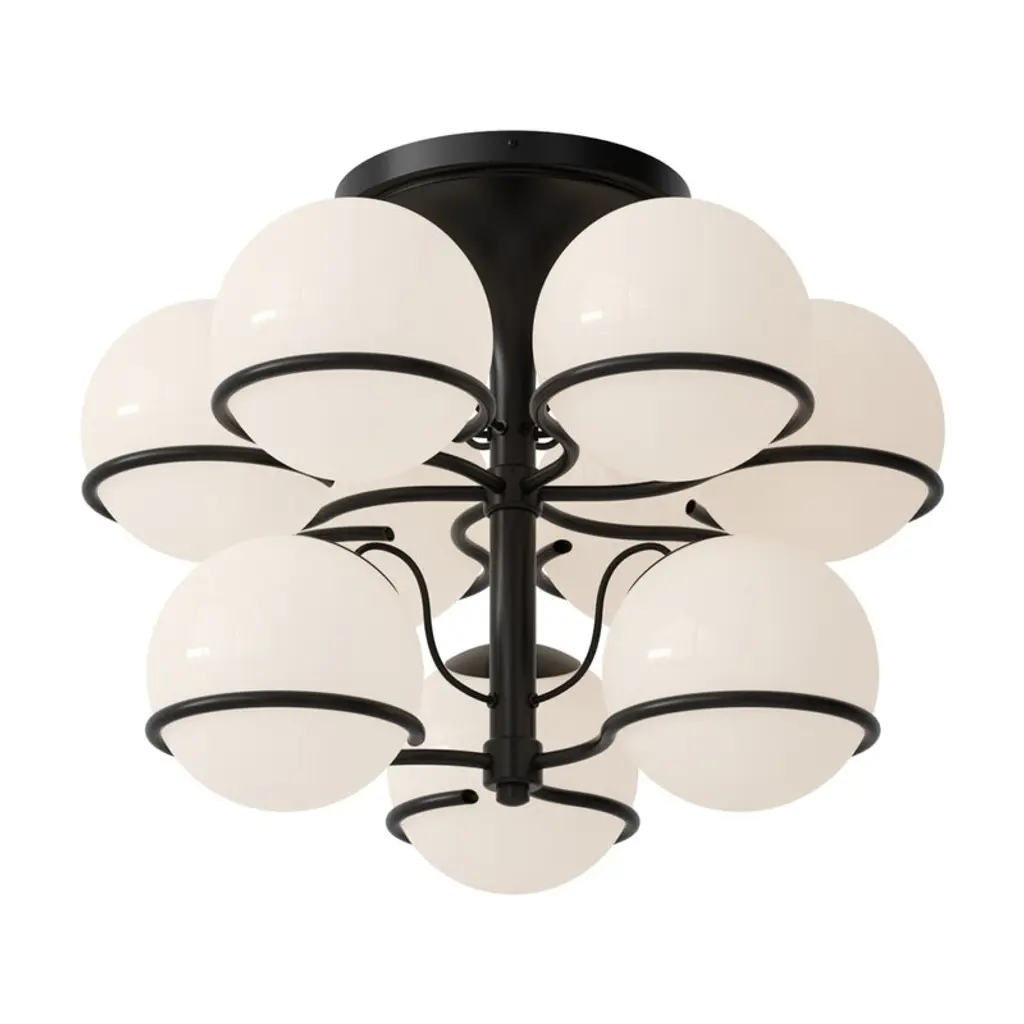 Elevate your space with the Model 2042 Semi Flush Mount from Astep. Created by renowned designer Gino Sarfatti in 1963, this stunning ceiling light boasts three opaline glass spheres, each 20 cm in diameter. The sleek painted steel mount and Black or Champagne finish add a touch of refined elegance, while the gentle embrace of the spheres creates a dynamic and sophisticated aesthetic. Highlights