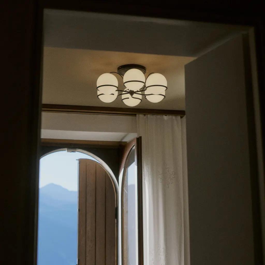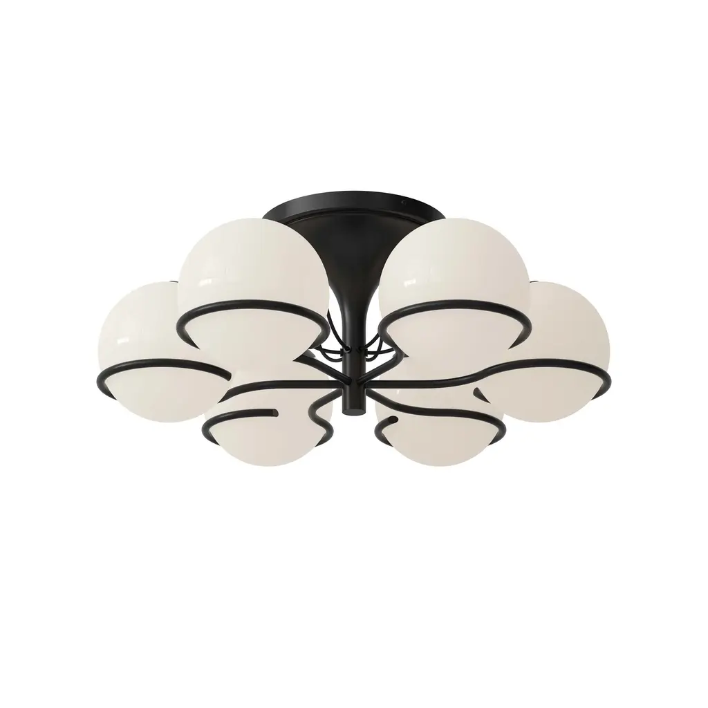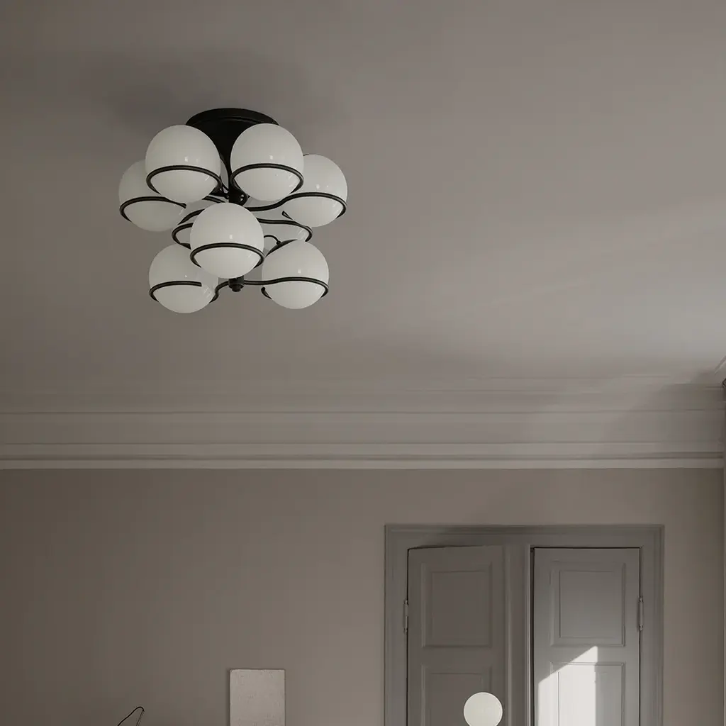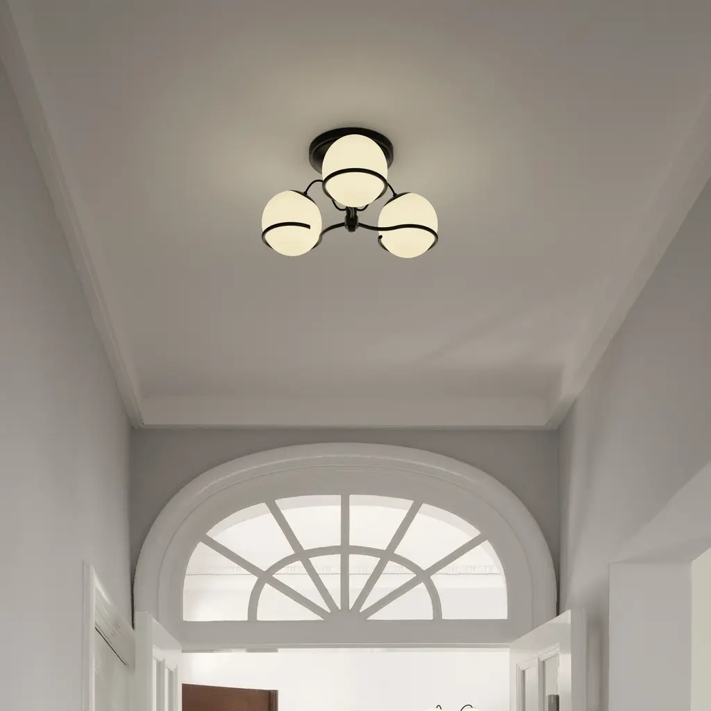 Elevate your space with the Model 2042 Semi Flush Mount from Astep. Created by renowned designer Gino Sarfatti in 1963, this stunning ceiling light boasts three opaline glass spheres, each 20 cm in diameter. The sleek painted steel mount and Black or Champagne finish add a touch of refined elegance, while the gentle embrace of the spheres creates a dynamic and sophisticated aesthetic. Highlights