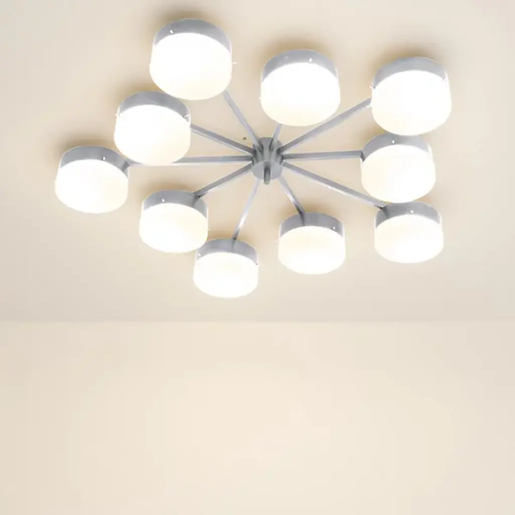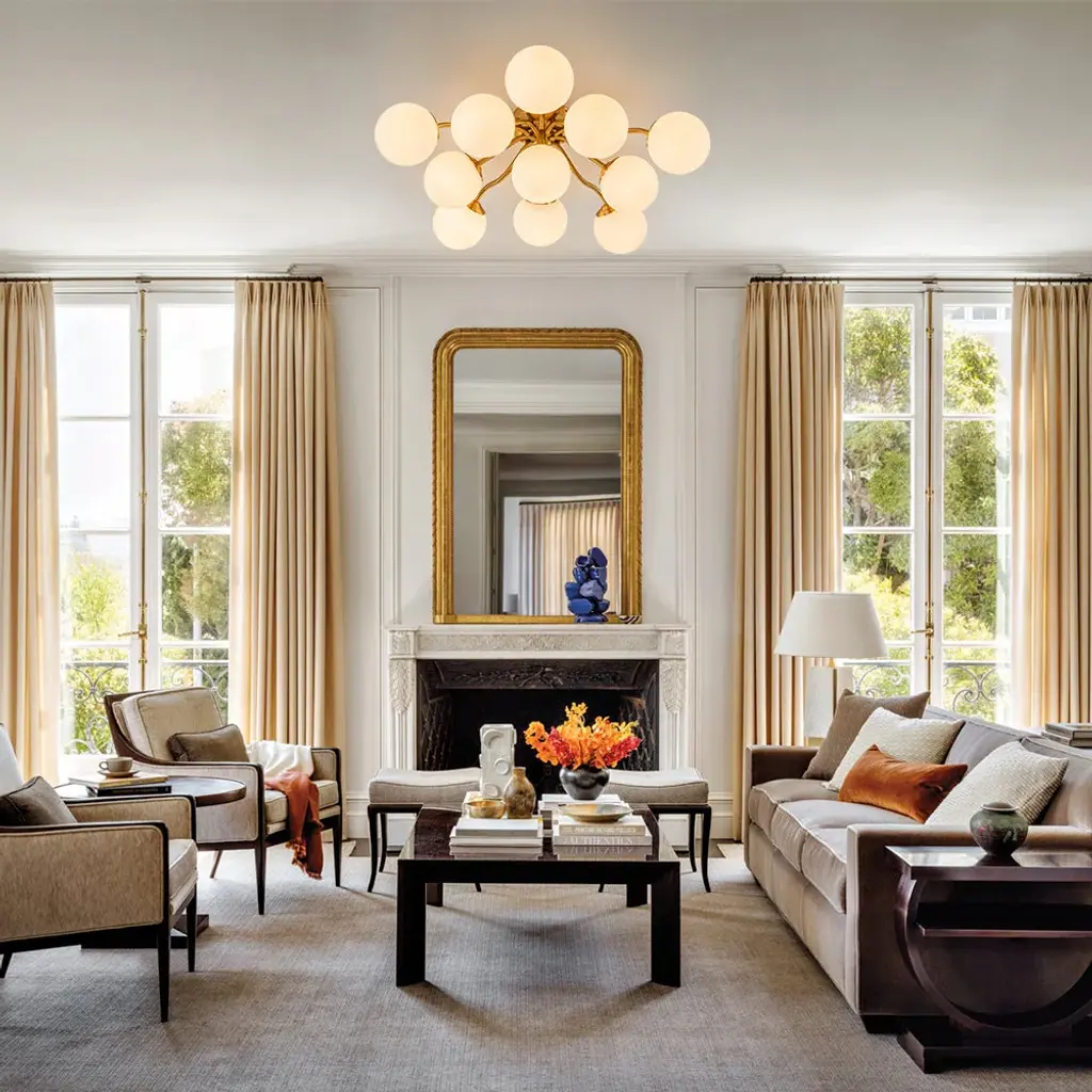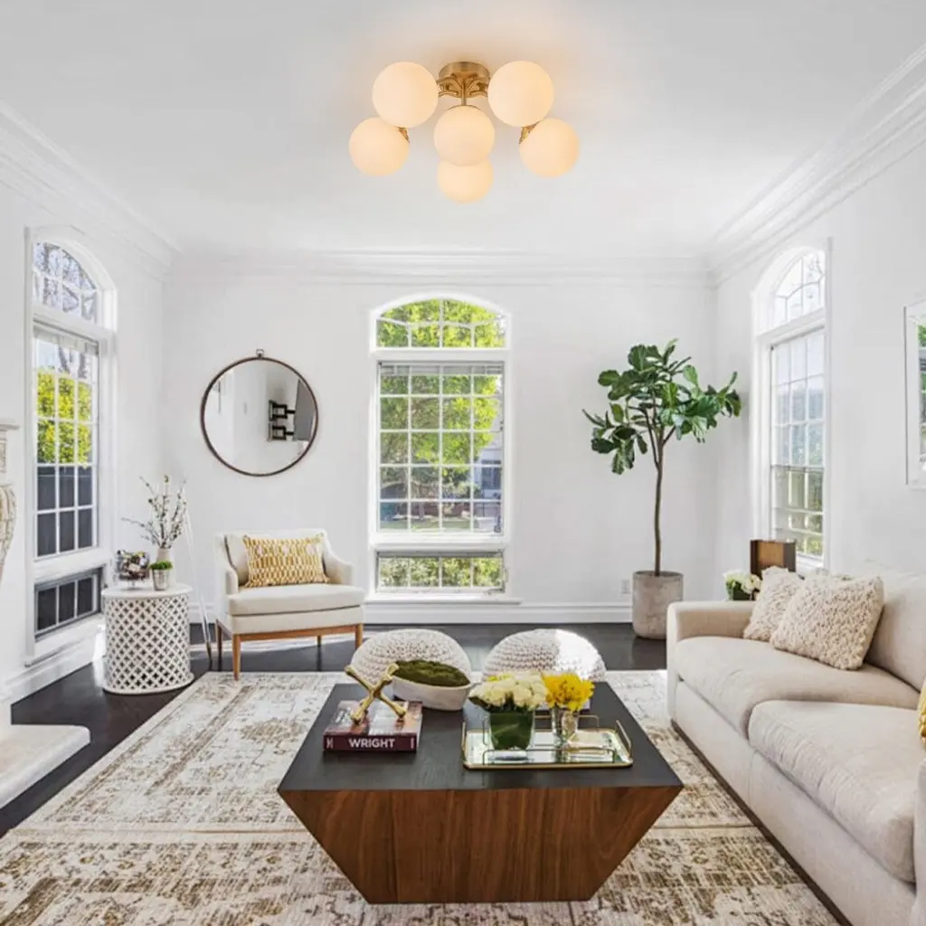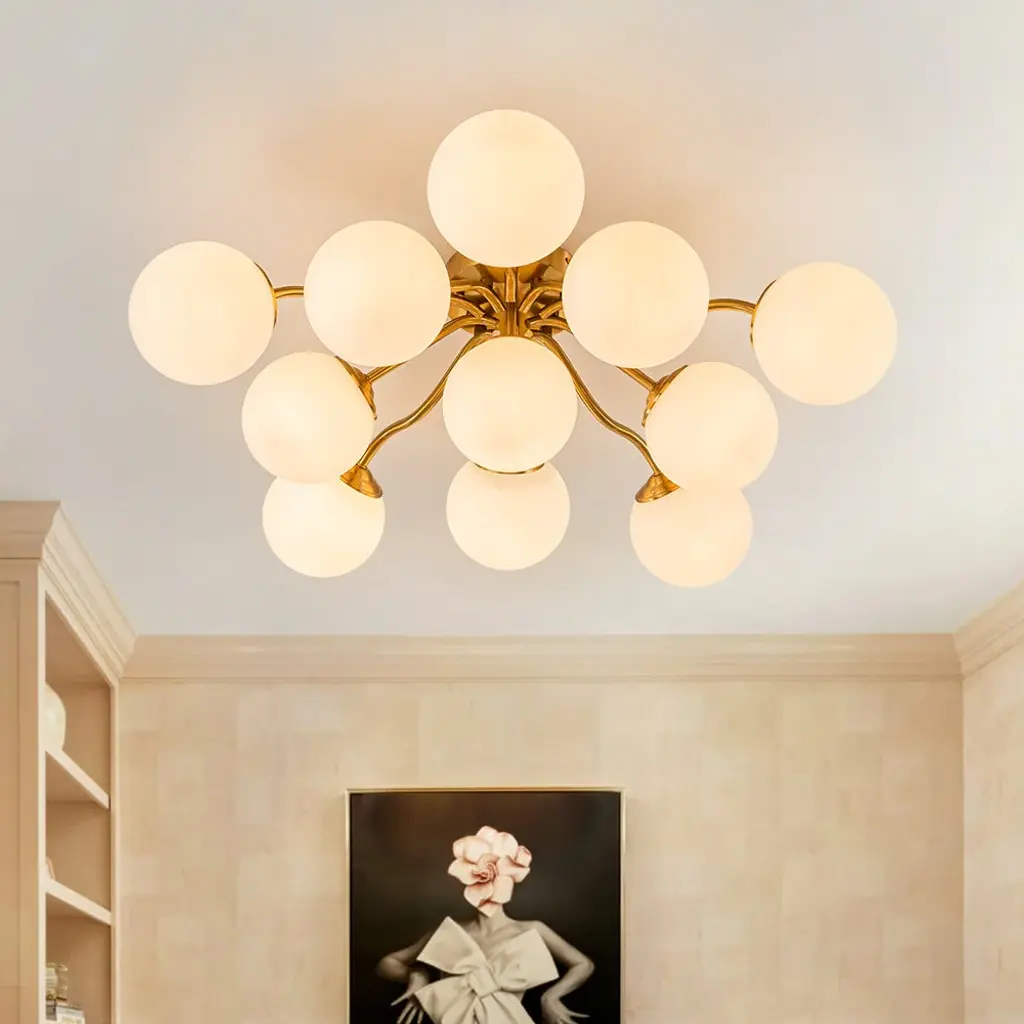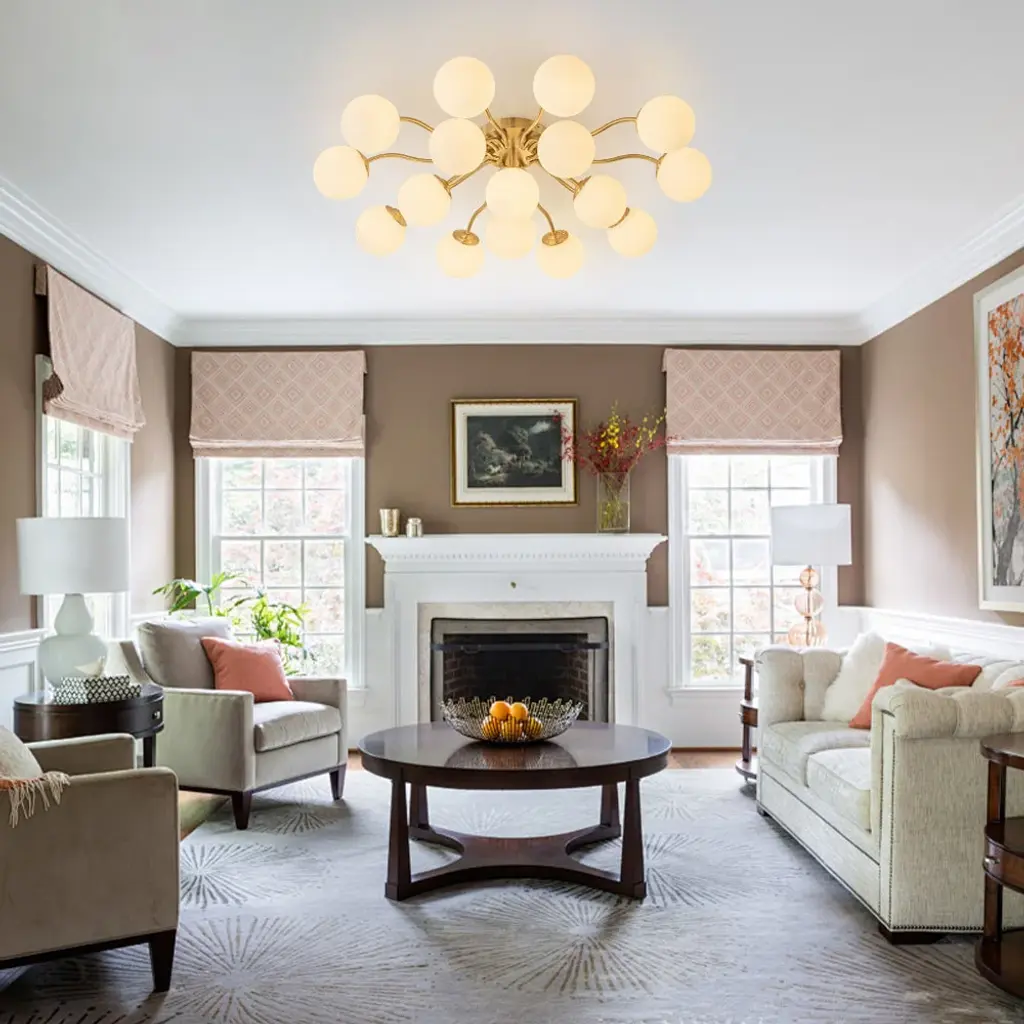 With exquisite craftsmanship, our brass frosted glass globe wavy arm sputnik semi-flush mount ceiling light illuminates your space without effort! It blends mid-century modern aesthetics and contemporary design, perfect for adding a touch of sophistication to any room. The fixture features a central brushed brass canopy that supports multiple wavy arms, each gracefully extending in a different direction like a celestial starburst. Adorning these arms are frosted glass globes that diffuse light softly, casting a warm, ambient glow throughout your living area. The semi-flush mount design ensures it's suitable for both low and high ceilings, making it an ideal choice for living rooms, dining rooms, hallways, entrances, nursery rooms or bedrooms. Features:Dimensions:6-Light11-Light 16-Light