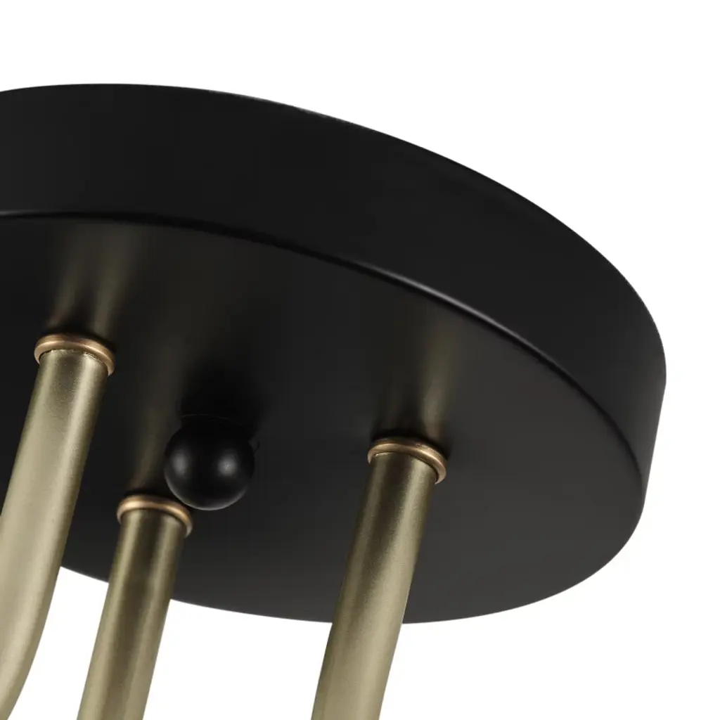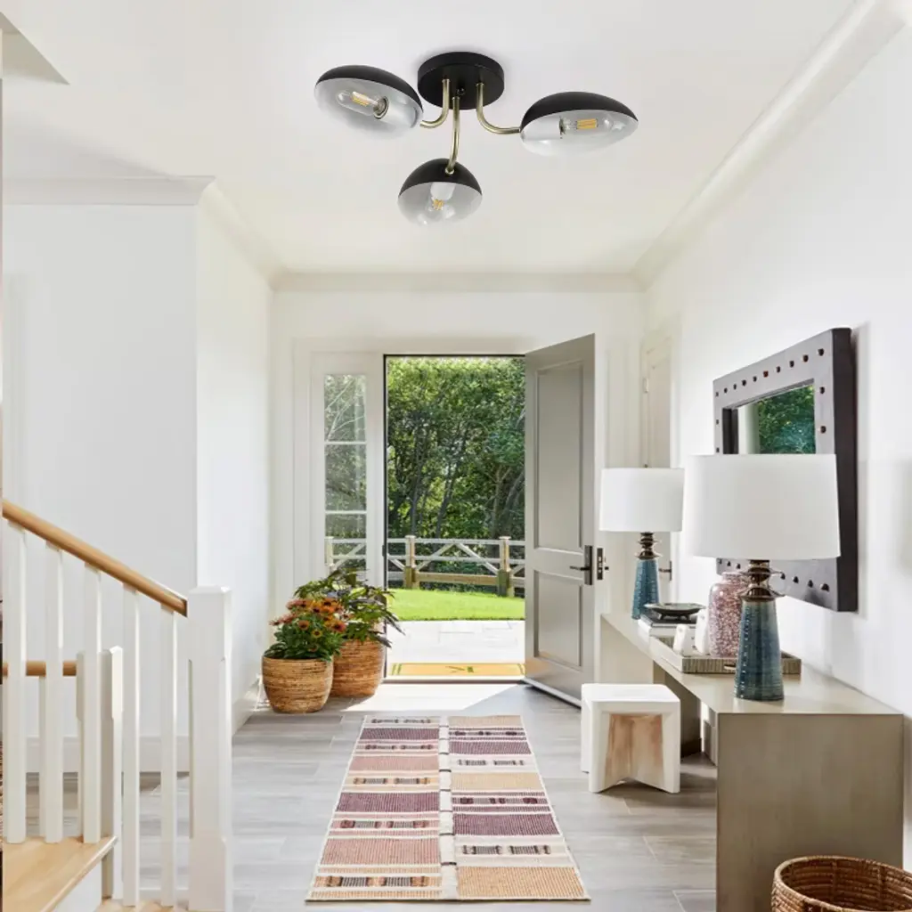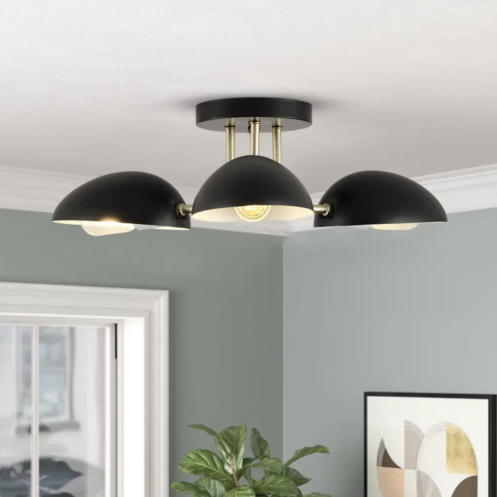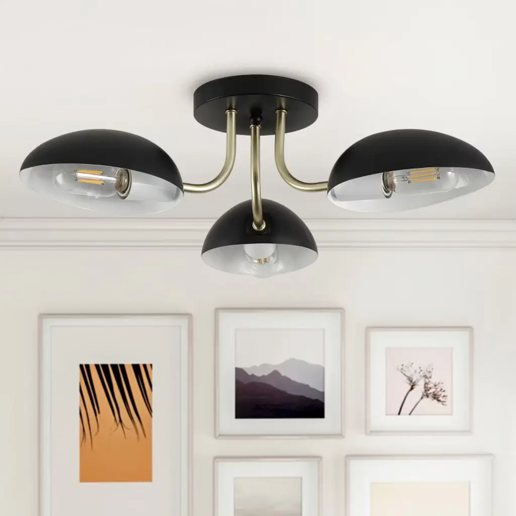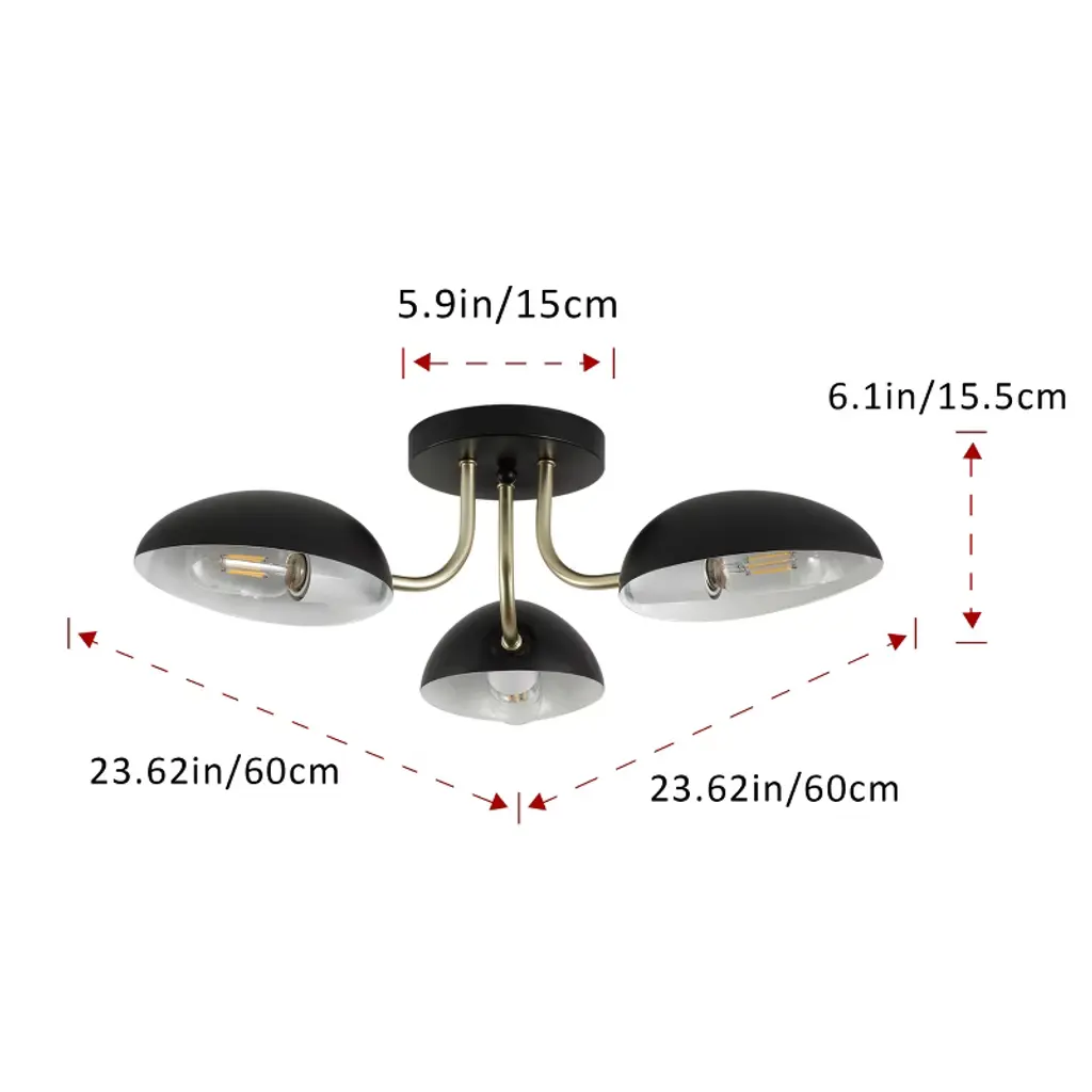 Elevate your interior with the timeless elegance of this 3-light black and gold semi flush mount ceiling light. Designed with a blend of modern and industrial aesthetics, this fixture features a matte black iron body with soft gold arms and dome-shaped metal shades¡ªblack on the outside, white inside for enhanced brightness. It¡¯s perfect for dining rooms, kitchens, entryways, and hallways where style meets functionality. Compatible with E26 base bulbs up to 60W and ETL listed for safety, this light fixture is both practical and reliable. The compact flush mount design is perfect for rooms with lower ceilings, while the triple-light structure ensures ample illumination. Whether you're updating a contemporary home or adding flair to a transitional space, this versatile ceiling light is sure to impress.