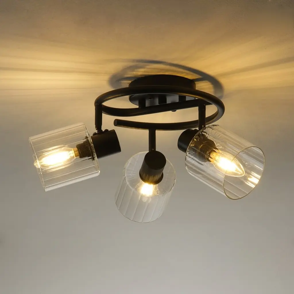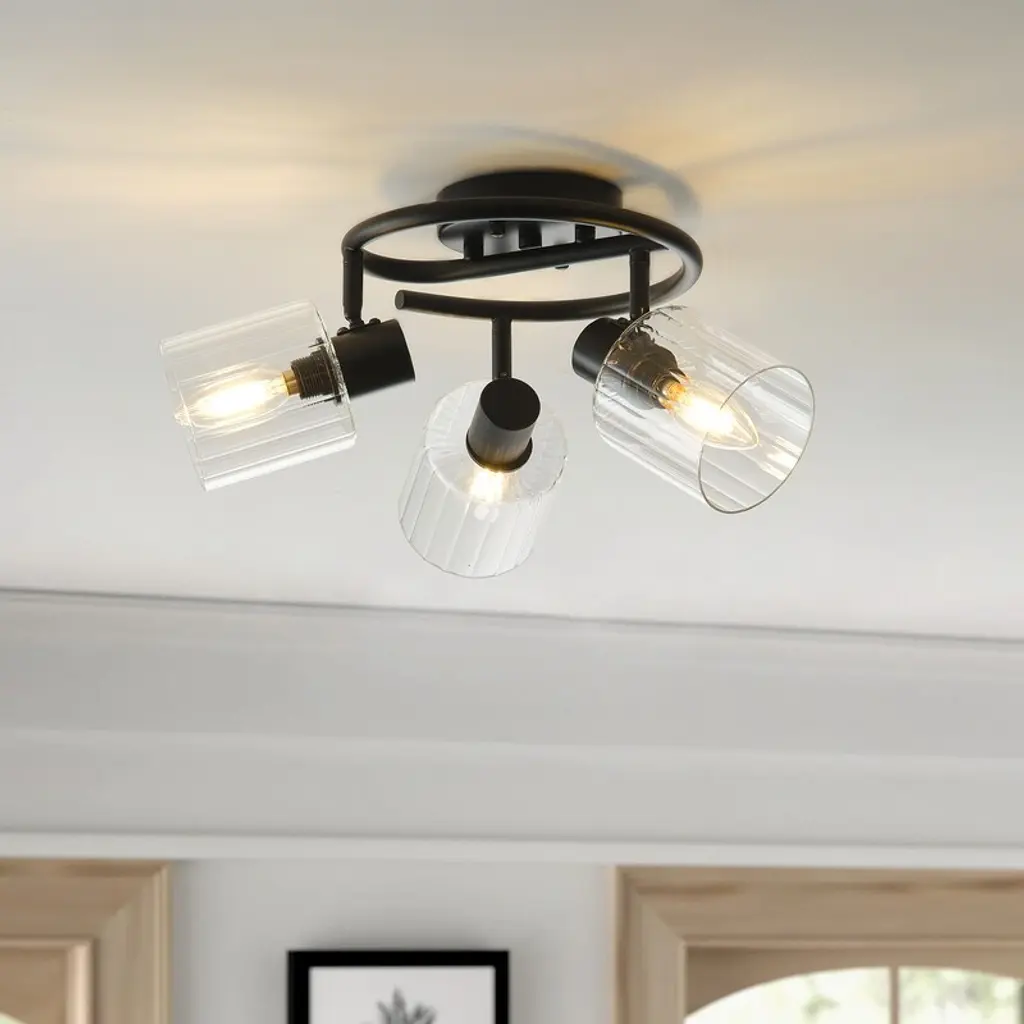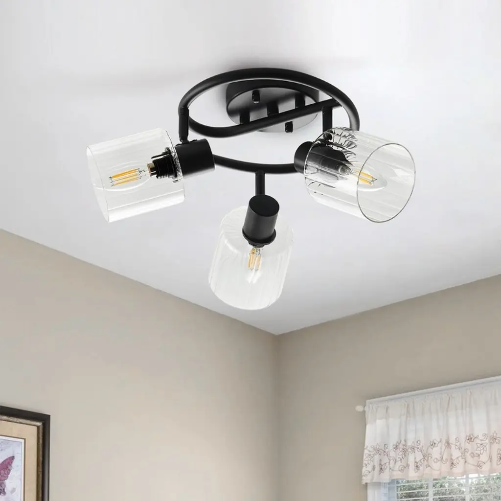 Specifications: Sleek Modern Design: Combines a matte black frame with clear glass shades for a clean, modern aesthetic that suits various interior styles.Transparent Ribbed Glass shades lamp head features a clear ribbed glass shade that adds texture and allows for full light dispersion.Easy to Assemble: Don't worry about the installation difficulty. It can be mounted facing up or down to suit your space and lighting needs.ETL Listed & Bulb Requirement: ETL Listed for your safety. The light is a built-in standard E12 socket, suggesting using a dimmable E12*3 base bulb (Max 40W, 120V). Bulbs and a dimmer switch are not included.Widely Used: Designed to sit close to the ceiling, perfect for highlighting art, kitchen spaces, or work areas.
