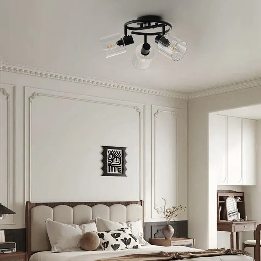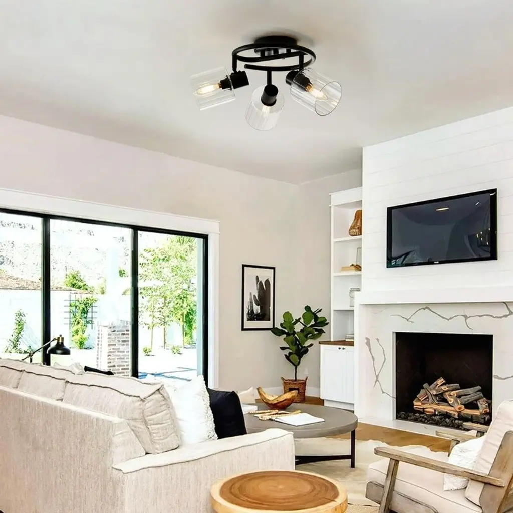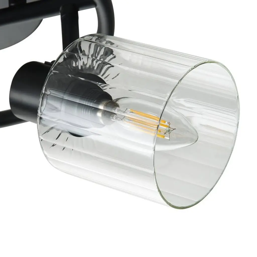 Specifications: Sleek Modern Design: Combines a matte black frame with clear glass shades for a clean, modern aesthetic that suits various interior styles.Transparent Ribbed Glass shades lamp head features a clear ribbed glass shade that adds texture and allows for full light dispersion.Easy to Assemble: Don't worry about the installation difficulty. It can be mounted facing up or down to suit your space and lighting needs.ETL Listed & Bulb Requirement: ETL Listed for your safety. The light is a built-in standard E12 socket, suggesting using a dimmable E12*3 base bulb (Max 40W, 120V). Bulbs and a dimmer switch are not included.Widely Used: Designed to sit close to the ceiling, perfect for highlighting art, kitchen spaces, or work areas.