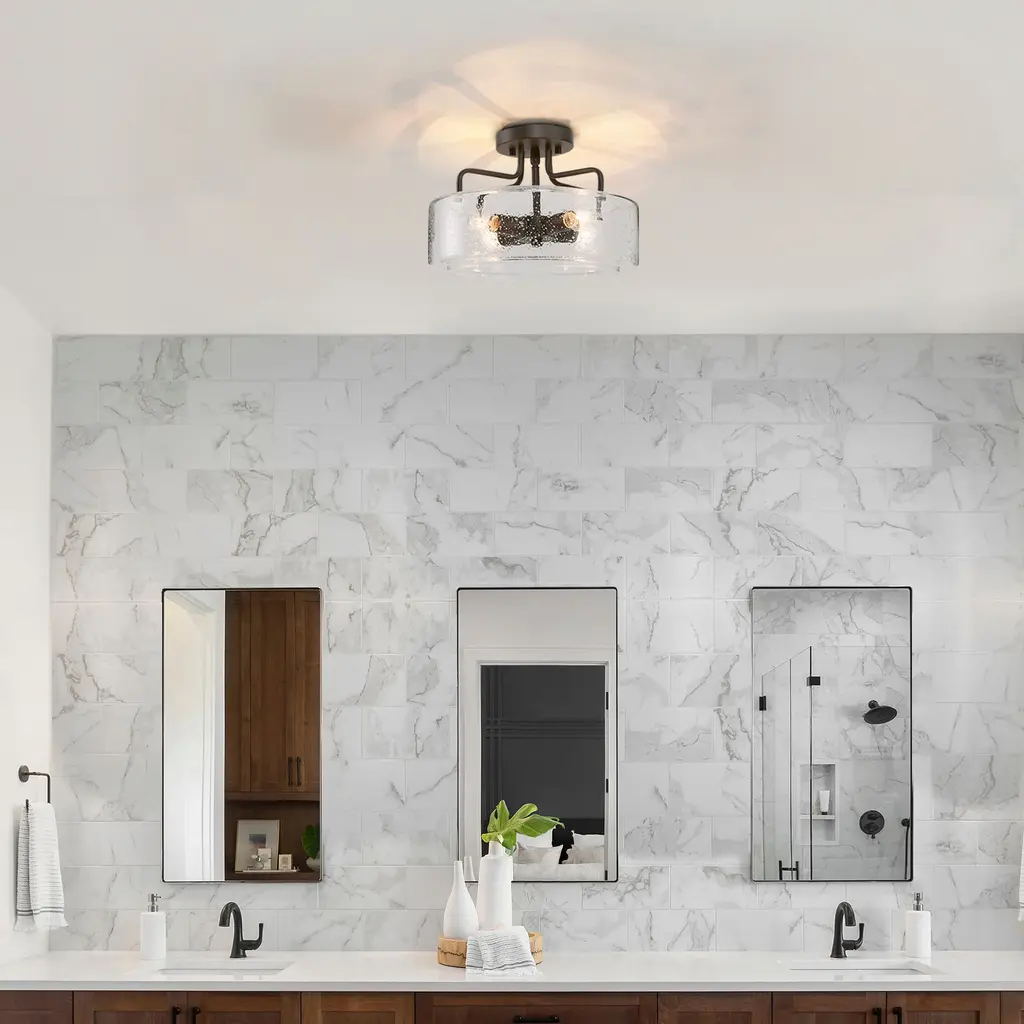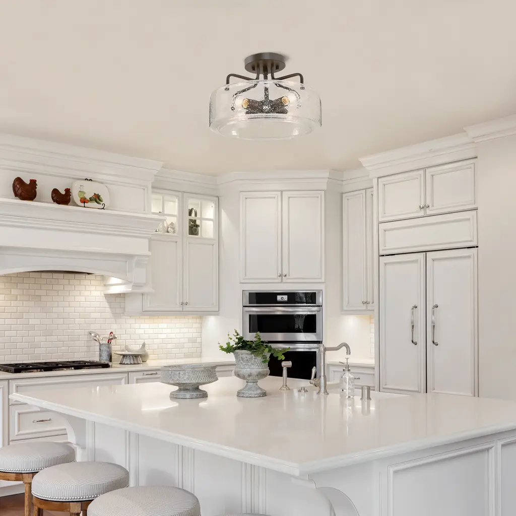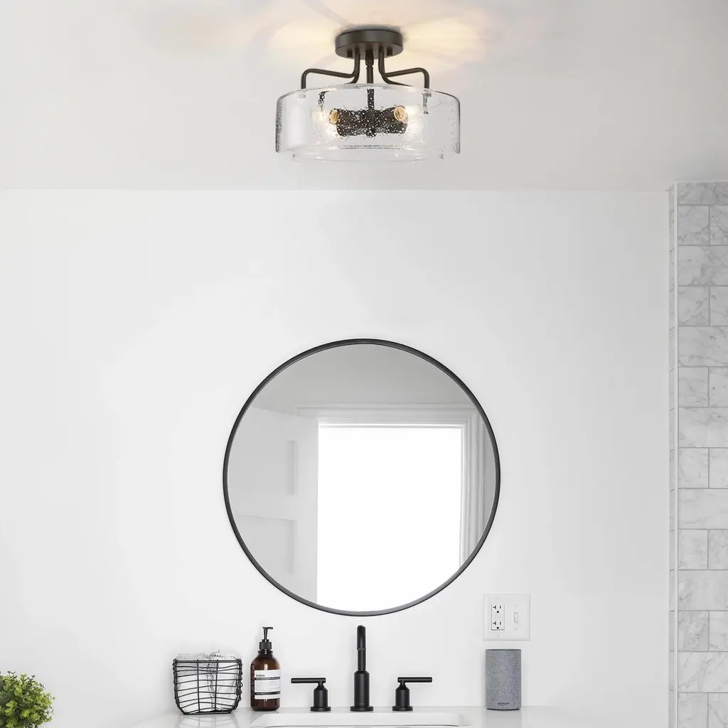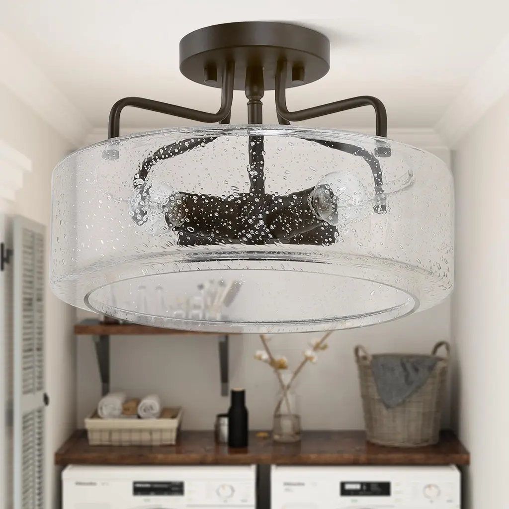 Drawing inspiration from the "Less Is More" concept, this minimal round semi-flush mount light adapts high-end metal and clear rubbled glass to create a farmhouse and retro ambiance. The unique open-bottom design promises enough light to give off impeded while creating a welcoming and warm touch through the reflection of the glass shade. Perfect size for living room, closet, kitchen, bathroom, laundry room, bedroom, bathroom, hallway, or other spaces requiring elegant illumination. Features:Encountering any missing or damadged parts in transit, please contact Overstock Customer Service for free replacement