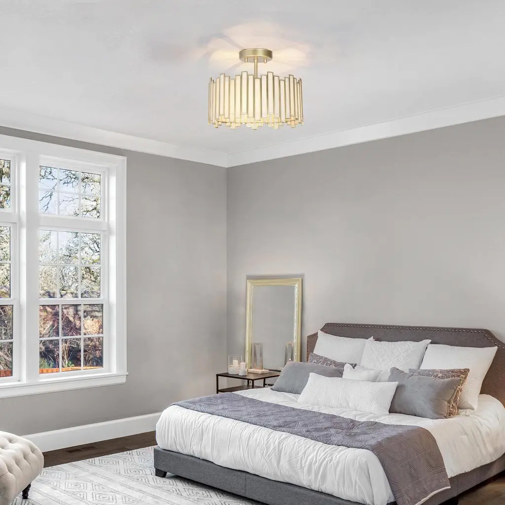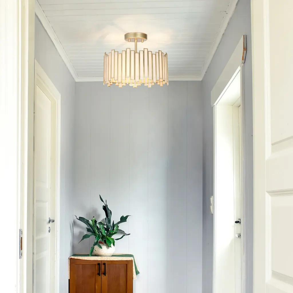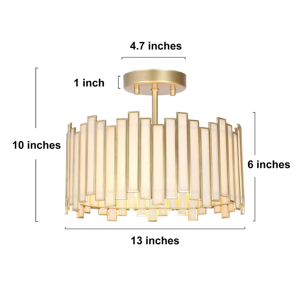 Modern glam semi-flush mount casts enchanting illumination and adds a luxurious touch to your living spaces! Crafted of high-end metal and frosted Tiffany glass, it is of durability and elegance at the same while. The sophisticated irregular silhouette adds much uniqueness to its minimal geometric out-framework, making it of more interest. Hardwired to the ceiling, to give off adequate multi-directional lighting and enhance the understated glam ambiance of your foyer, stairwell, hallways, and bedroom.Specifications:Encountering any missing parts or damage in transit, please contact our after-sales service for free replacement.