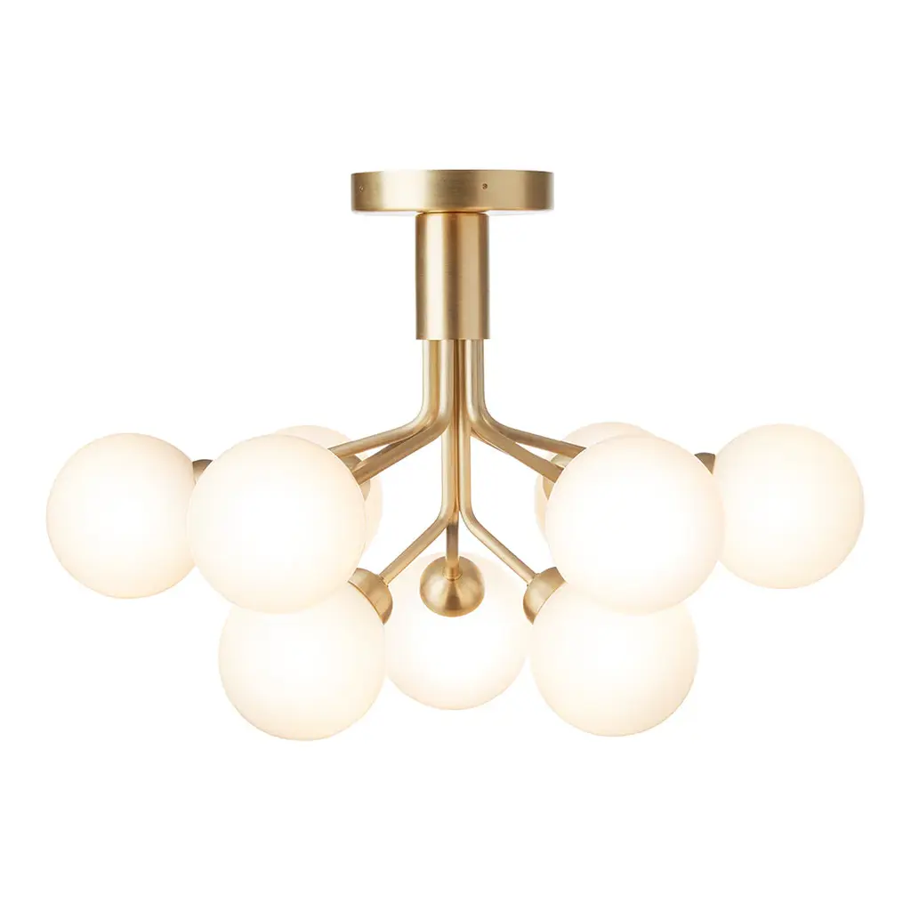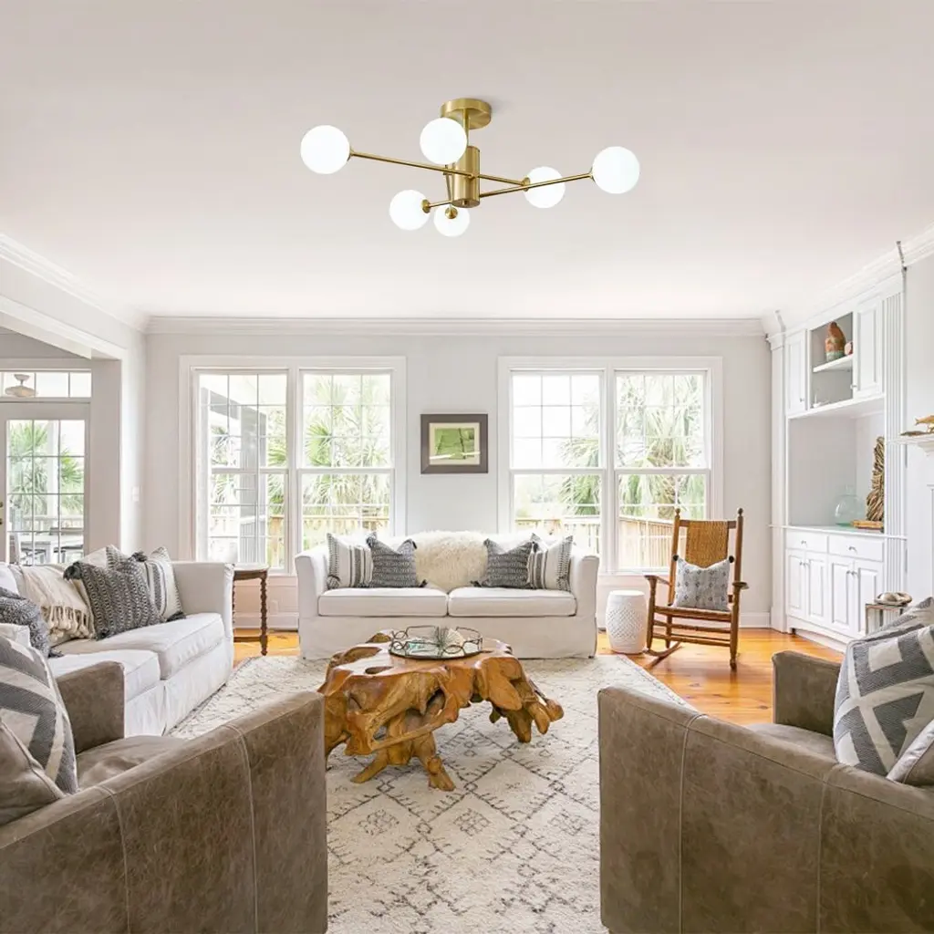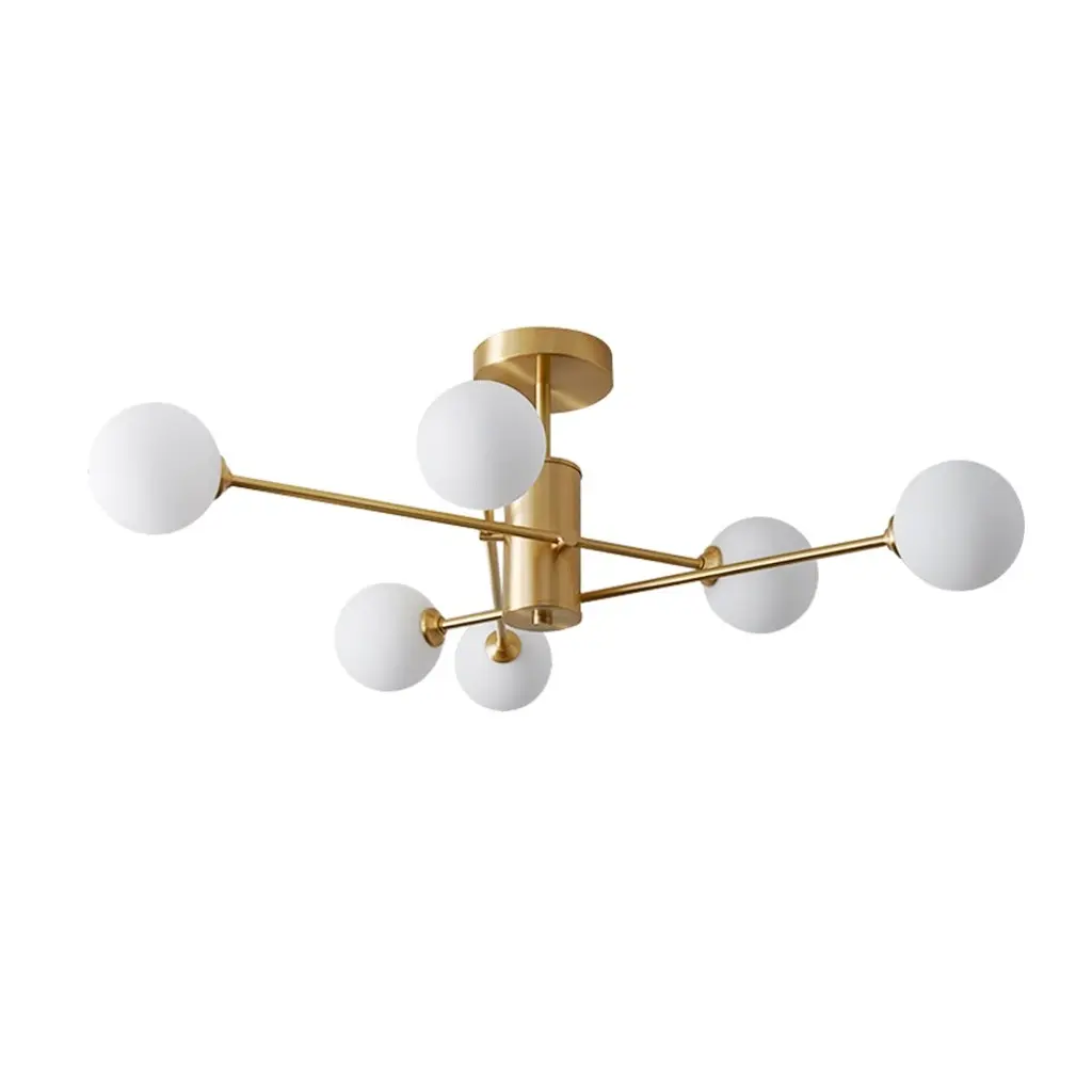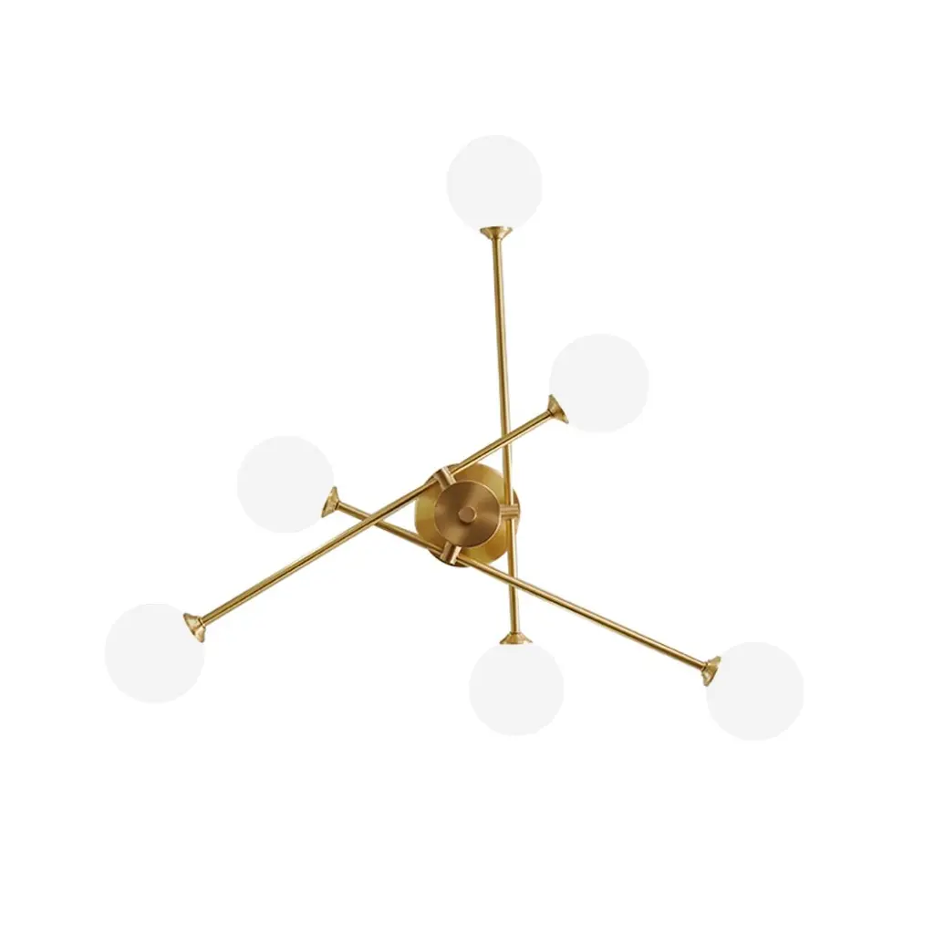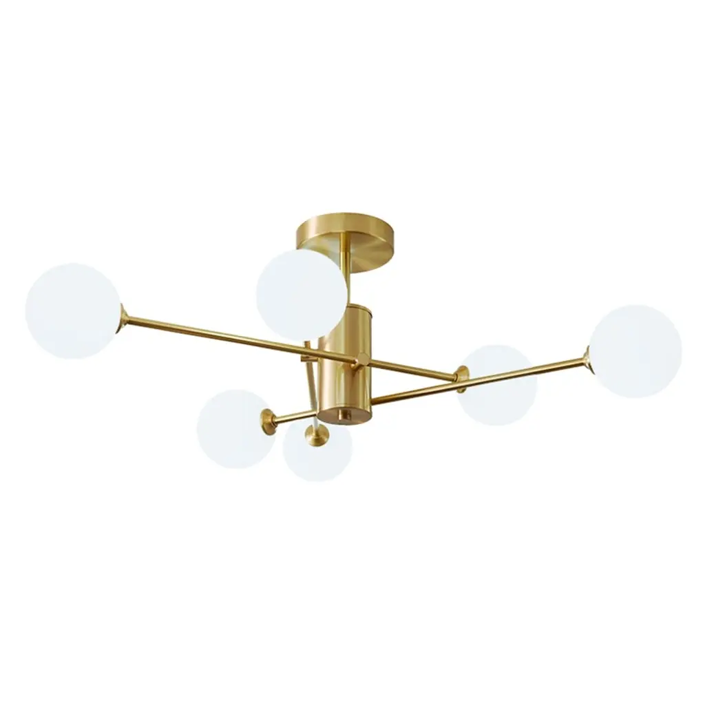 Brings a cosmic touch to spaces with low ceilings, the modern 6-light radial matte glass semi-flush mount blends contemporary design with a timeless Sputnik silhouette. Its six matte glass globes, arranged in a symmetrical, radial formation, create an elegant, soft diffusion of light, perfect for adding a chic glow to any room. The brushed brass finish enhances its sophisticated, mid-century modern appeal, while the semi-flush design ensures a seamless fit in rooms where height is a consideration. Whether gracing your entryway, living room, or dining area, this fixture effortlessly combines style with functionality, offering an eye-catching statement without overwhelming the space. Its radiant presence elevates your décor with a minimalist yet bold design that radiates modern luxury.Features:Dimensions: