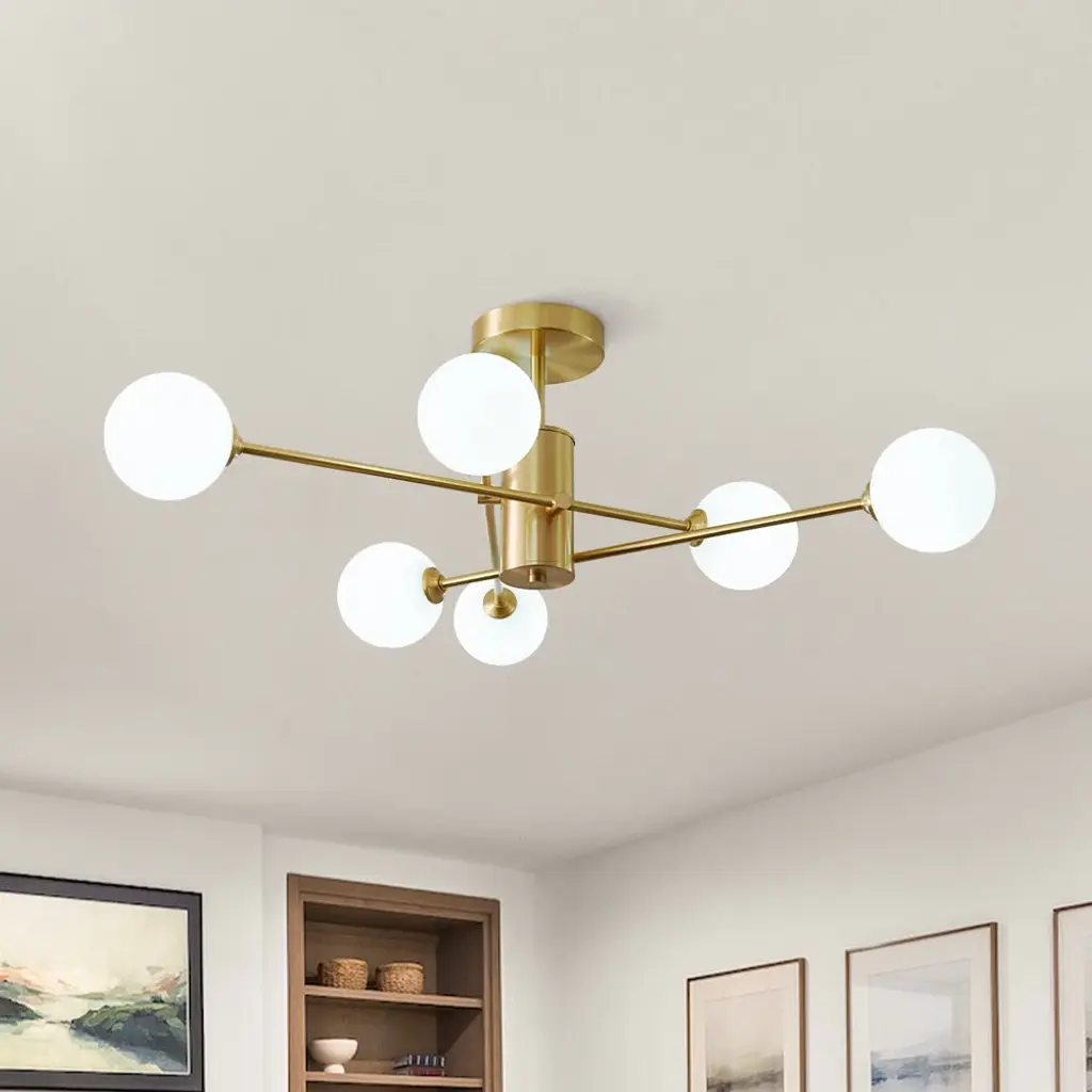 Modern Living Room 6-Light Radial Matte Glass Globe Semi-Flush Mount - N/a - Brass