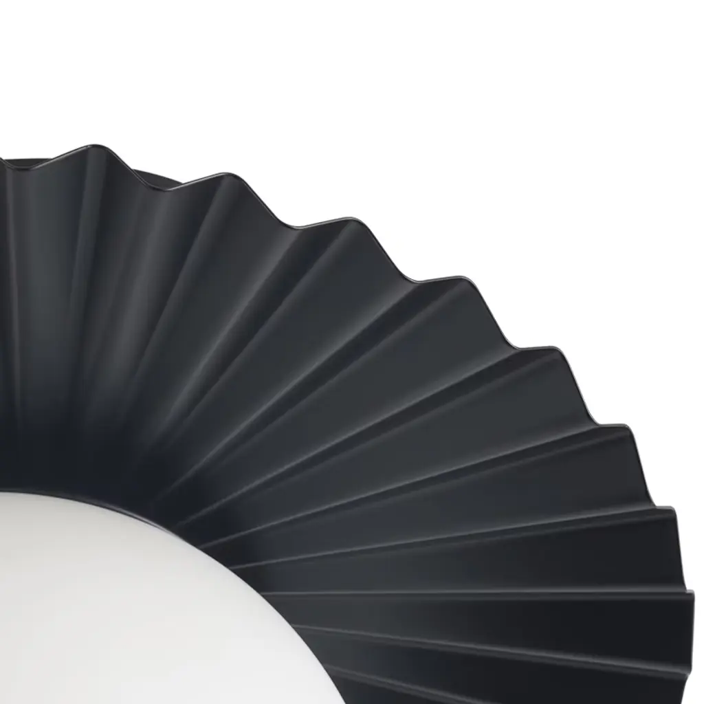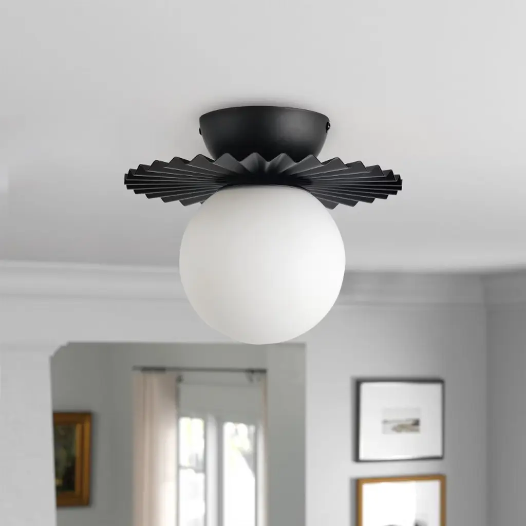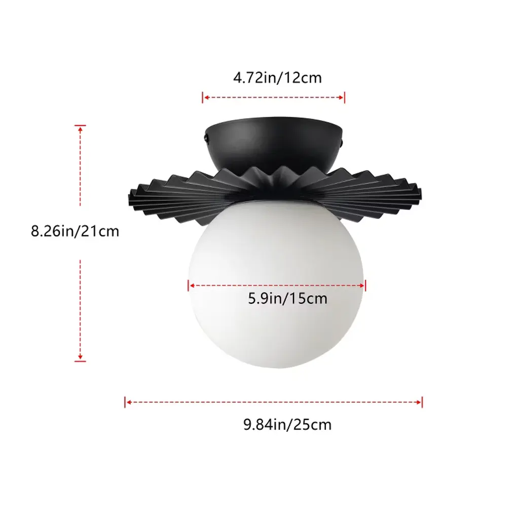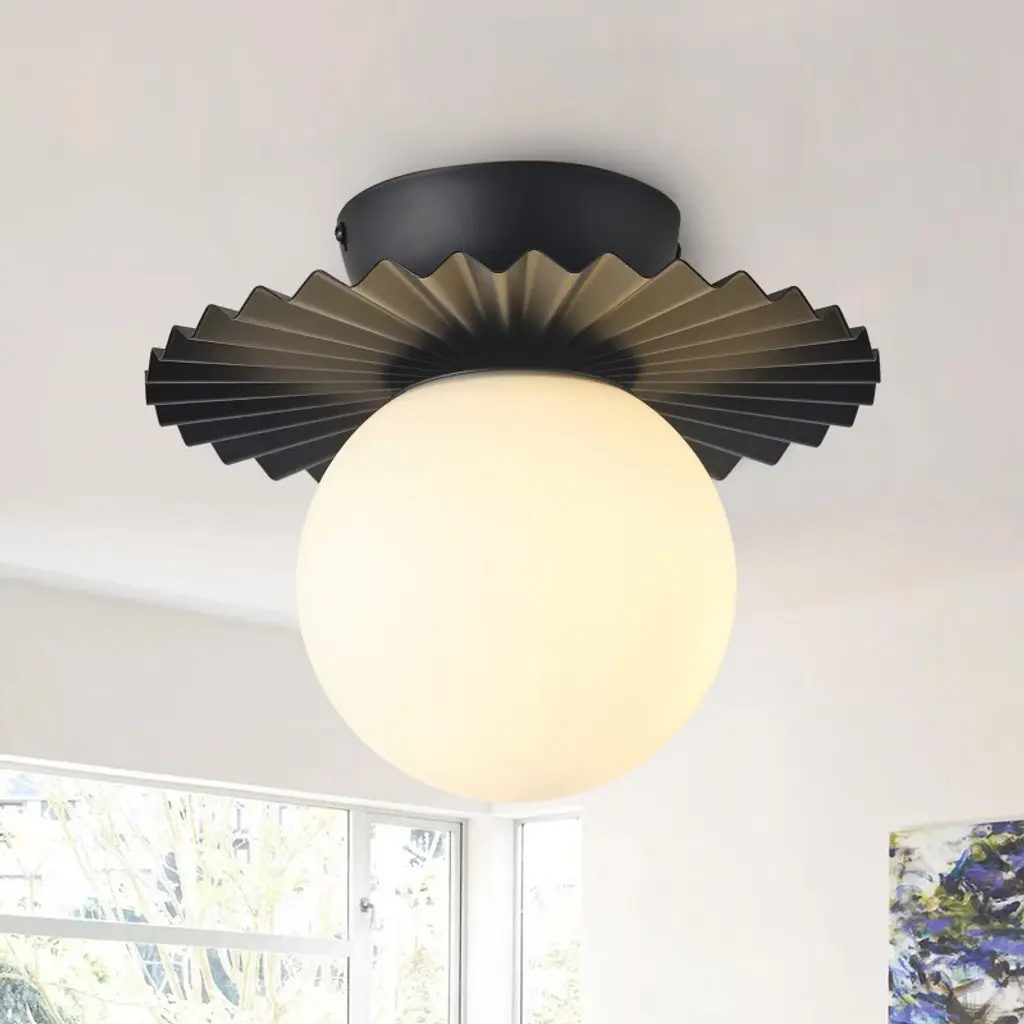 Add a touch of modern artistry to your home with this semi flush mount ceiling light. Featuring a matte black iron frame and an eye-catching pleated fan design, this fixture is paired with a hand-blown frosted glass globe to provide soft, diffused illumination. Compact yet stylish, it’s ETL certified for safety and quality—ideal for entryways, bedrooms, hallways, or living rooms seeking a unique geometric accent.