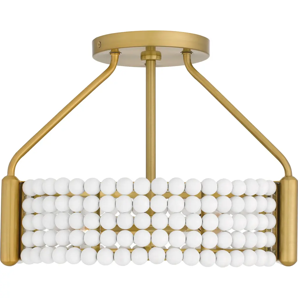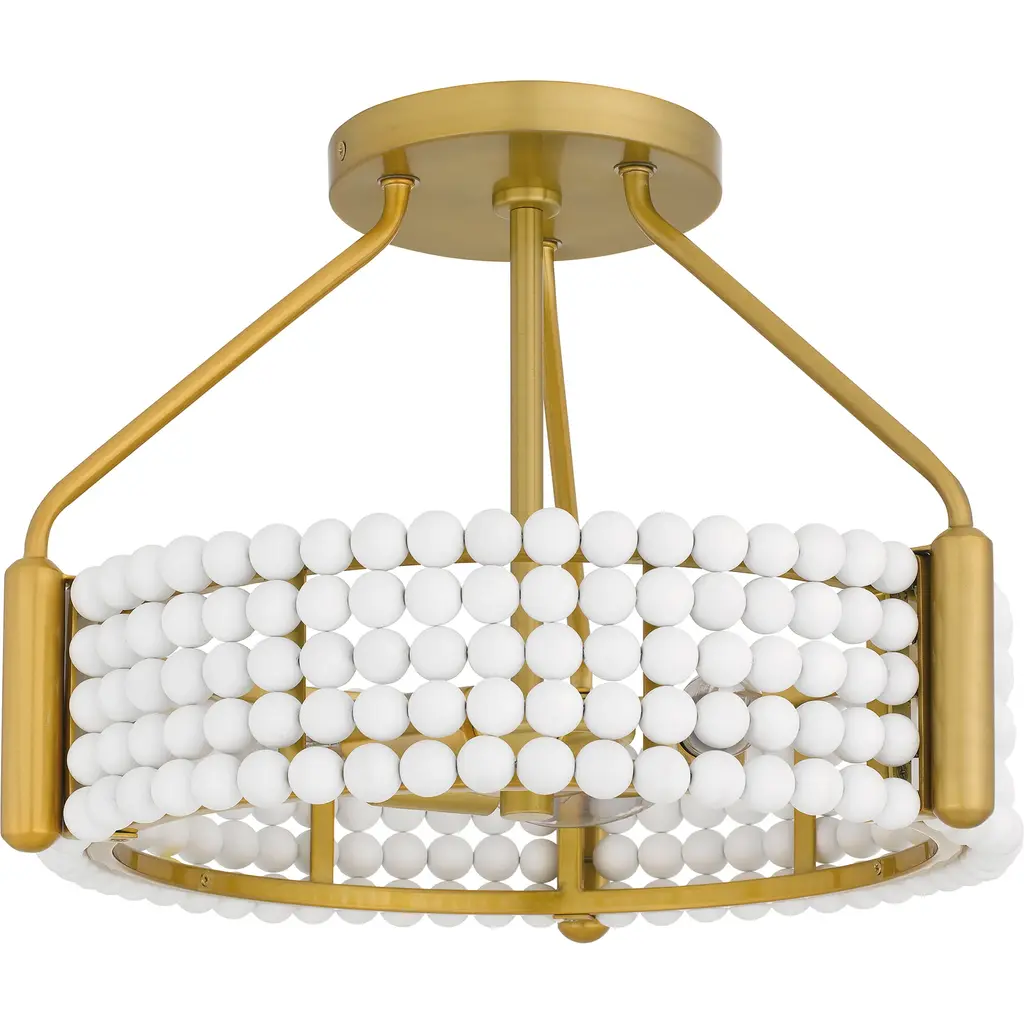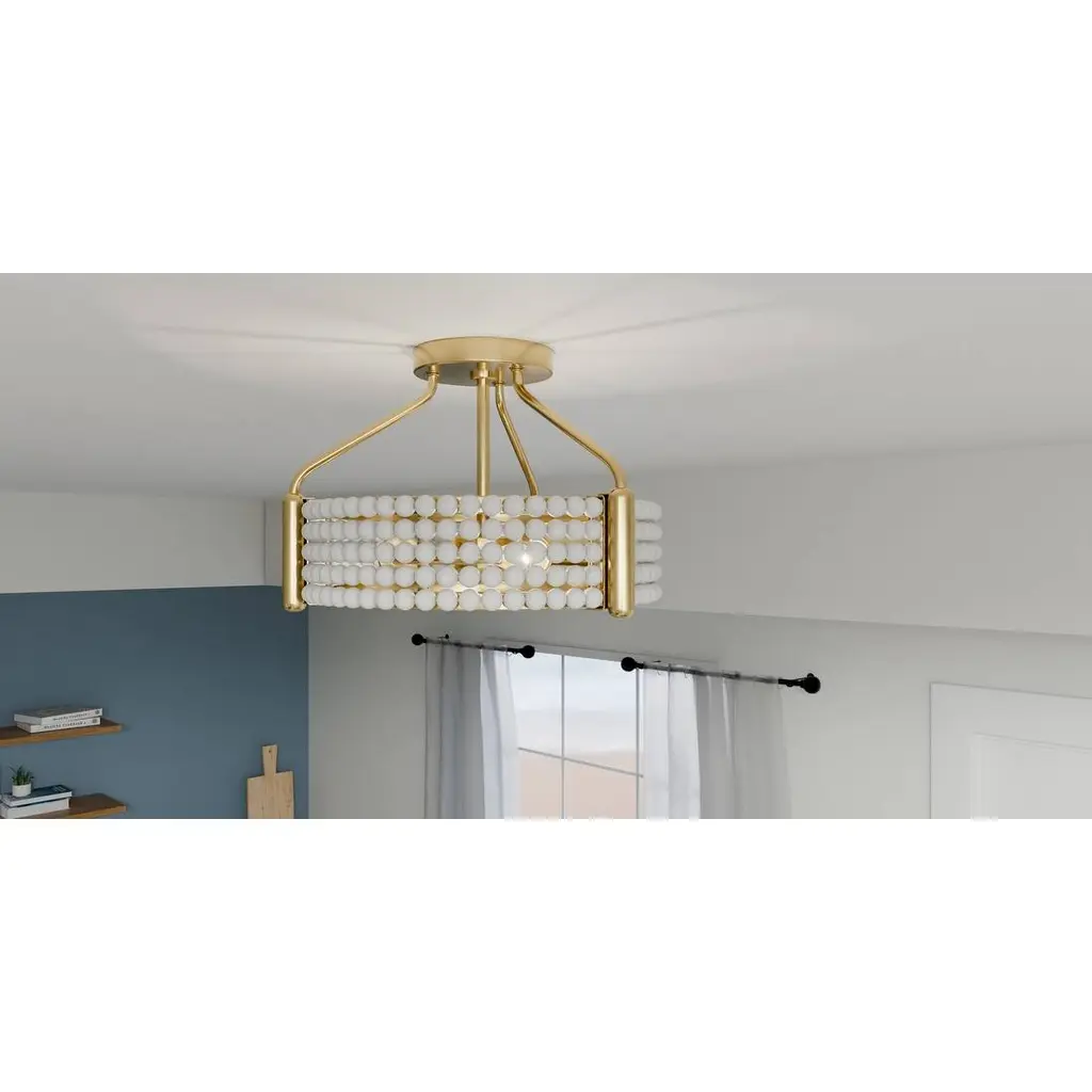 Molly combines a brushed gold finish with matte white beads for a pretty contrast. The white beads form an elevated version of a classic drum shade, adding a touch of coastal style to the simple design. Available as a semi-flush mount or chandelier, Molly adds one-of-a-kind style to any space.
