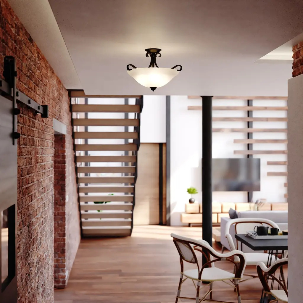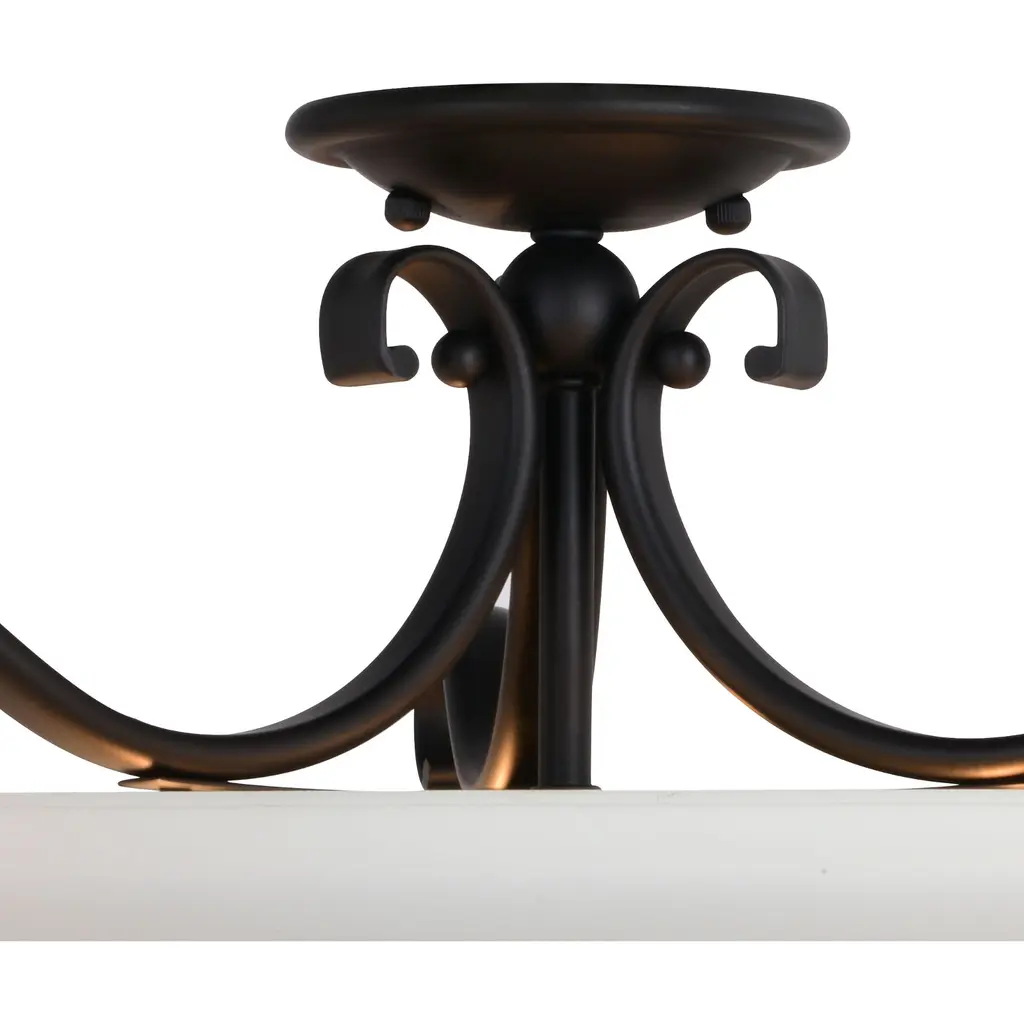 The soft traditional lines of the Monrovia collection allow you to combine styles within your home without compromising on design. The oil rubbed bronze and etched white glass add a certain level of sophistication and elegance that is rare to achieve. Update your look with a hint of class. This fixture is part of a collection with coordinating pieces to decorate any room in the house. This versatile fixture can be installed two ways mount as a semi-flush mount ceiling fixture or use the chain to mount as a pendant.